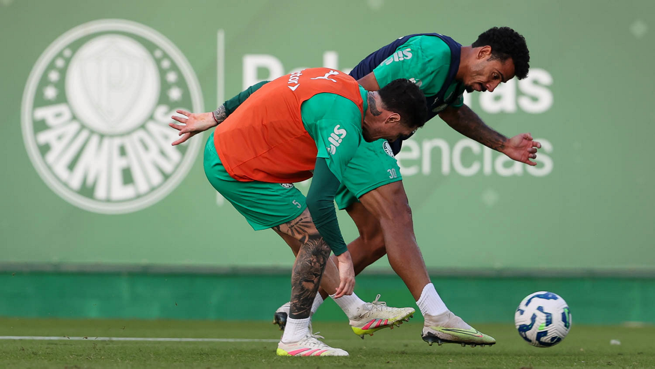 Os jogadores Anibal Moreno e Raphael Veiga (D), da SE Palmeiras, durante treinamento, na Academia de Futebol. (Foto: Cesar Greco/Palmeiras/by Canon)