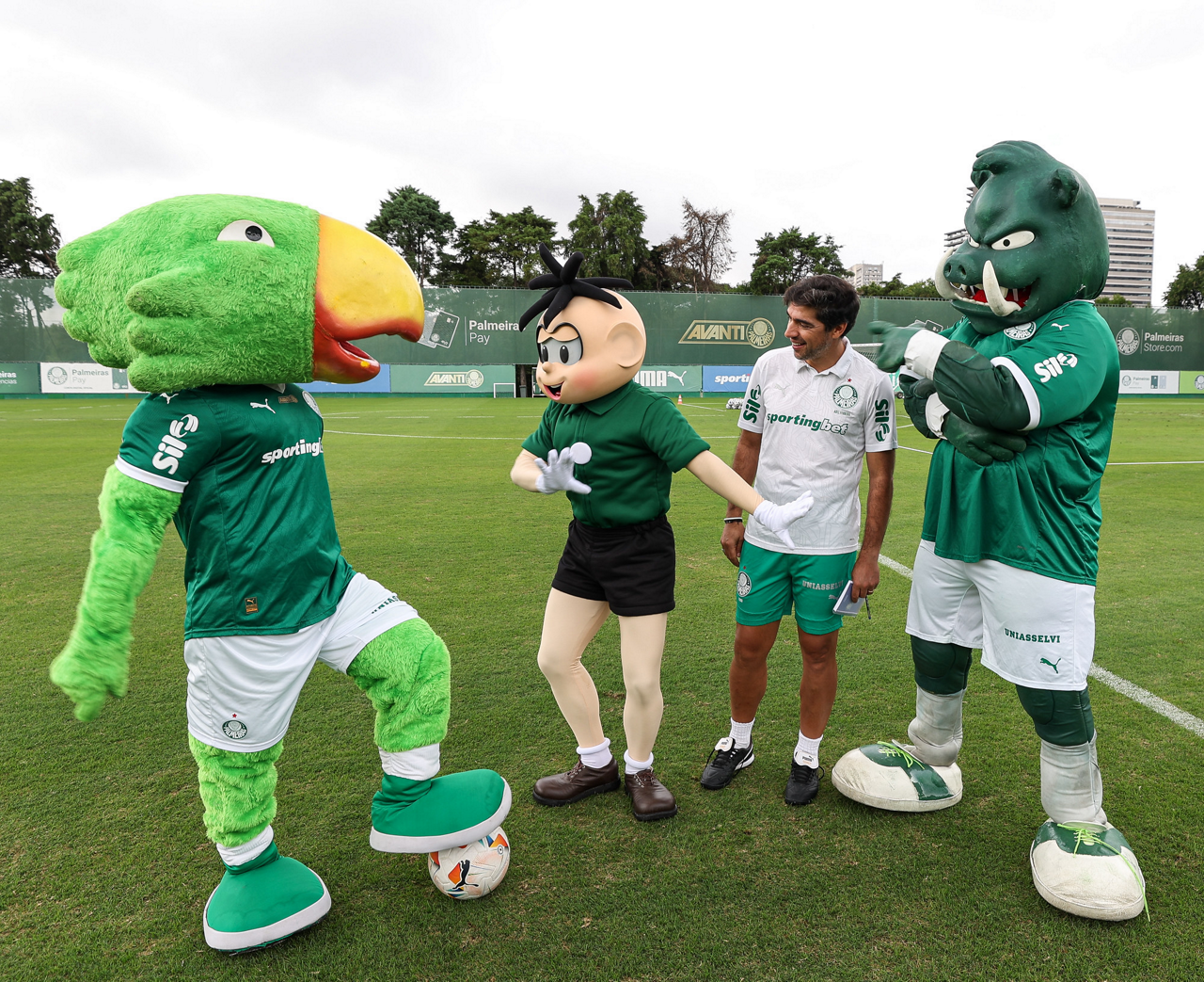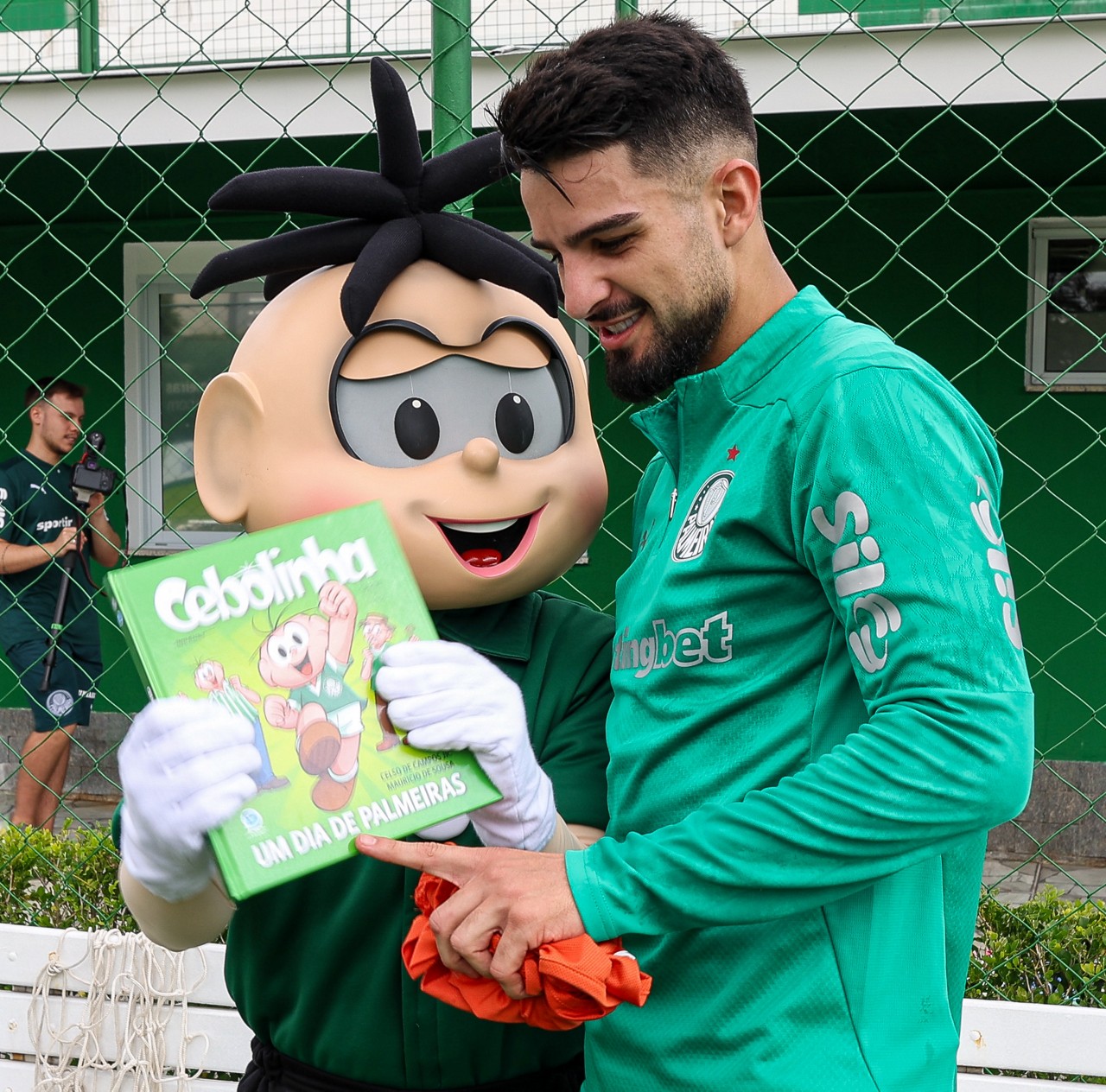 Cebolinha, personagem da Turma da Mônica, visita a Academia de Futebol do Palmeiras, em São Paulo-SP. (Foto: Fabio Menotti/Palmeiras/by Canon)