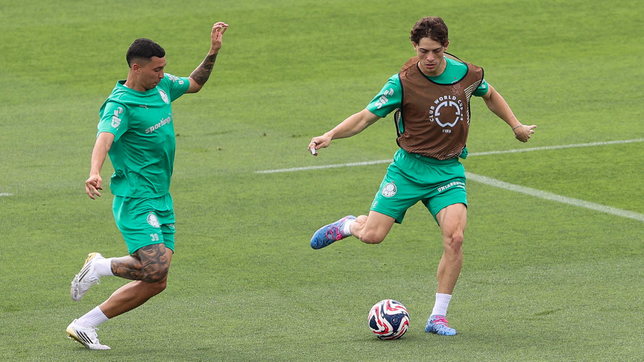 Os jogadores Vitor Roque e Agustín Giay (D), da SE Palmeiras, durante treinamento, na Universidade da Carolina do Norte. (Foto: Cesar Greco/Palmeiras/by Canon)
