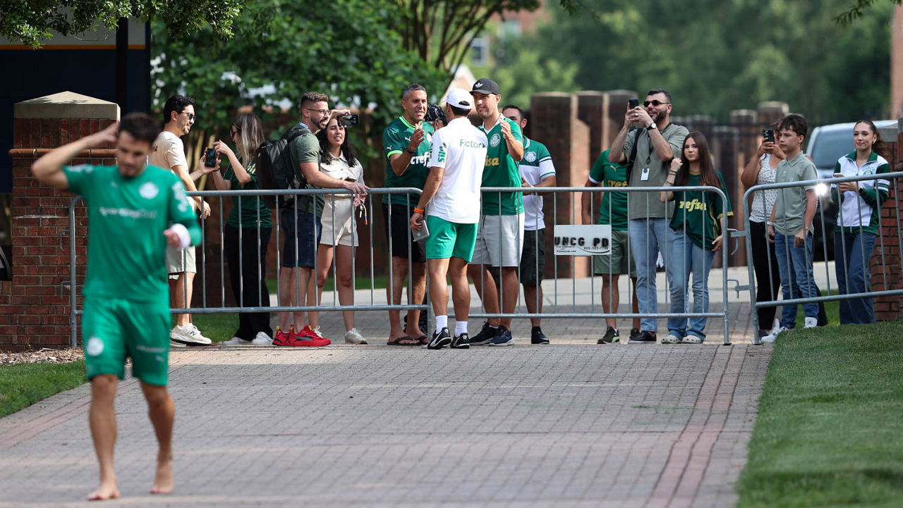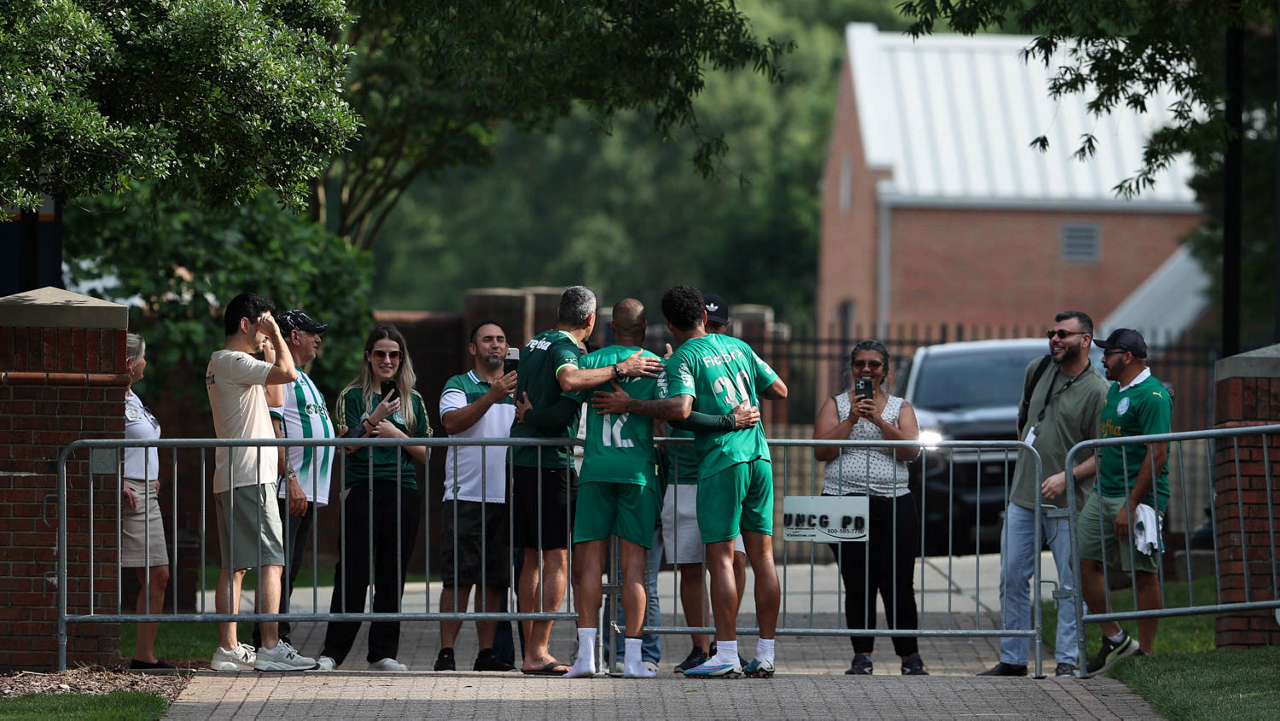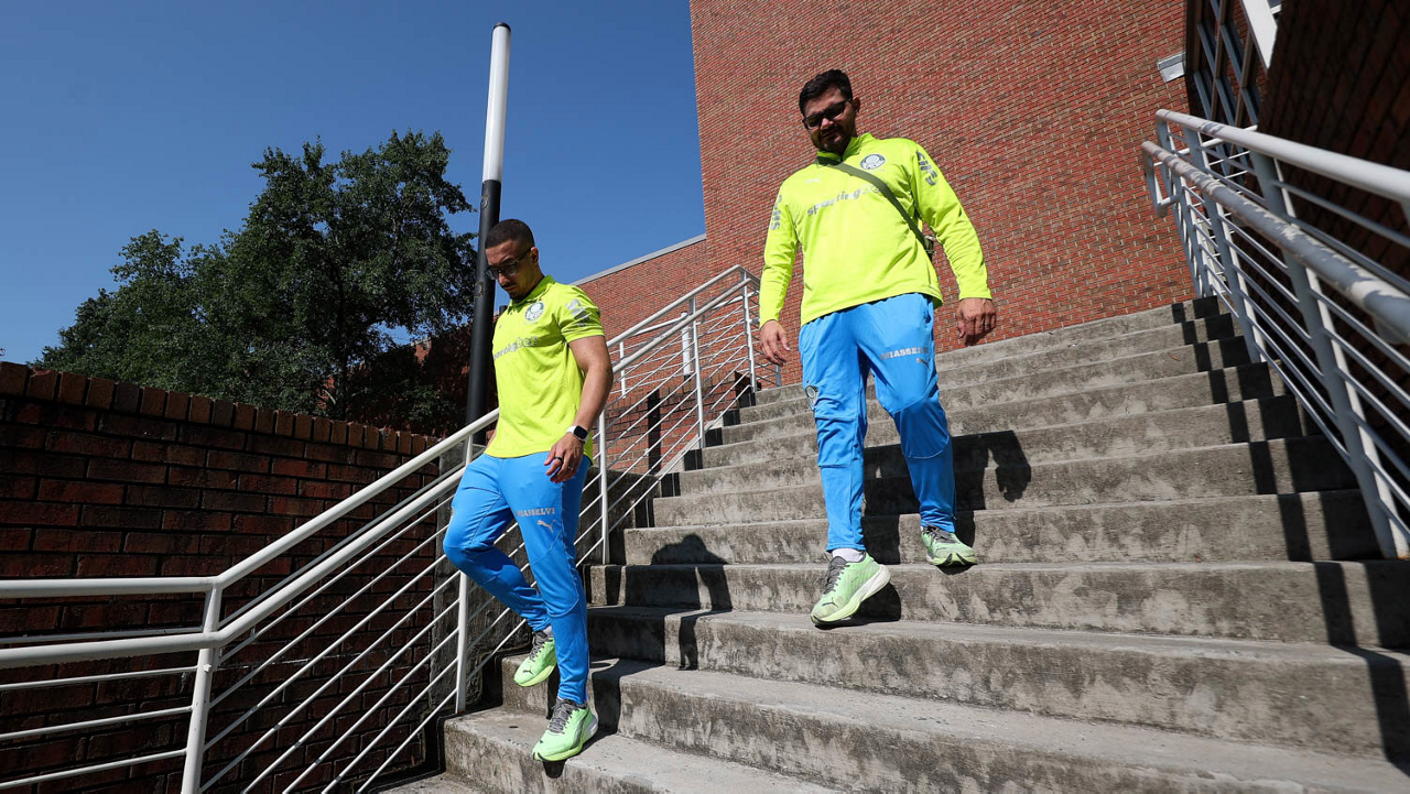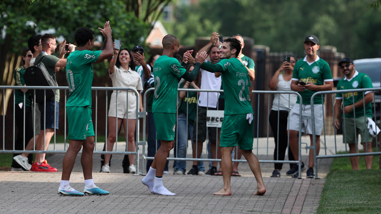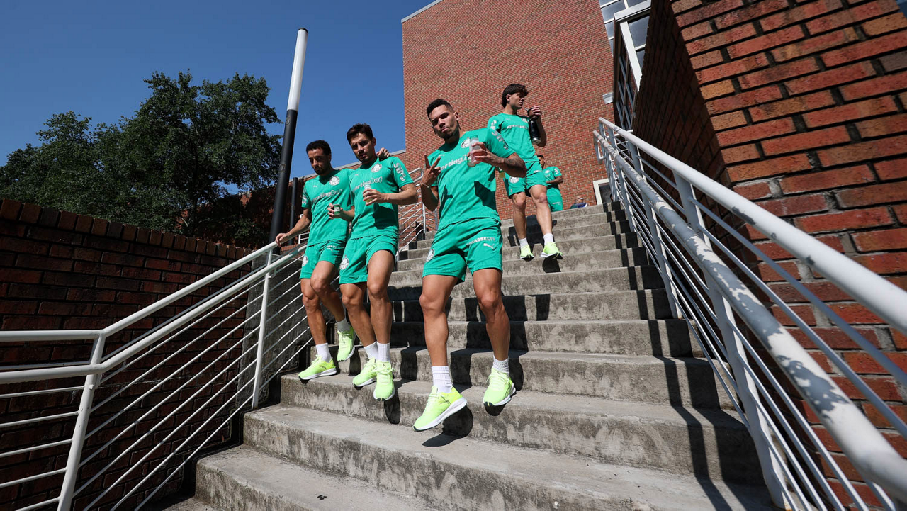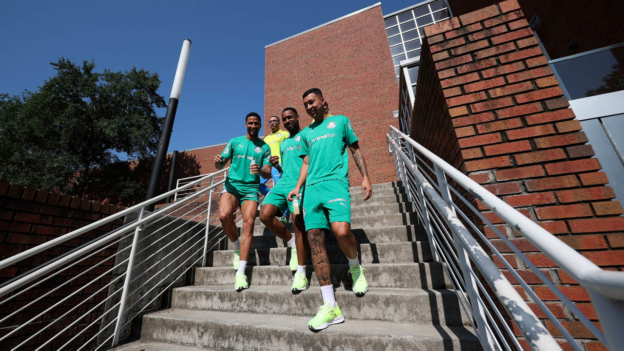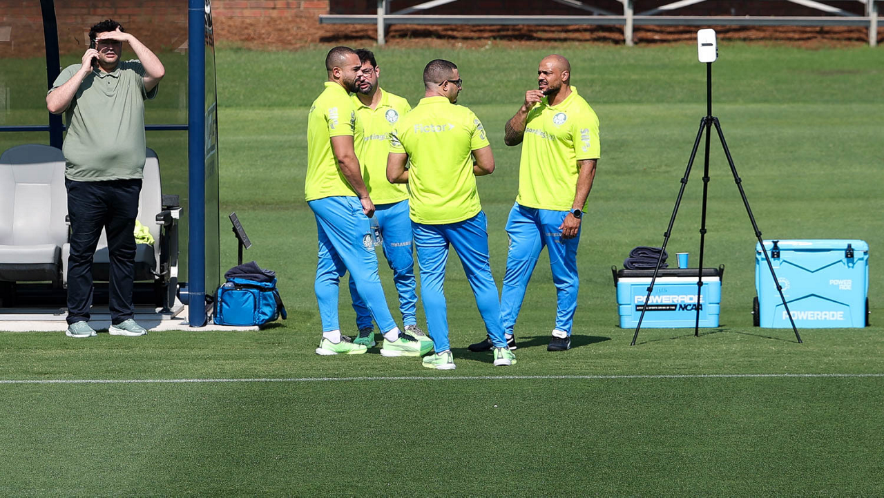 O gerente de processos Luís Gustavo Andrade, o fisioterapeuta Rodrigo Alencar, o massagista Paulinho, o fisioterapeuta Gustavo Kaschel e o massagista Alan Gabriel (E/D), da SE Palmeiras, durante treinamento, na Universidade da Carolina do Norte. (Foto: Cesar Greco/Palmeiras/by Canon)
