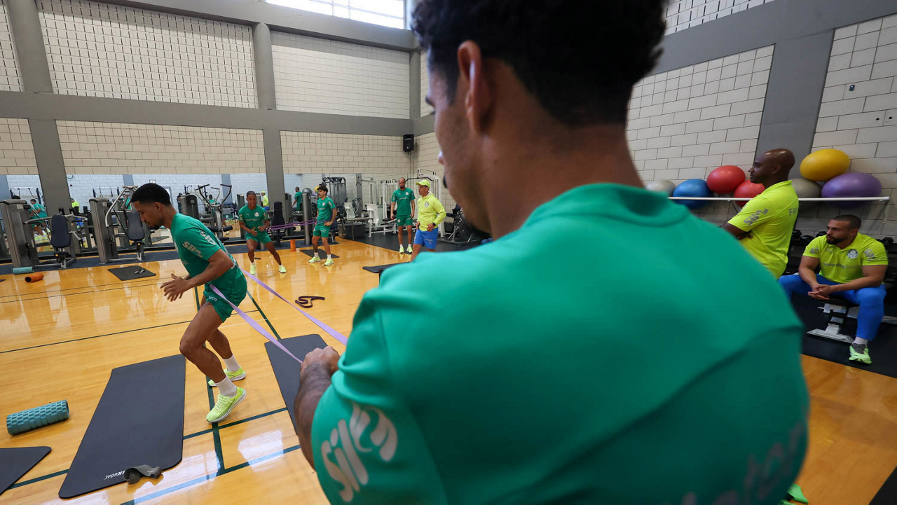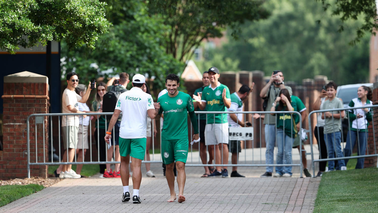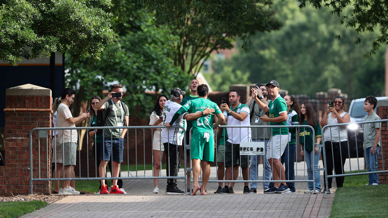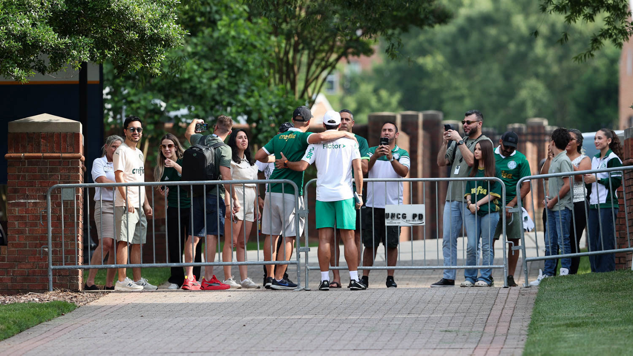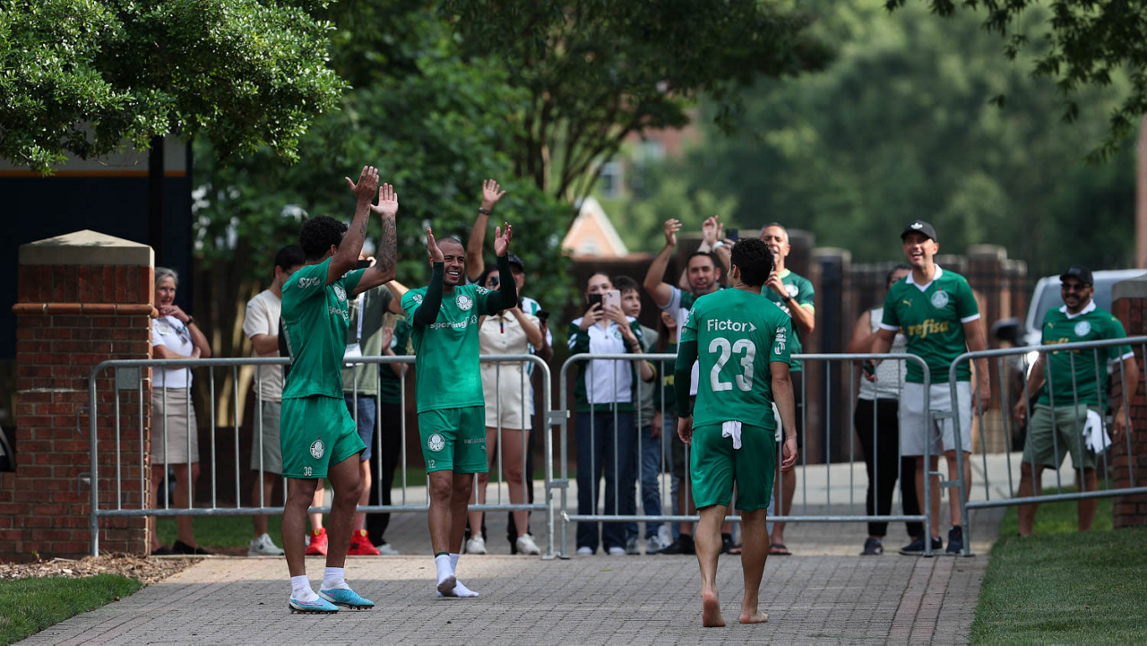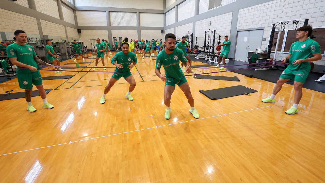 O gerente de processos Luís Gustavo Andrade, o fisioterapeuta Rodrigo Alencar, o massagista Paulinho, o fisioterapeuta Gustavo Kaschel e o massagista Alan Gabriel (E/D), da SE Palmeiras, durante treinamento, na Universidade da Carolina do Norte. (Foto: Cesar Greco/Palmeiras/by Canon)