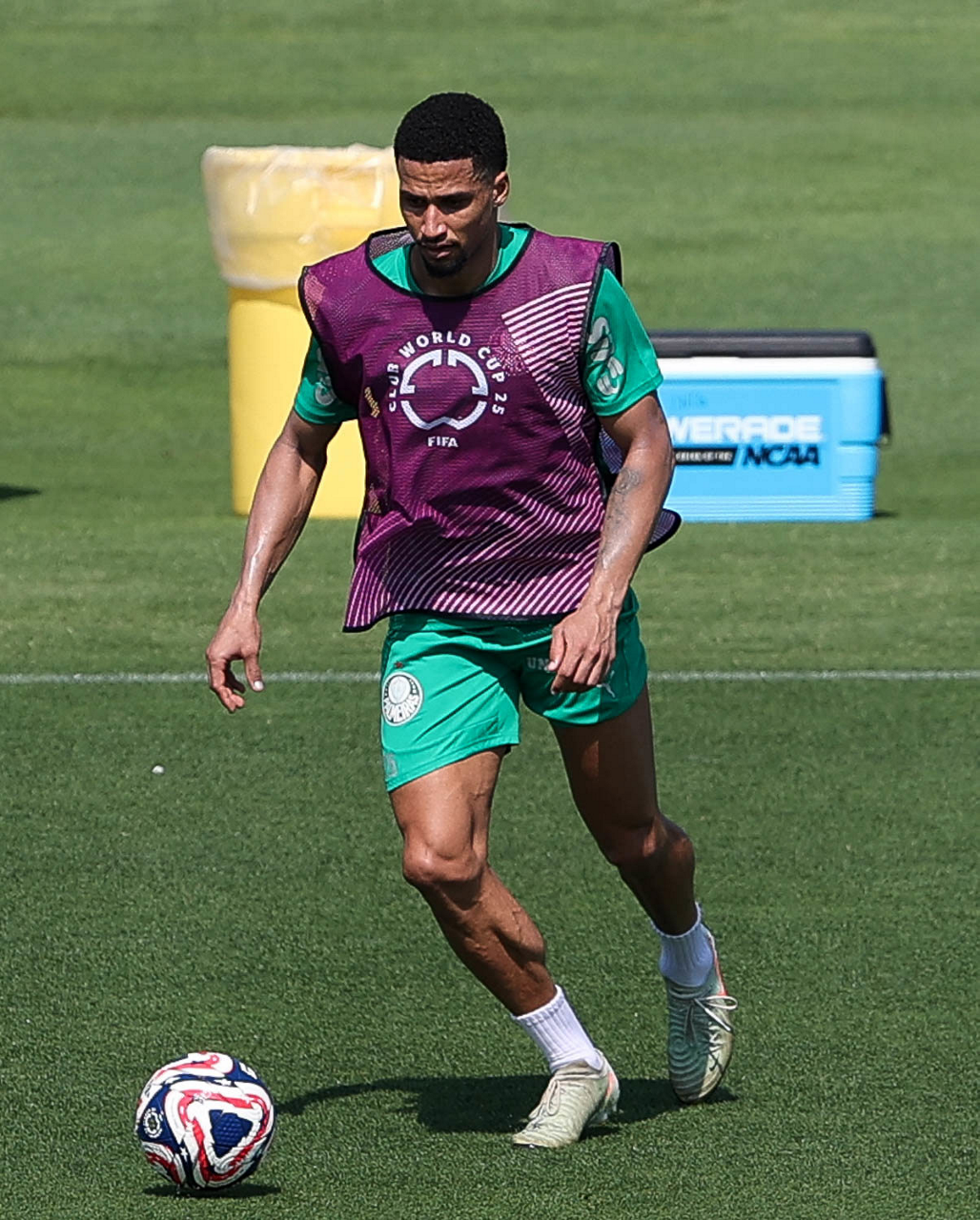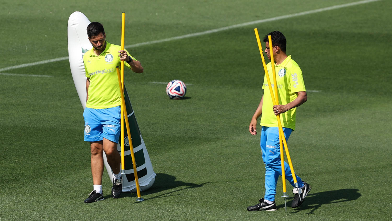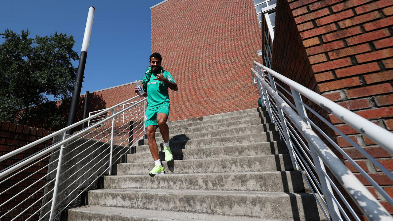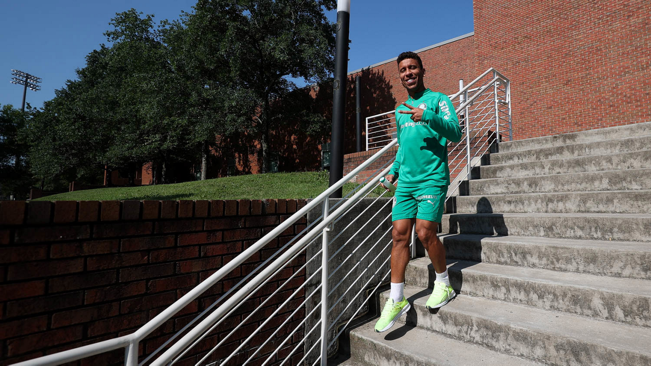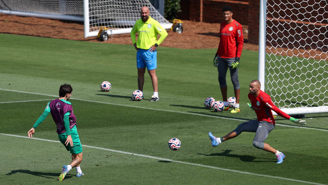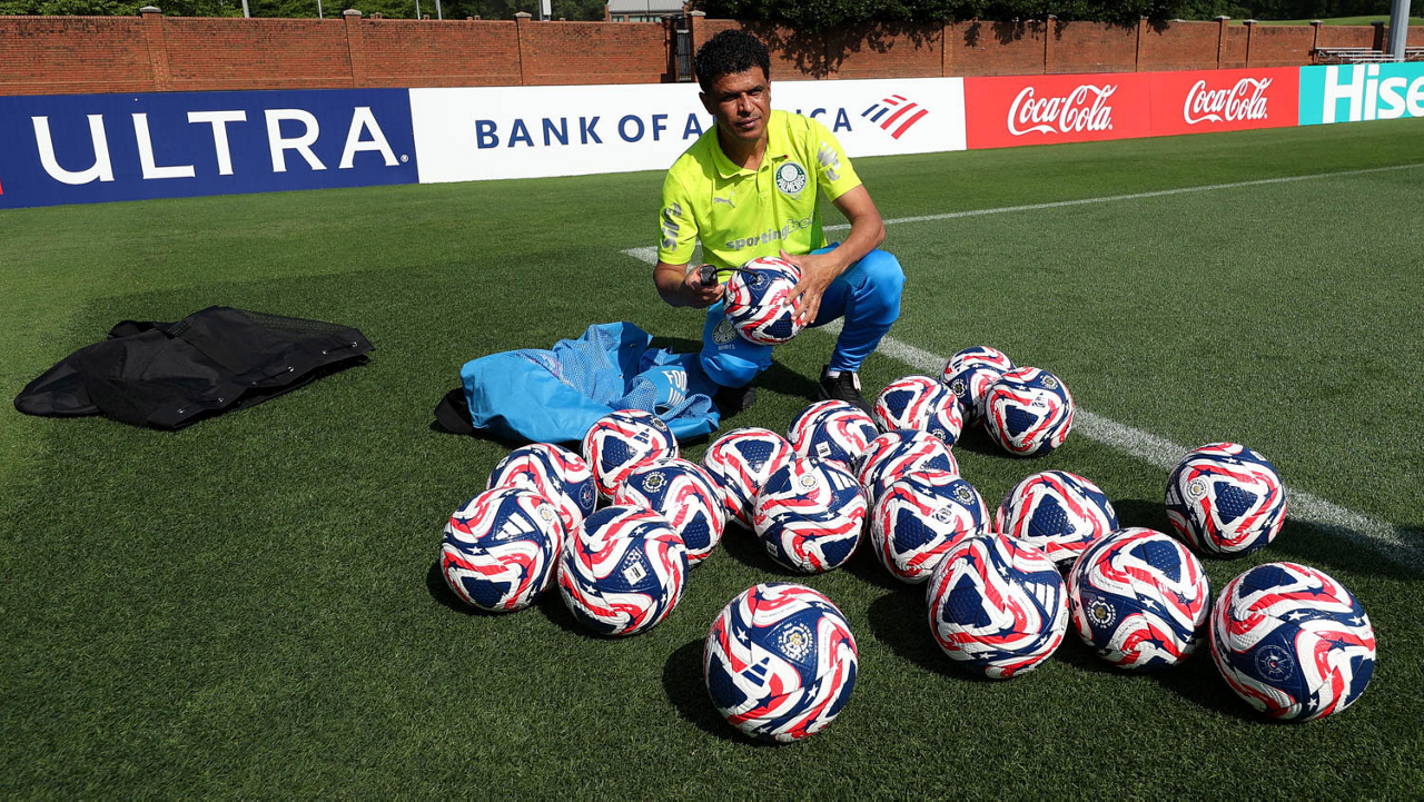 O gerente de processos Luís Gustavo Andrade, o fisioterapeuta Rodrigo Alencar, o massagista Paulinho, o fisioterapeuta Gustavo Kaschel e o massagista Alan Gabriel (E/D), da SE Palmeiras, durante treinamento, na Universidade da Carolina do Norte. (Foto: Cesar Greco/Palmeiras/by Canon)