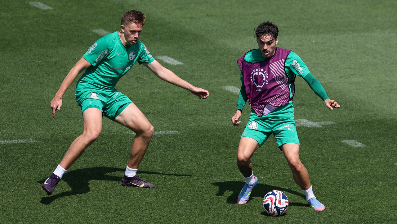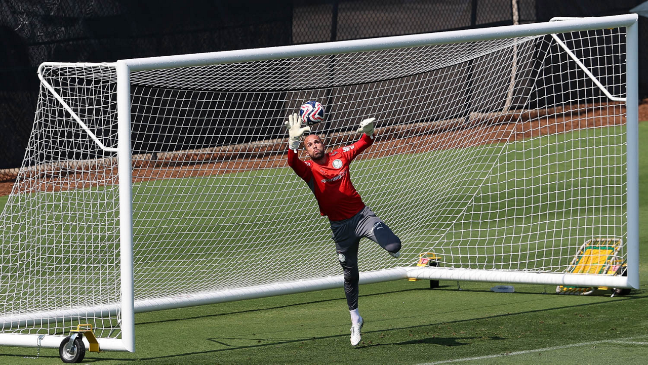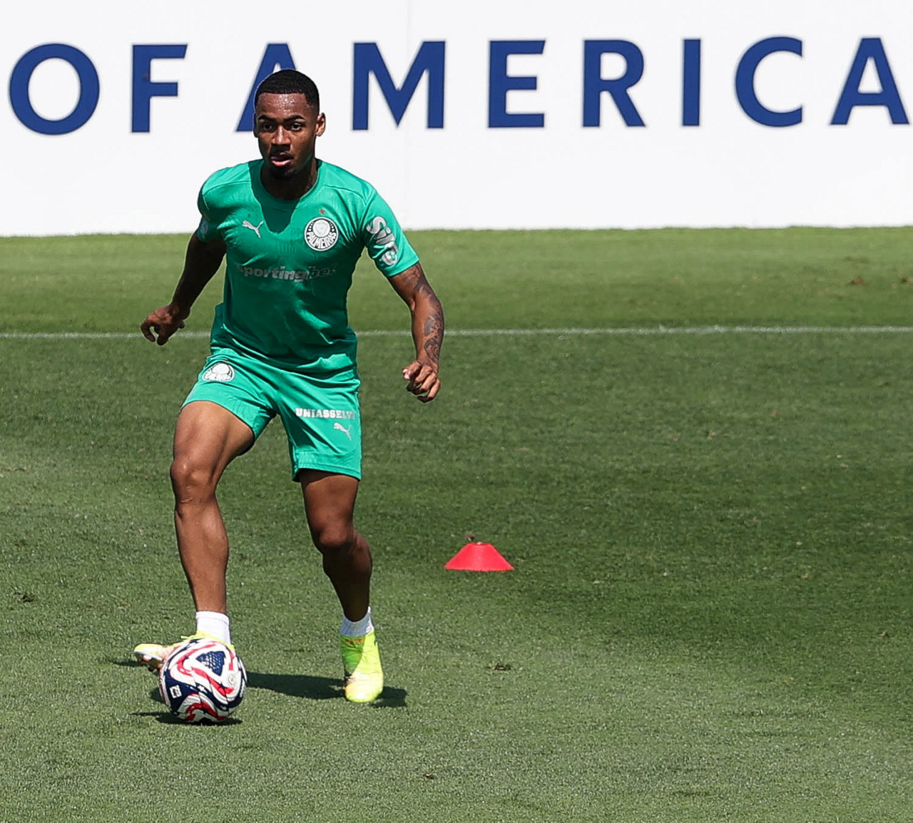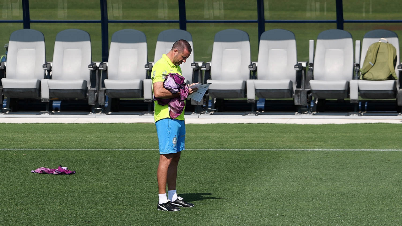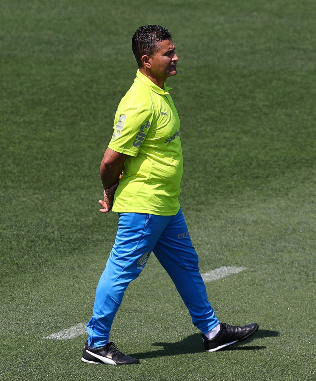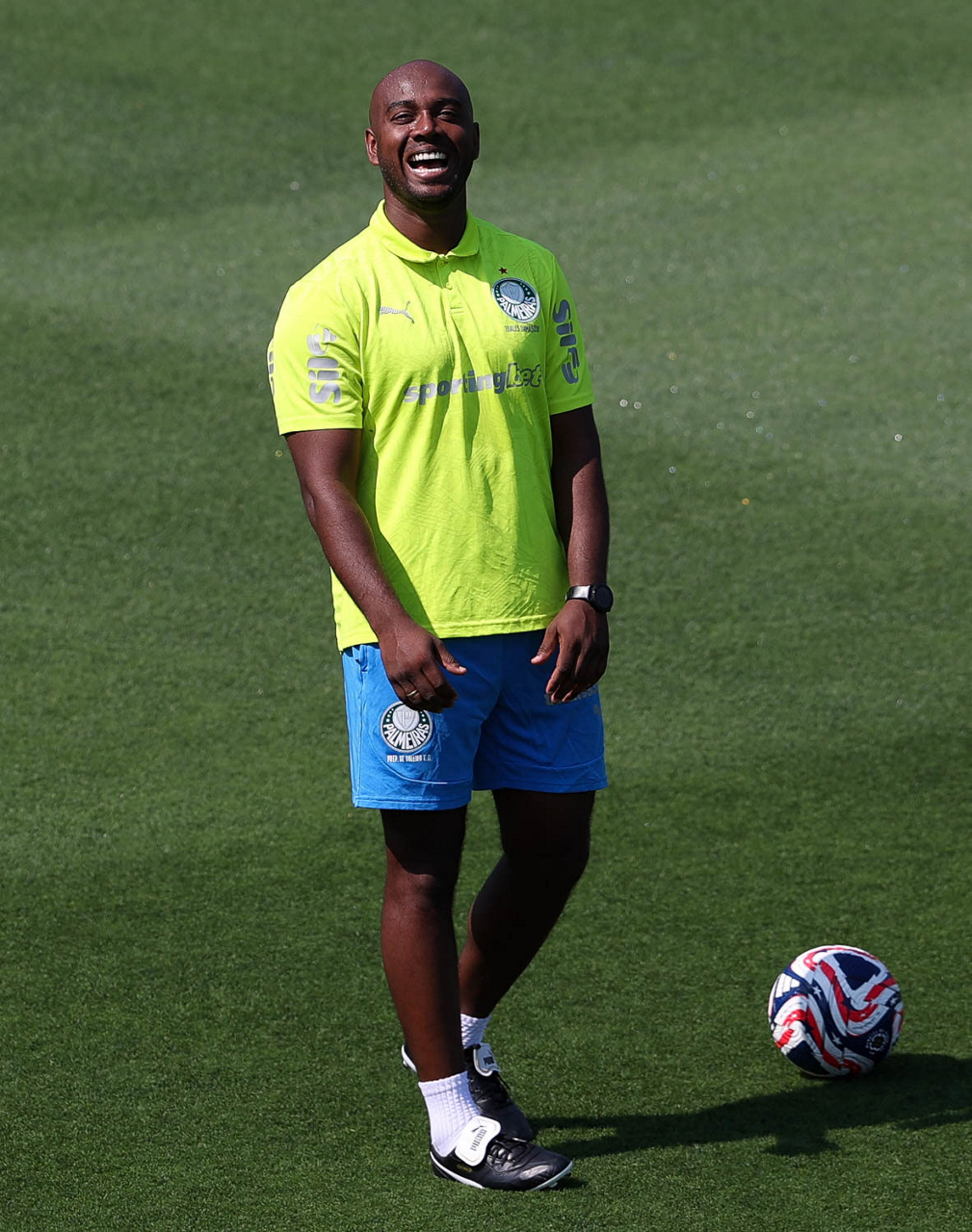 O gerente de processos Luís Gustavo Andrade, o fisioterapeuta Rodrigo Alencar, o massagista Paulinho, o fisioterapeuta Gustavo Kaschel e o massagista Alan Gabriel (E/D), da SE Palmeiras, durante treinamento, na Universidade da Carolina do Norte. (Foto: Cesar Greco/Palmeiras/by Canon)