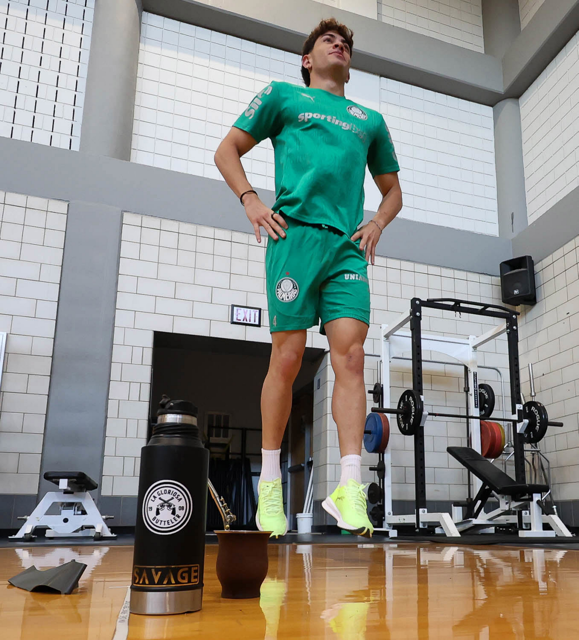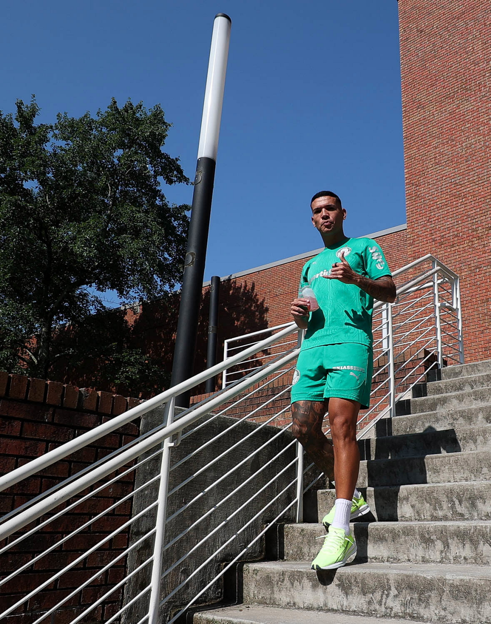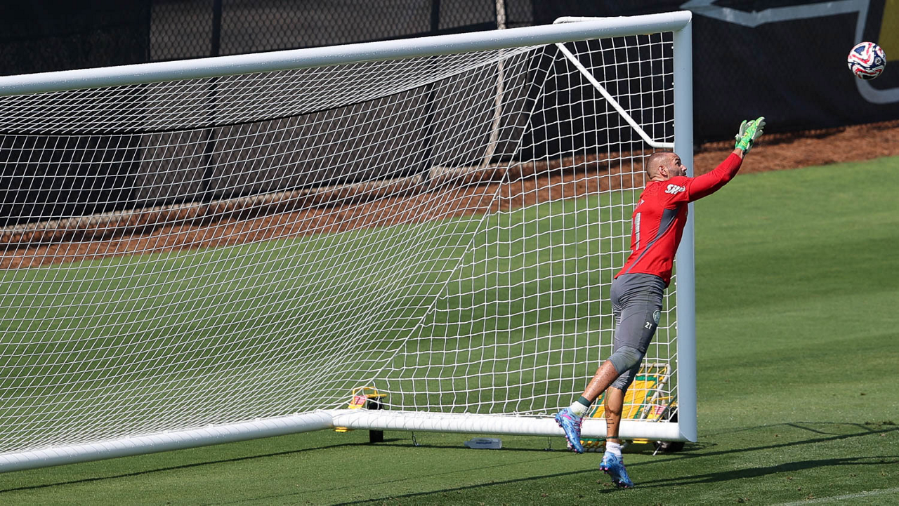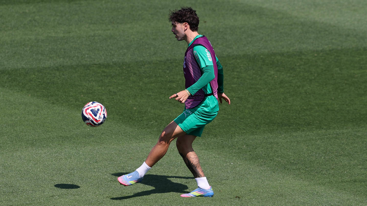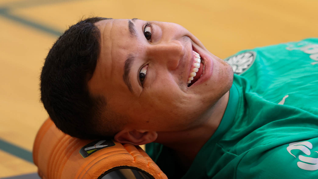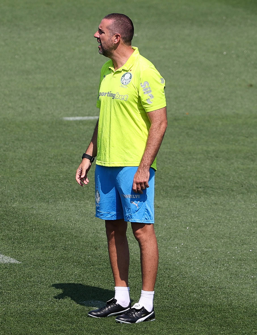 O gerente de processos Luís Gustavo Andrade, o fisioterapeuta Rodrigo Alencar, o massagista Paulinho, o fisioterapeuta Gustavo Kaschel e o massagista Alan Gabriel (E/D), da SE Palmeiras, durante treinamento, na Universidade da Carolina do Norte. (Foto: Cesar Greco/Palmeiras/by Canon)