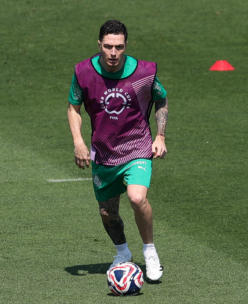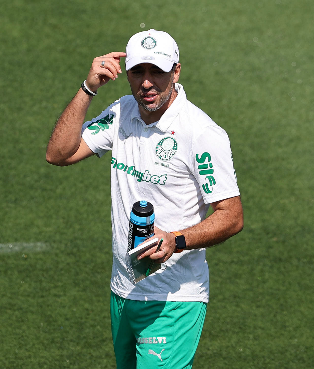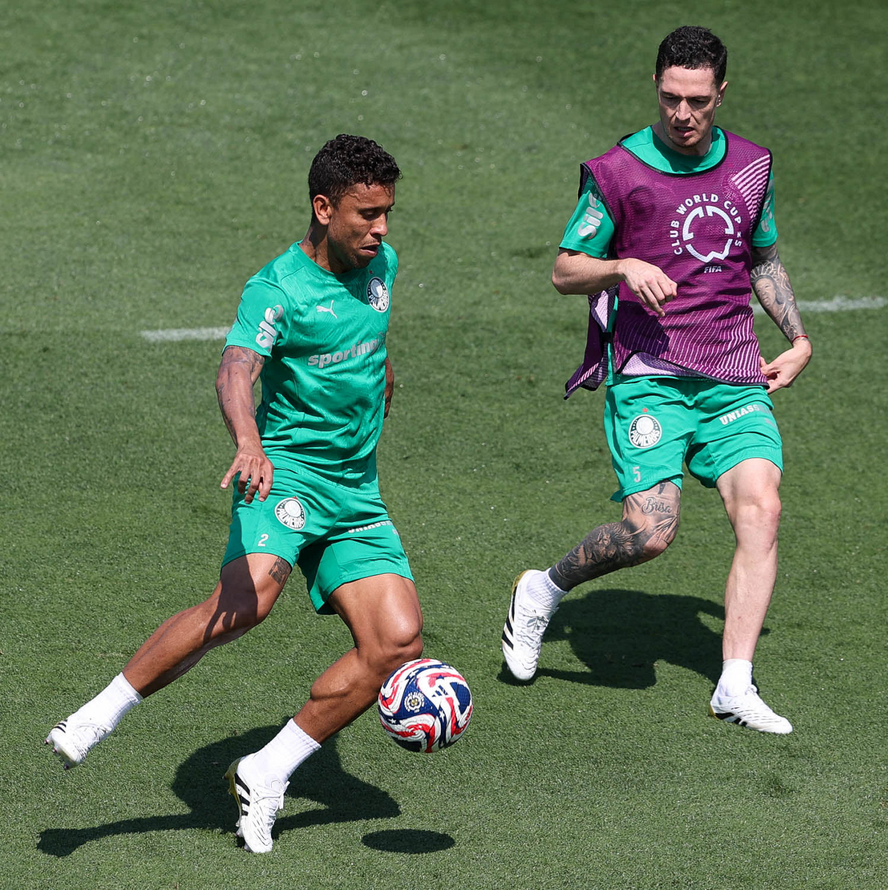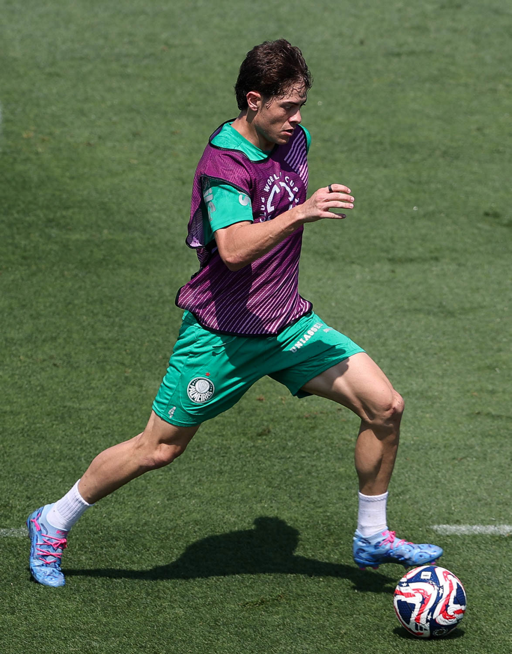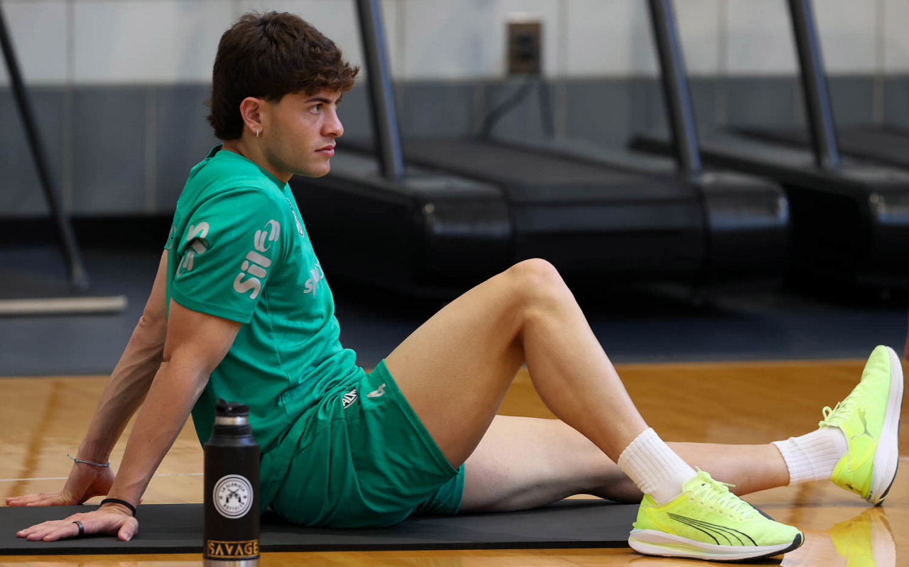 O gerente de processos Luís Gustavo Andrade, o fisioterapeuta Rodrigo Alencar, o massagista Paulinho, o fisioterapeuta Gustavo Kaschel e o massagista Alan Gabriel (E/D), da SE Palmeiras, durante treinamento, na Universidade da Carolina do Norte. (Foto: Cesar Greco/Palmeiras/by Canon)