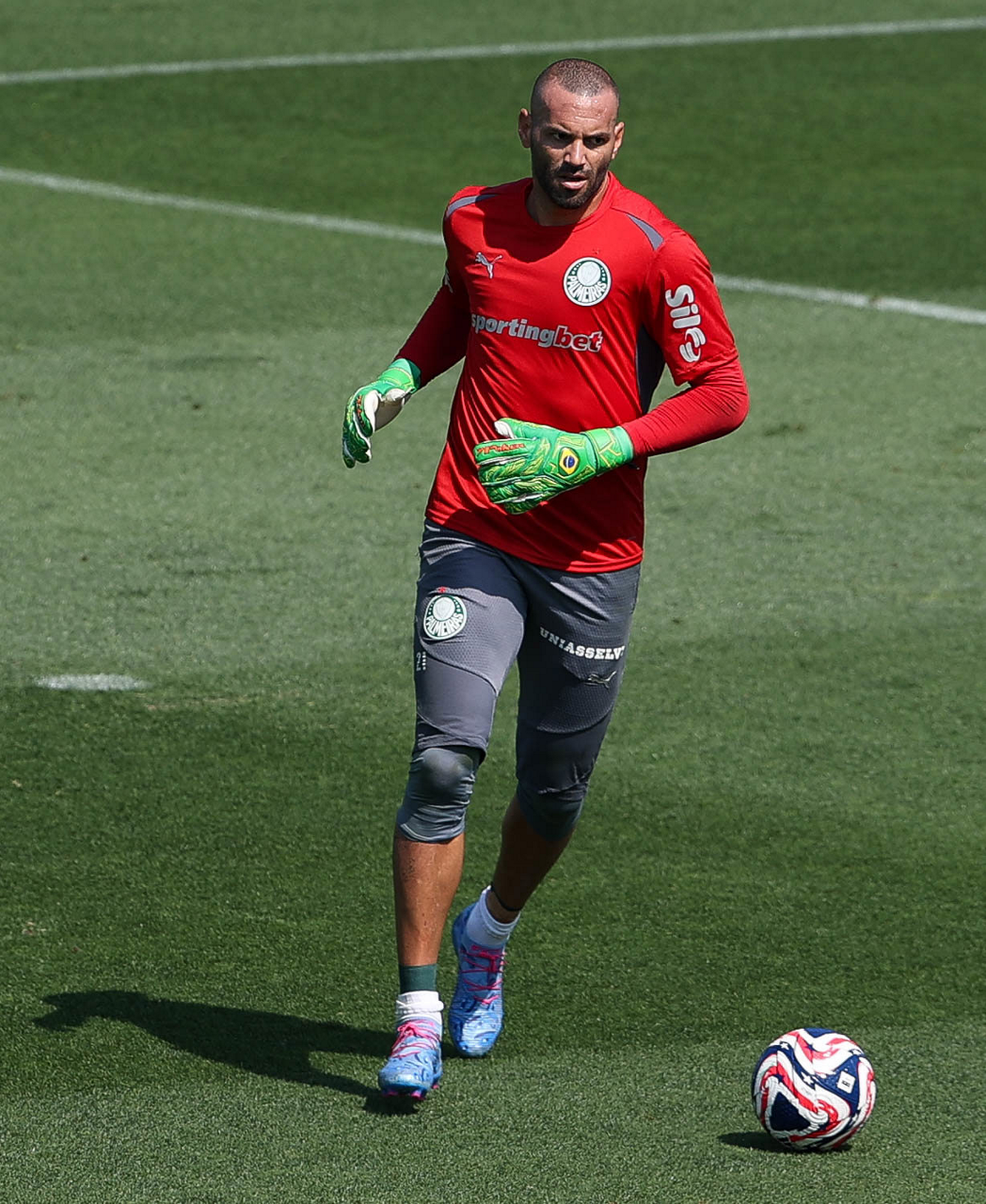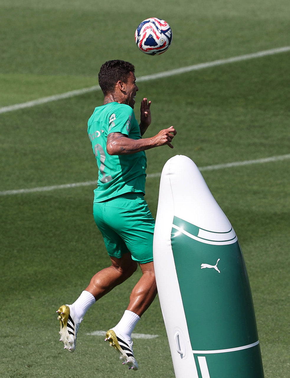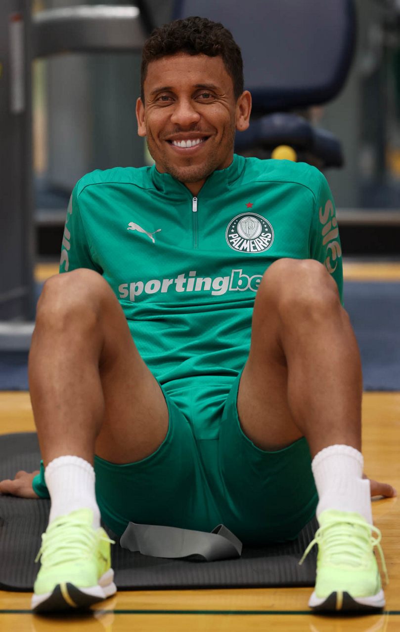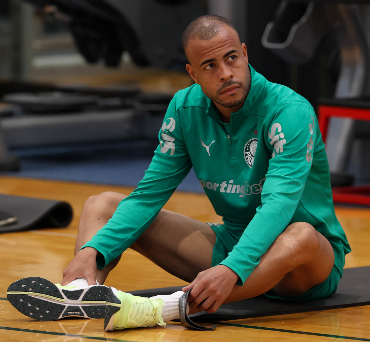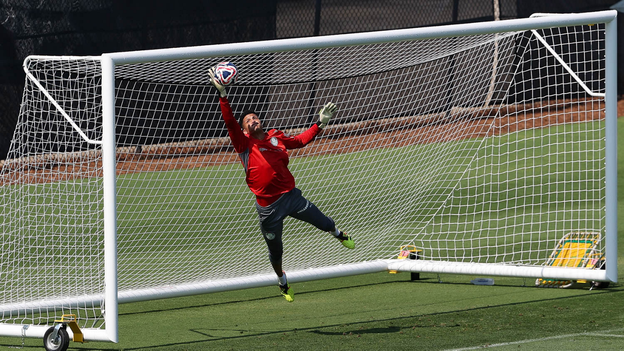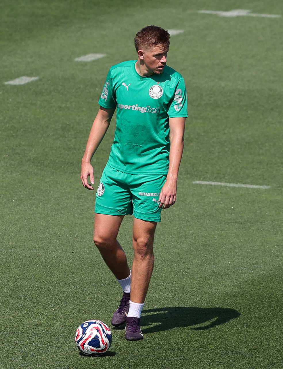 O gerente de processos Luís Gustavo Andrade, o fisioterapeuta Rodrigo Alencar, o massagista Paulinho, o fisioterapeuta Gustavo Kaschel e o massagista Alan Gabriel (E/D), da SE Palmeiras, durante treinamento, na Universidade da Carolina do Norte. (Foto: Cesar Greco/Palmeiras/by Canon)