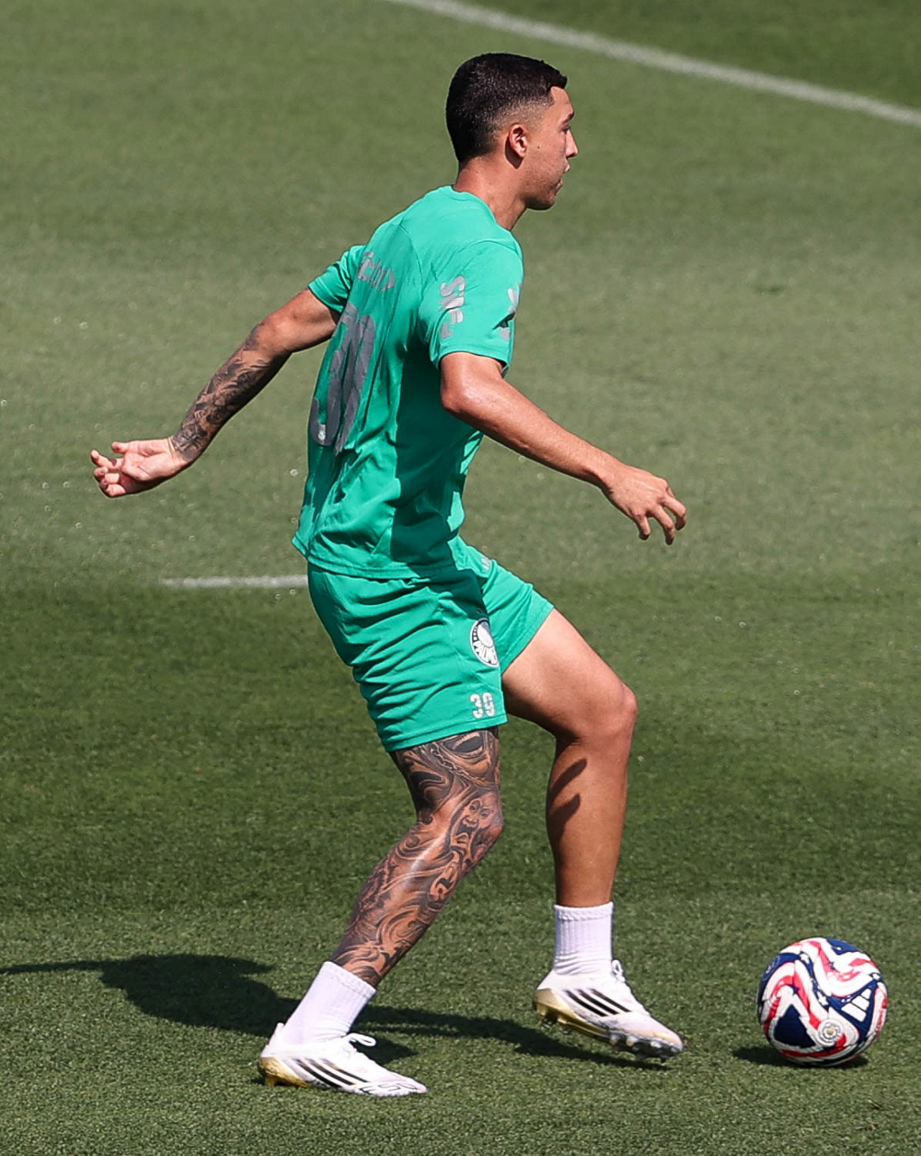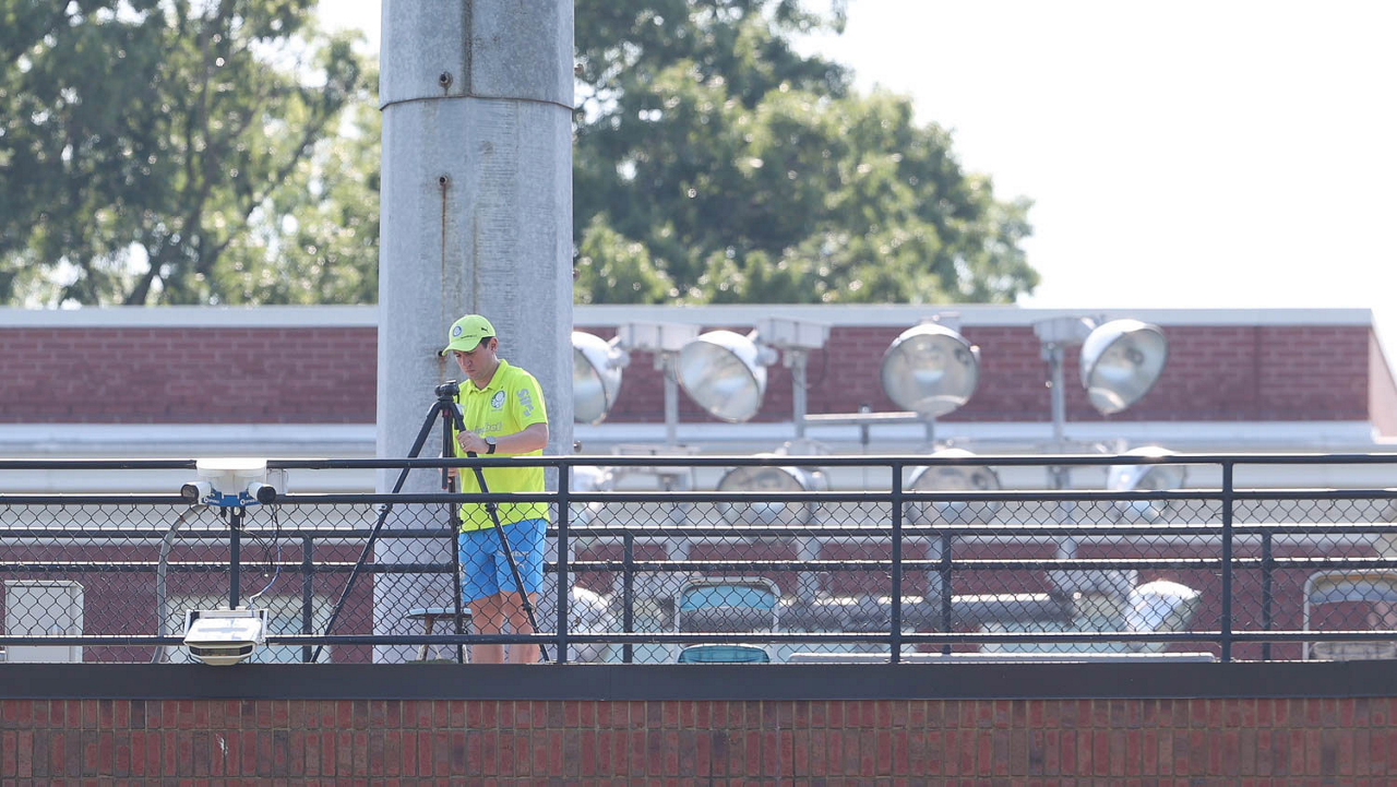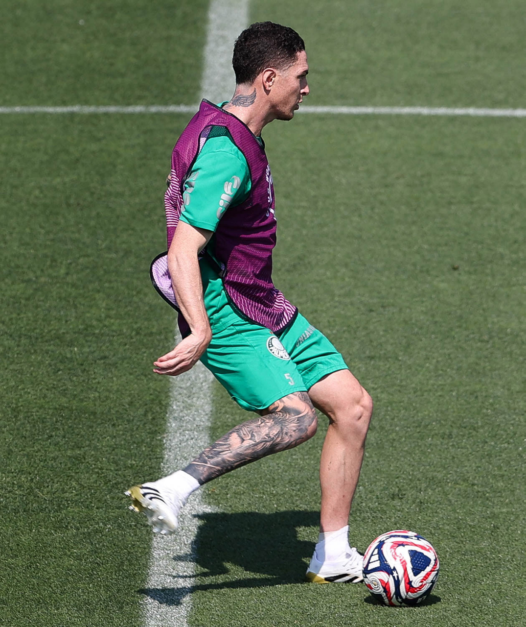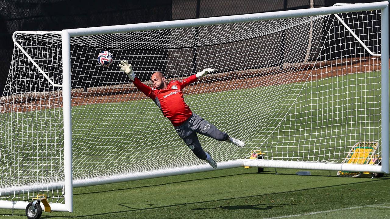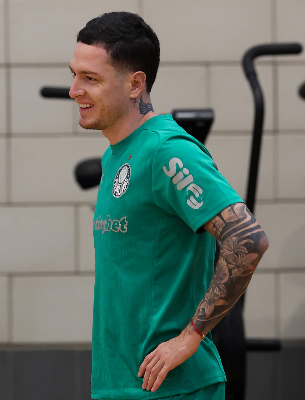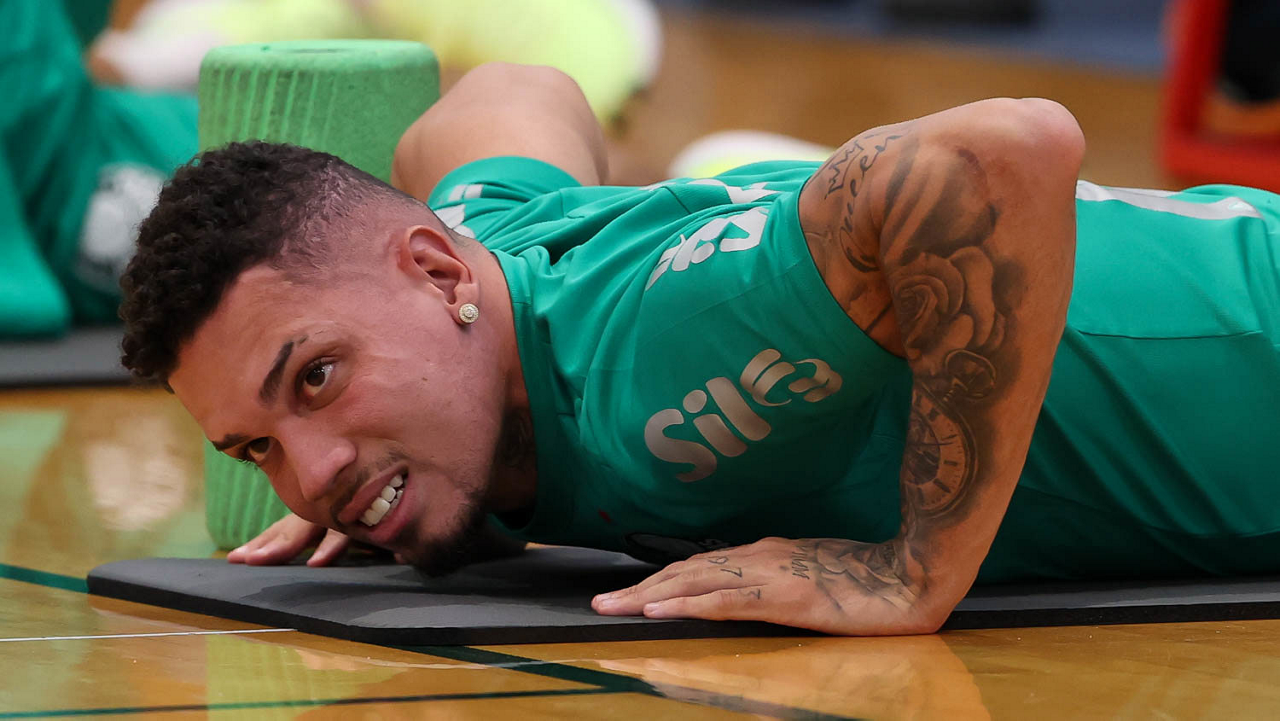 O gerente de processos Luís Gustavo Andrade, o fisioterapeuta Rodrigo Alencar, o massagista Paulinho, o fisioterapeuta Gustavo Kaschel e o massagista Alan Gabriel (E/D), da SE Palmeiras, durante treinamento, na Universidade da Carolina do Norte. (Foto: Cesar Greco/Palmeiras/by Canon)