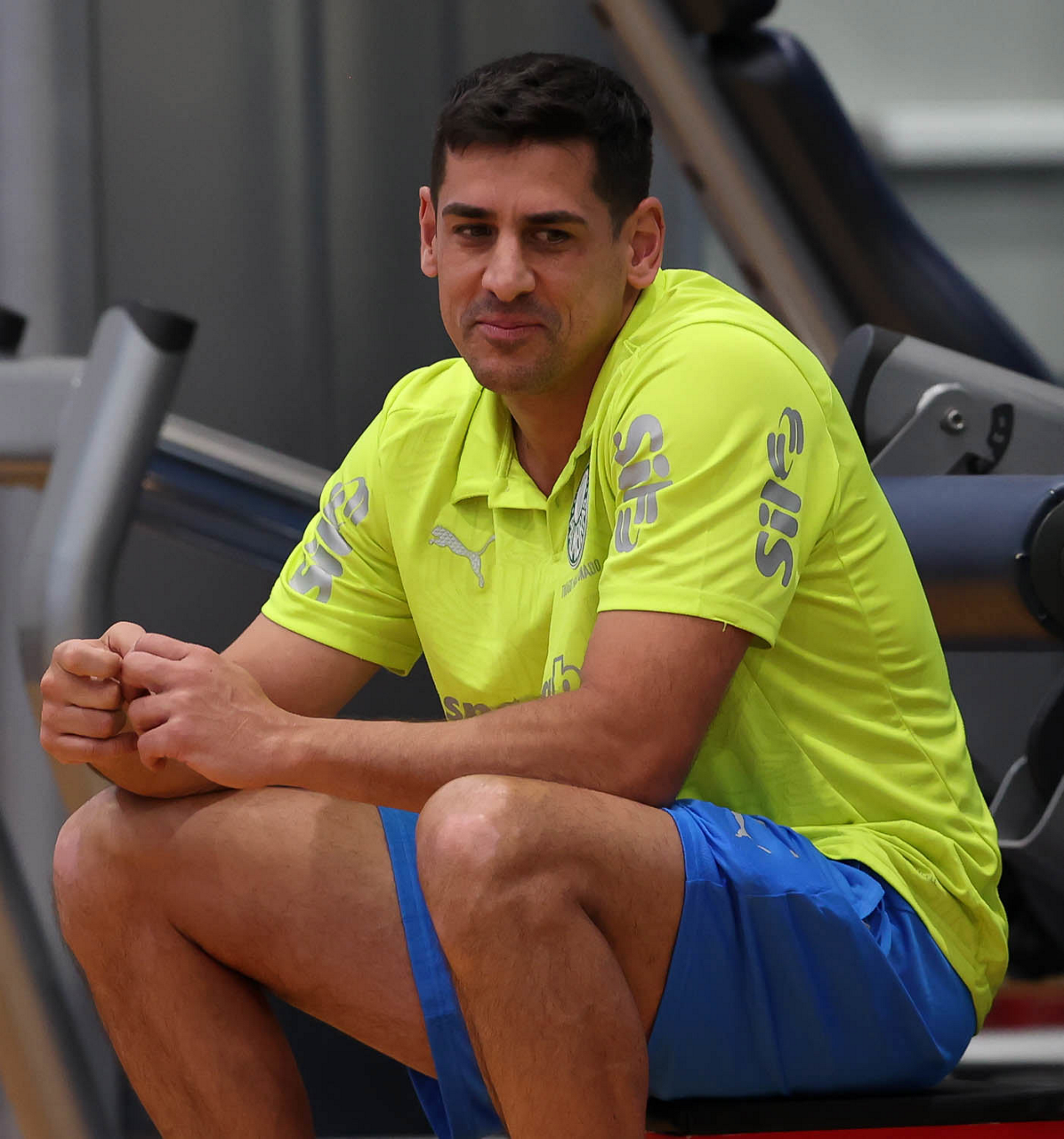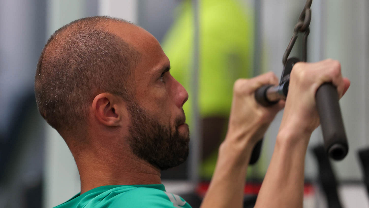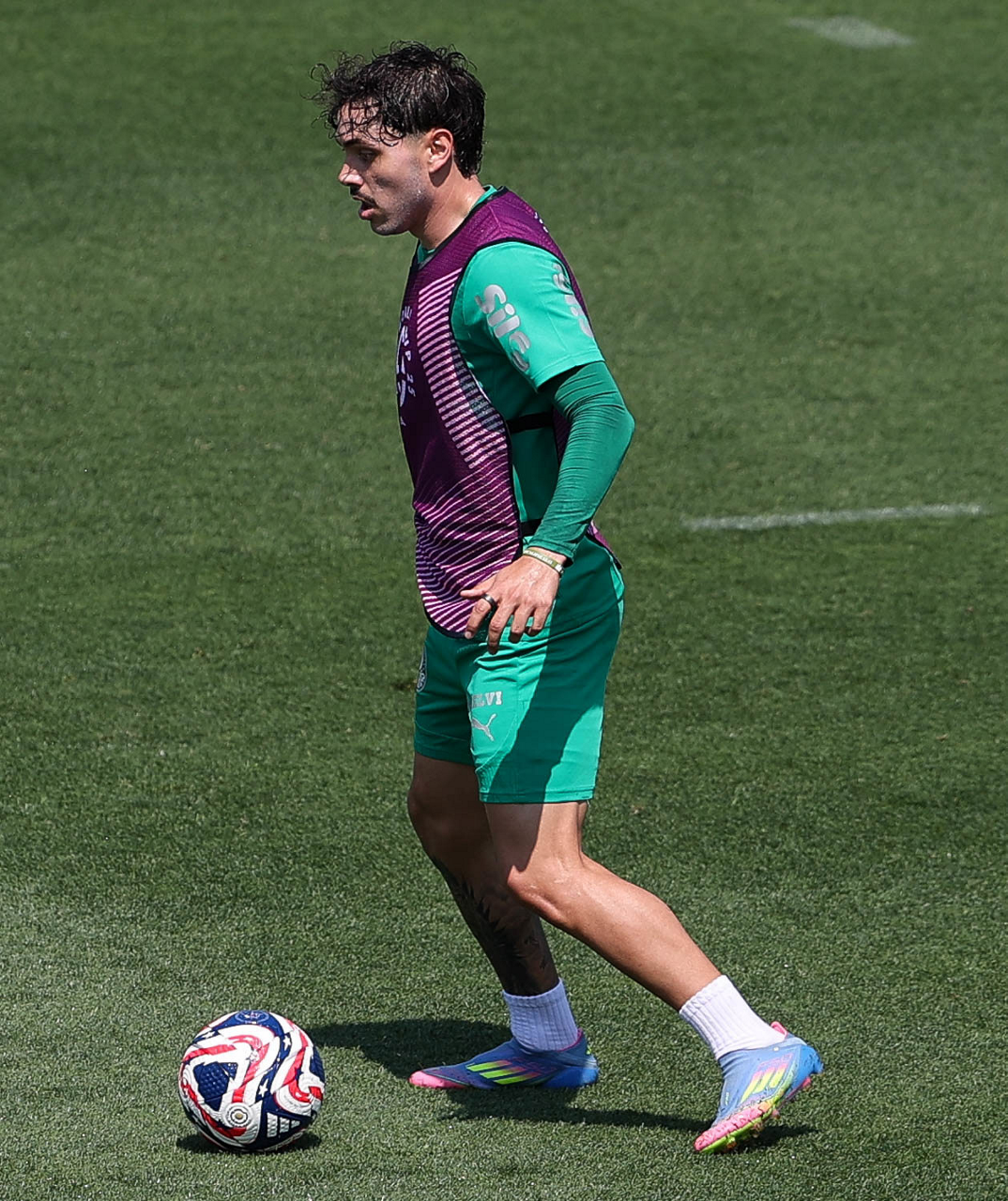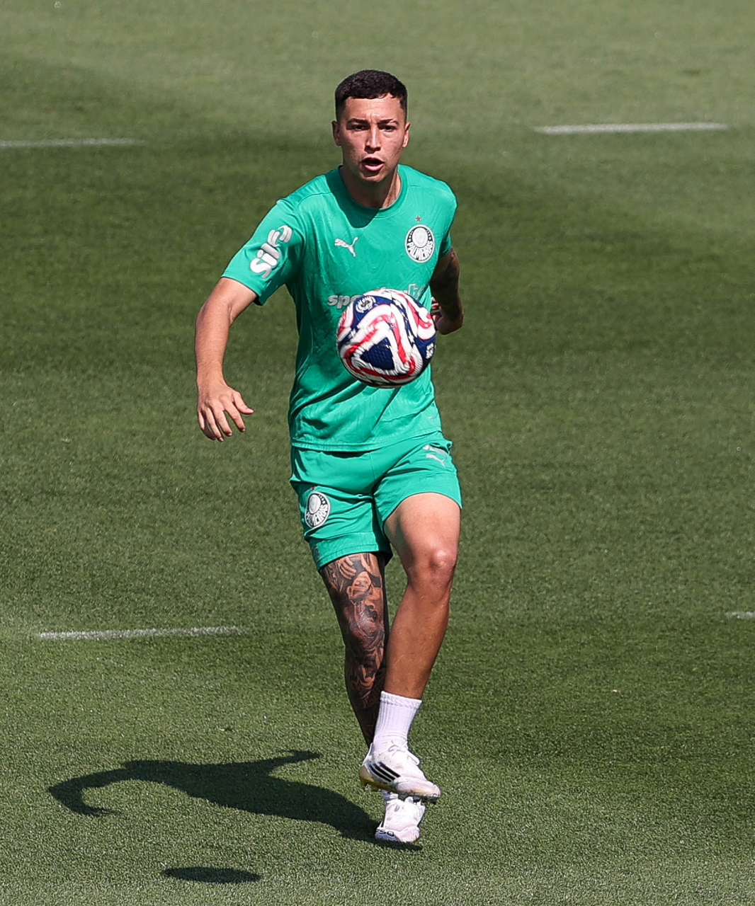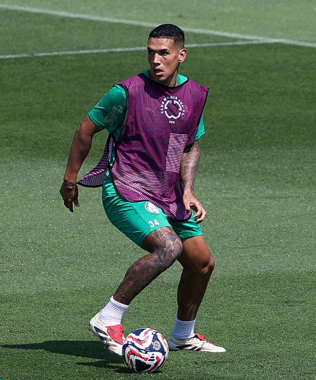 O gerente de processos Luís Gustavo Andrade, o fisioterapeuta Rodrigo Alencar, o massagista Paulinho, o fisioterapeuta Gustavo Kaschel e o massagista Alan Gabriel (E/D), da SE Palmeiras, durante treinamento, na Universidade da Carolina do Norte. (Foto: Cesar Greco/Palmeiras/by Canon)