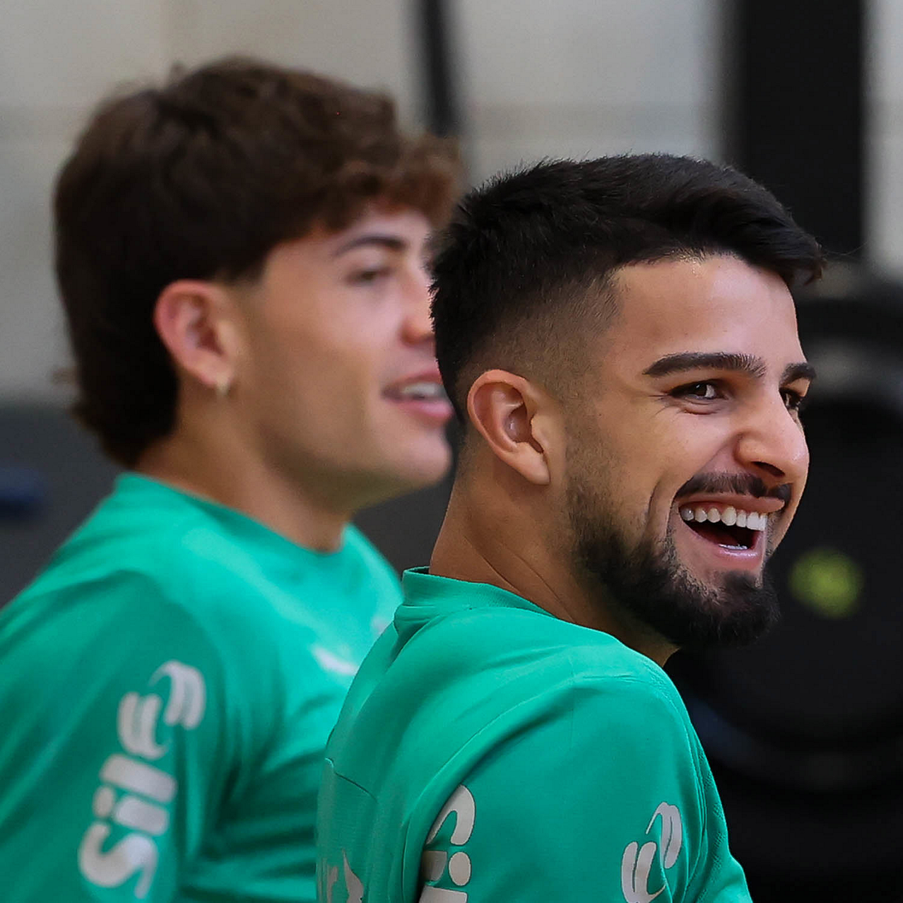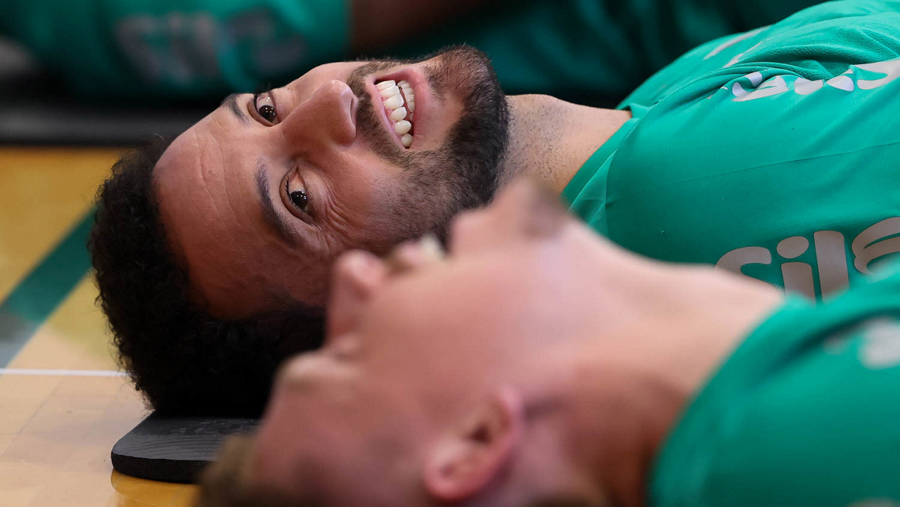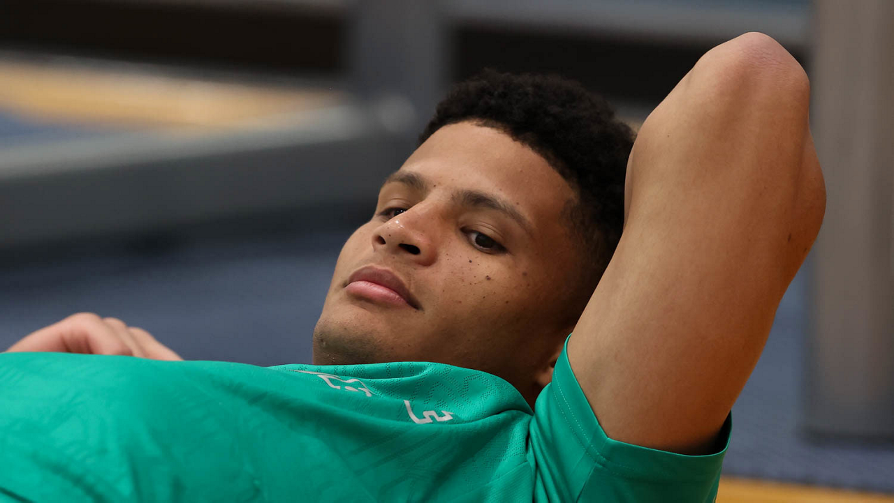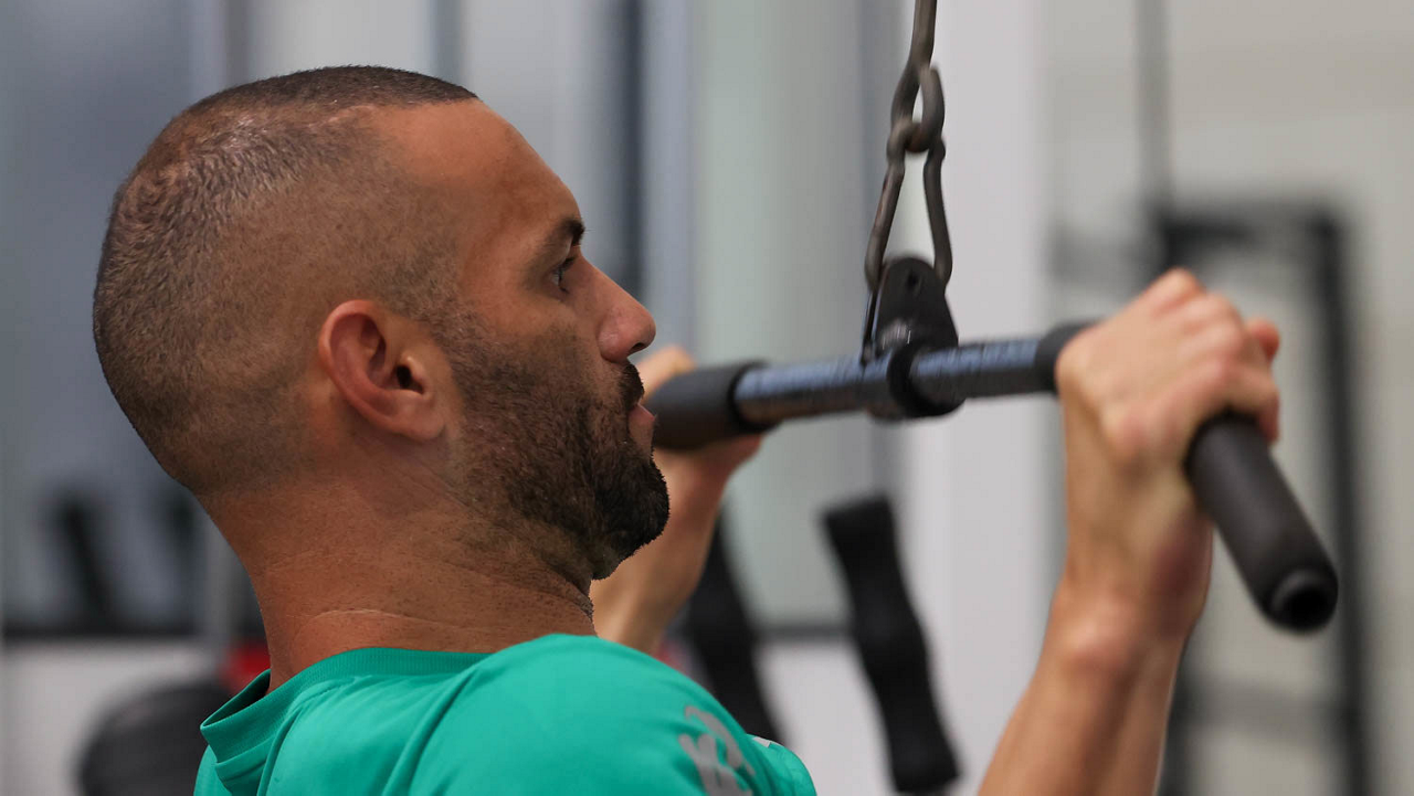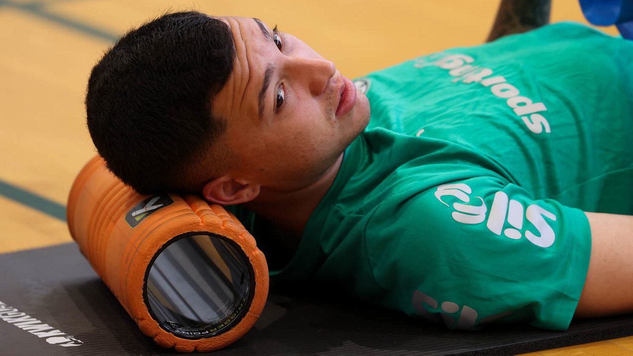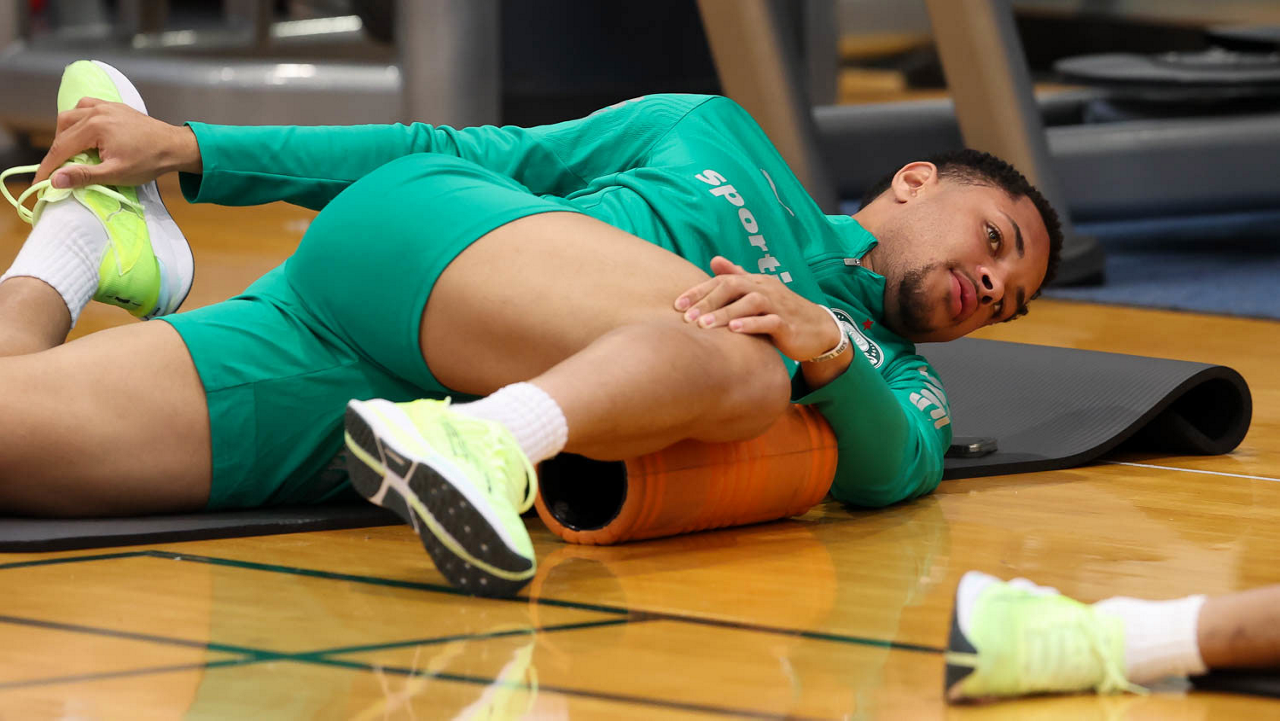 O gerente de processos Luís Gustavo Andrade, o fisioterapeuta Rodrigo Alencar, o massagista Paulinho, o fisioterapeuta Gustavo Kaschel e o massagista Alan Gabriel (E/D), da SE Palmeiras, durante treinamento, na Universidade da Carolina do Norte. (Foto: Cesar Greco/Palmeiras/by Canon)