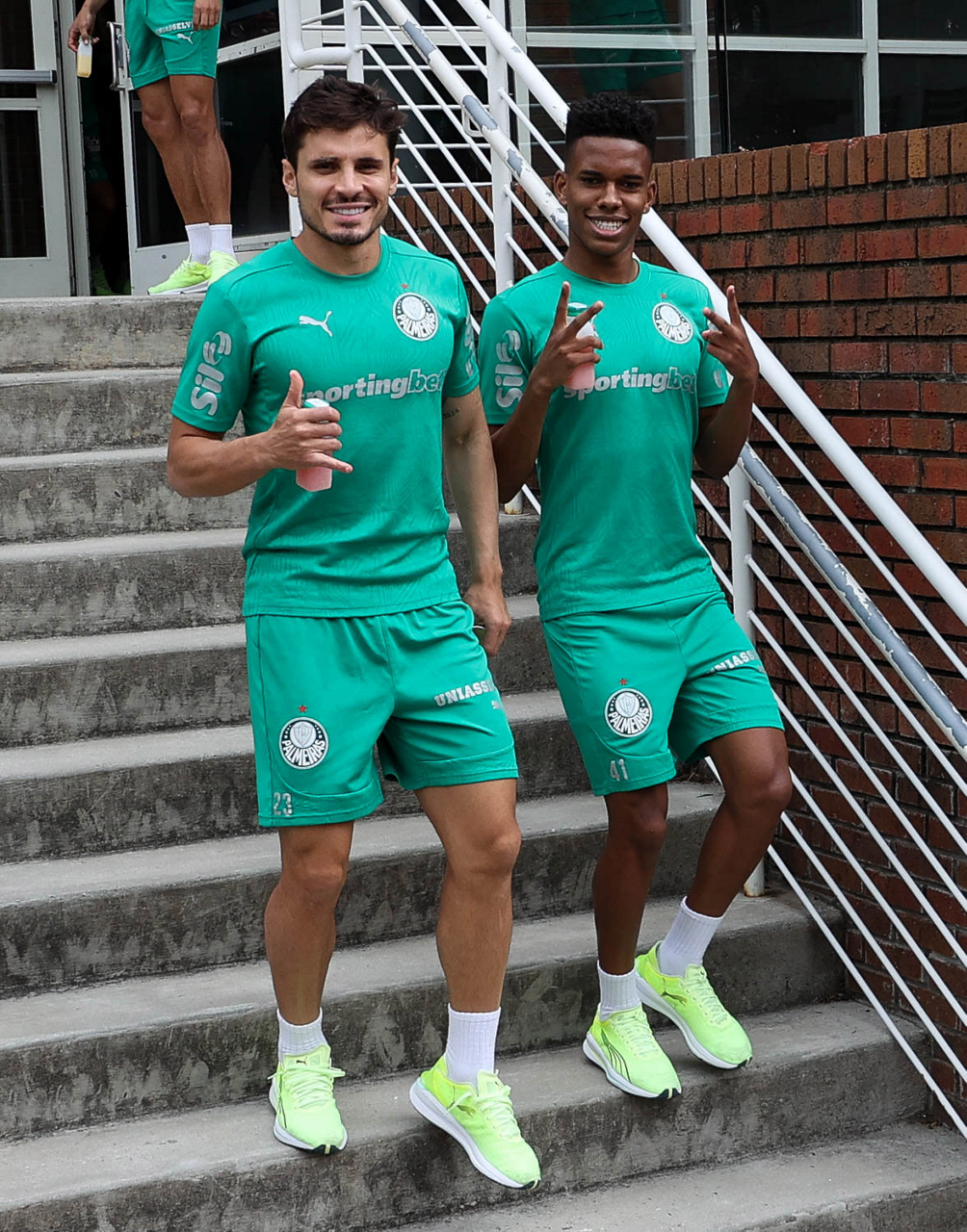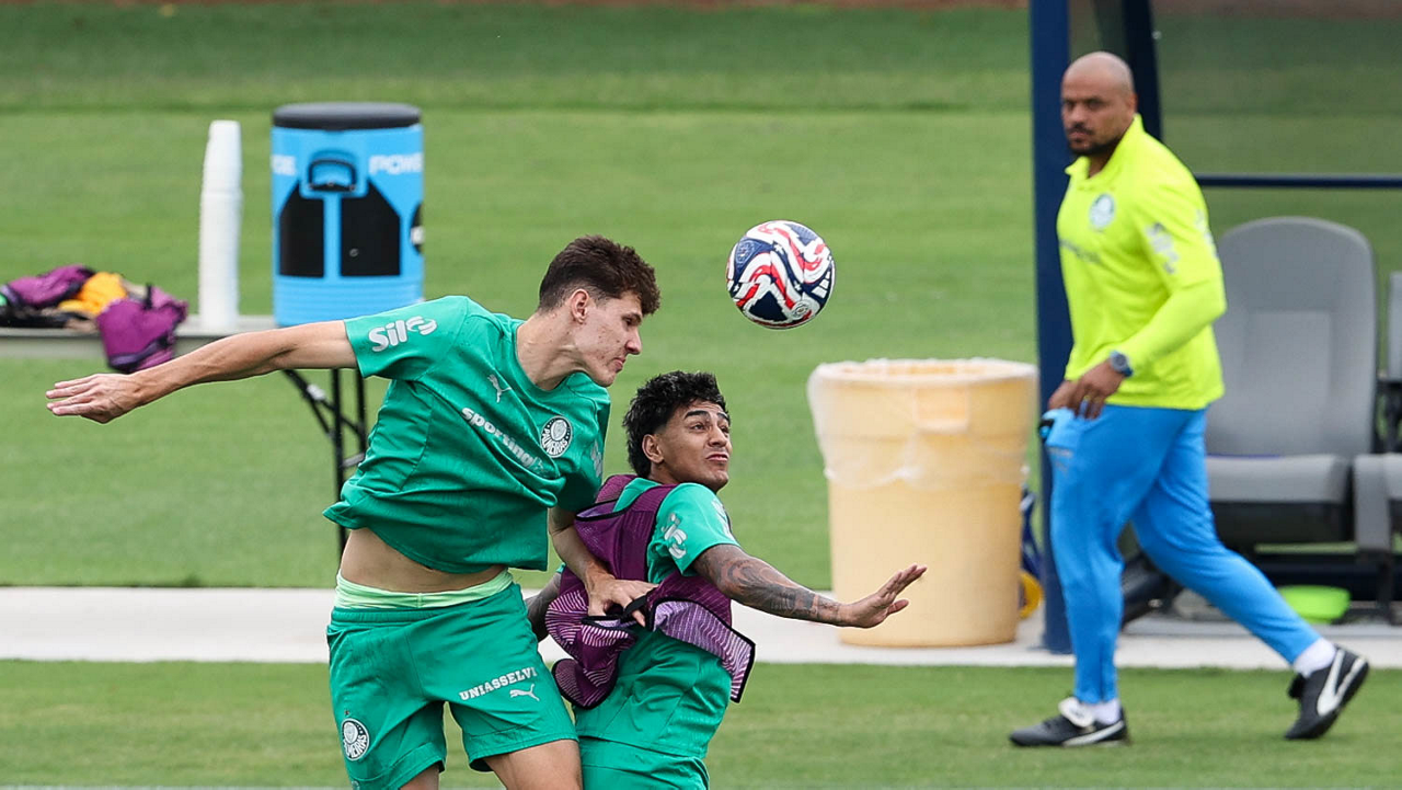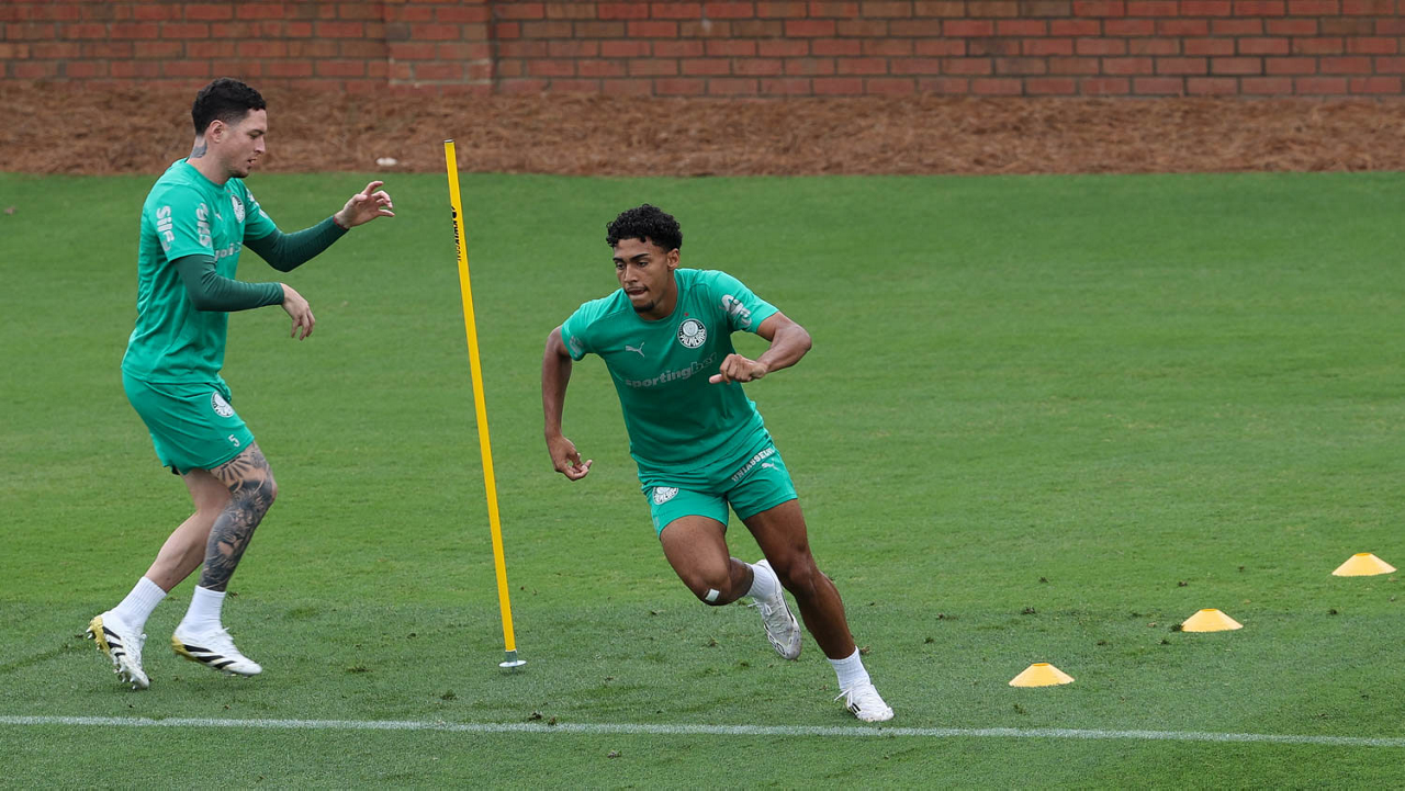 Os jogadores Estêvão e Joaquín Piquerez (D), da SE Palmeiras, durante treinamento, na Universidade da Carolina do Norte. (Foto: Cesar Greco/Palmeiras/by Canon)
