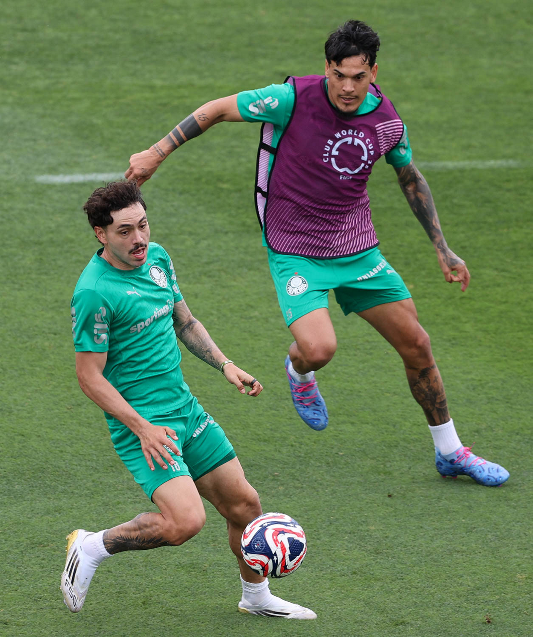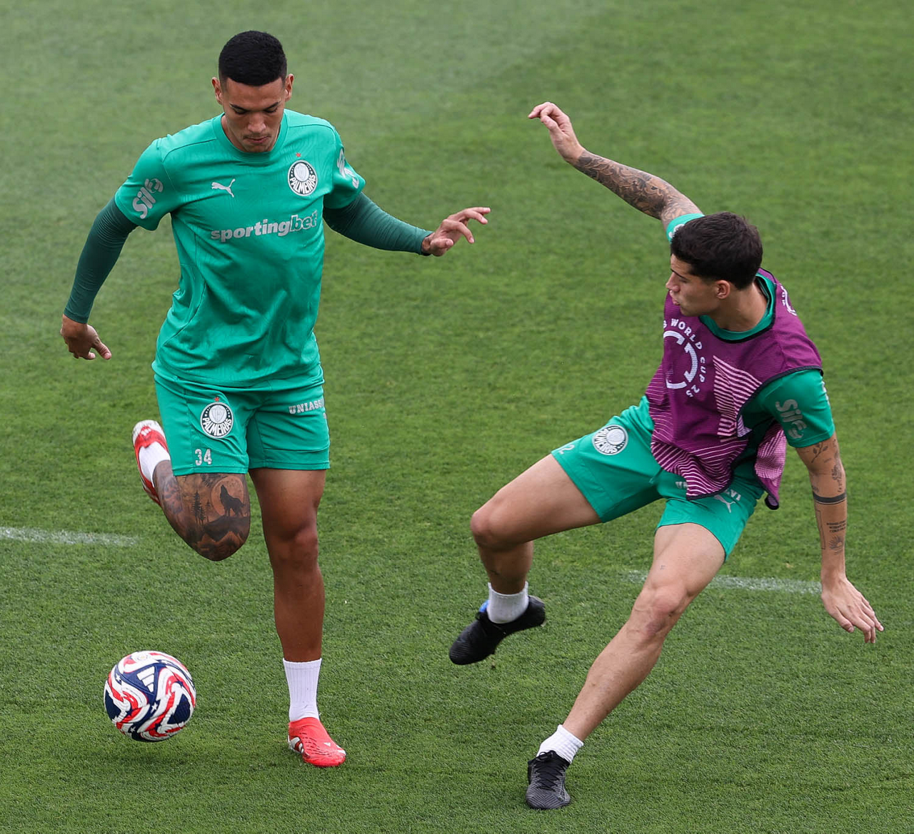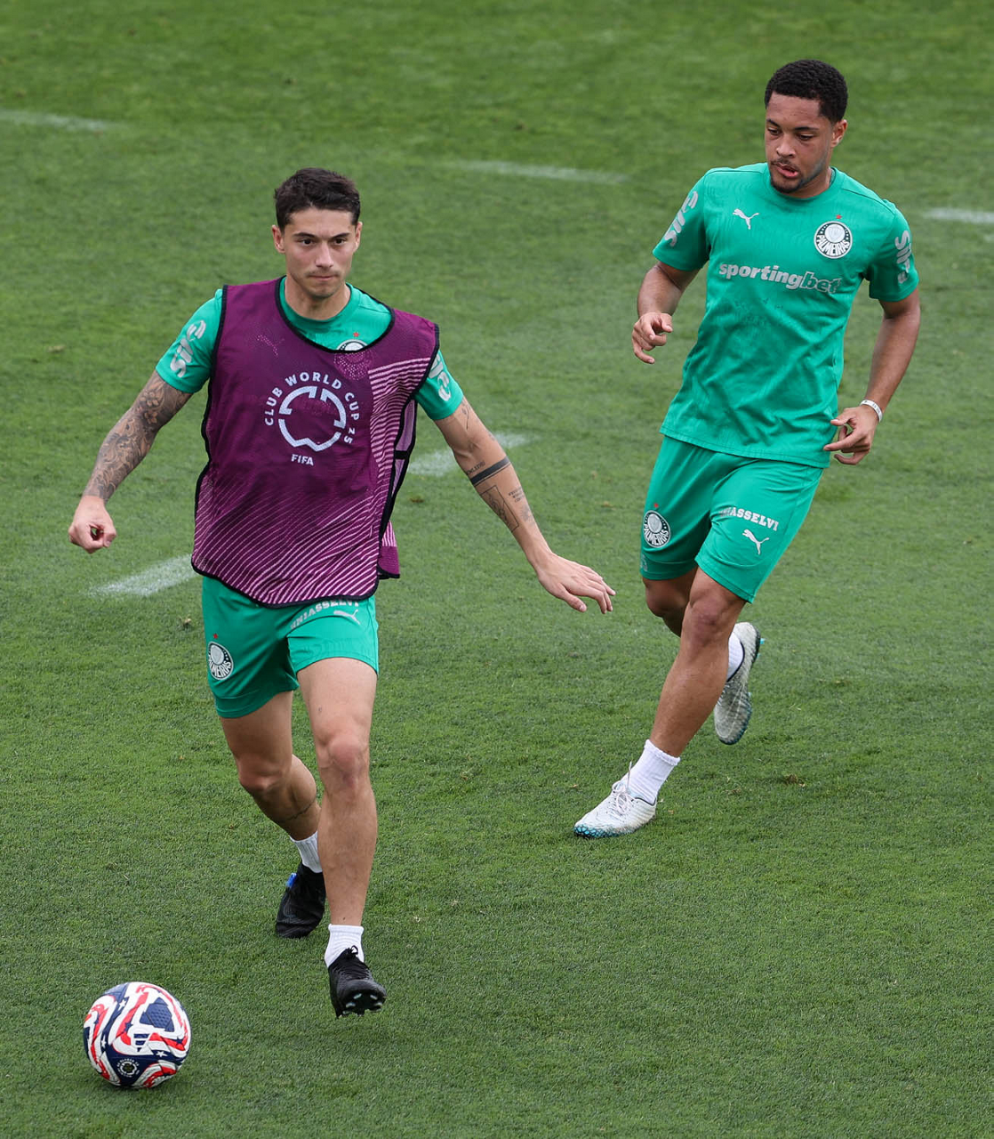 Os jogadores Emiliano Martínez e Vitor Roque (D), da SE Palmeiras, durante treinamento, na Universidade da Carolina do Norte. (Foto: Cesar Greco/Palmeiras/by Canon)