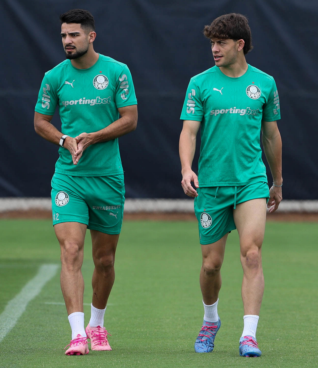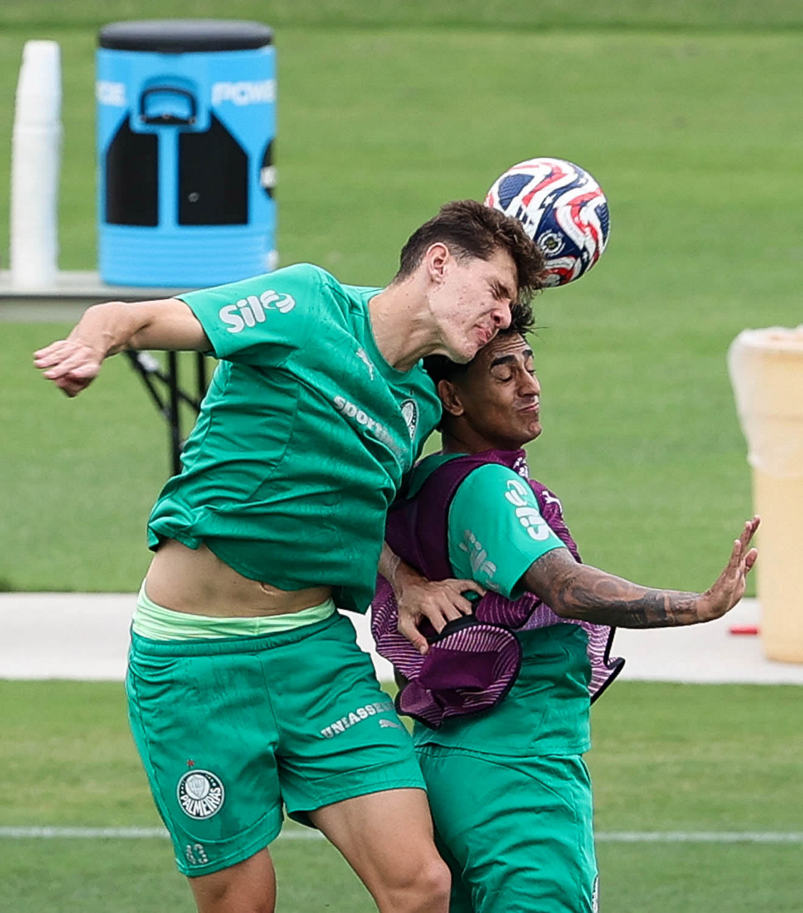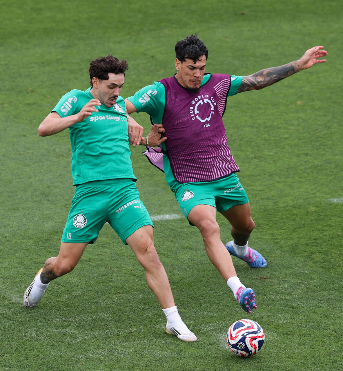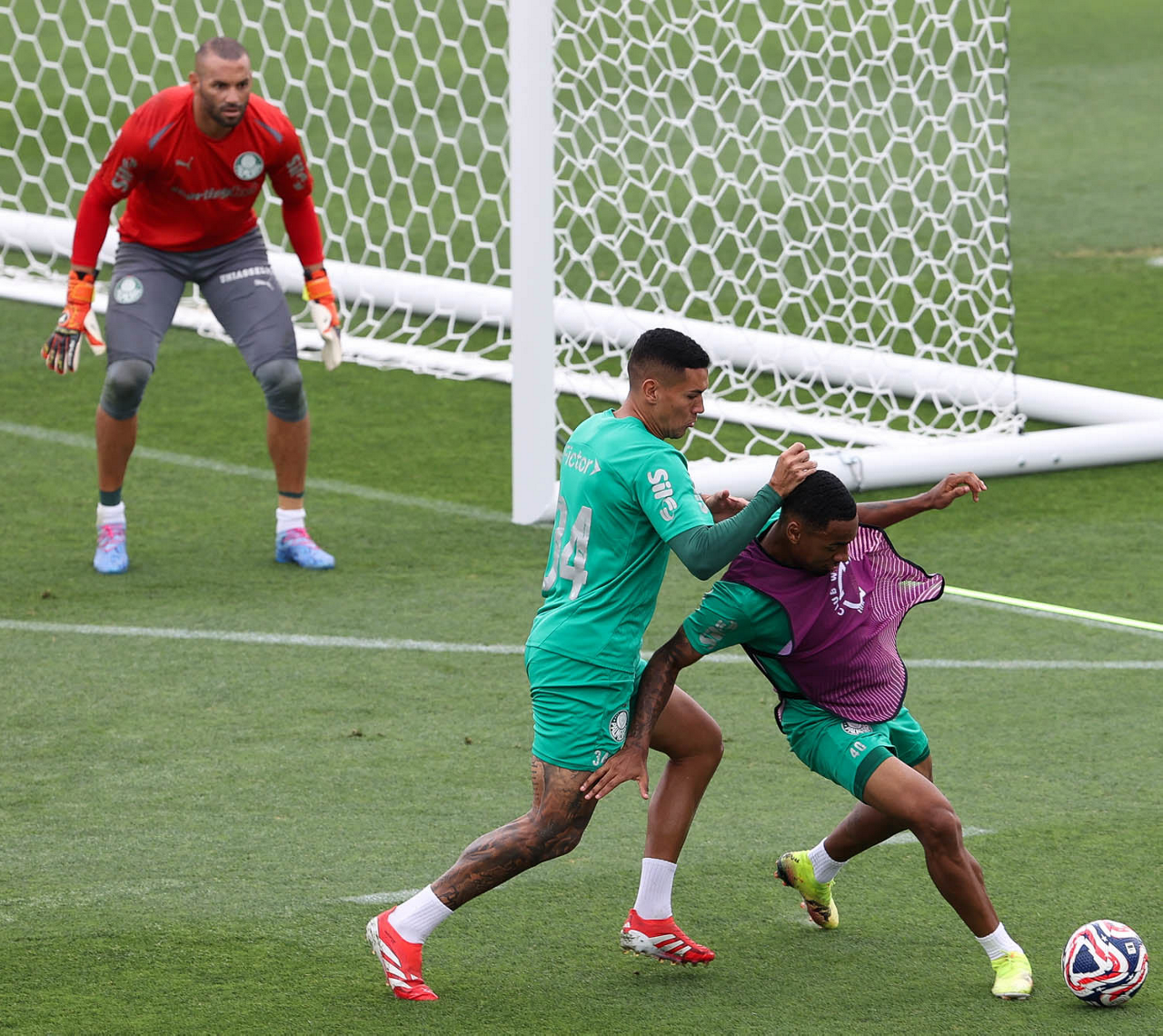 Os jogadores Emiliano Martínez e Vitor Roque (D), da SE Palmeiras, durante treinamento, na Universidade da Carolina do Norte. (Foto: Cesar Greco/Palmeiras/by Canon)