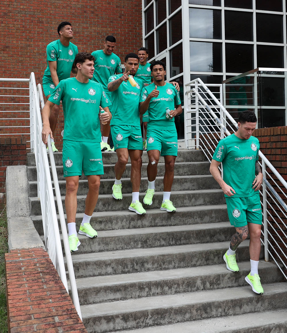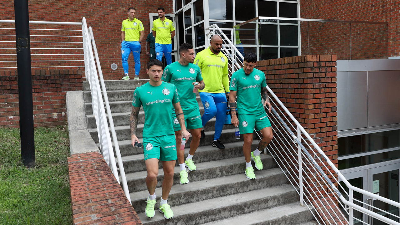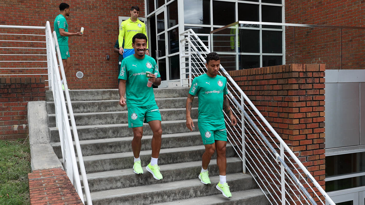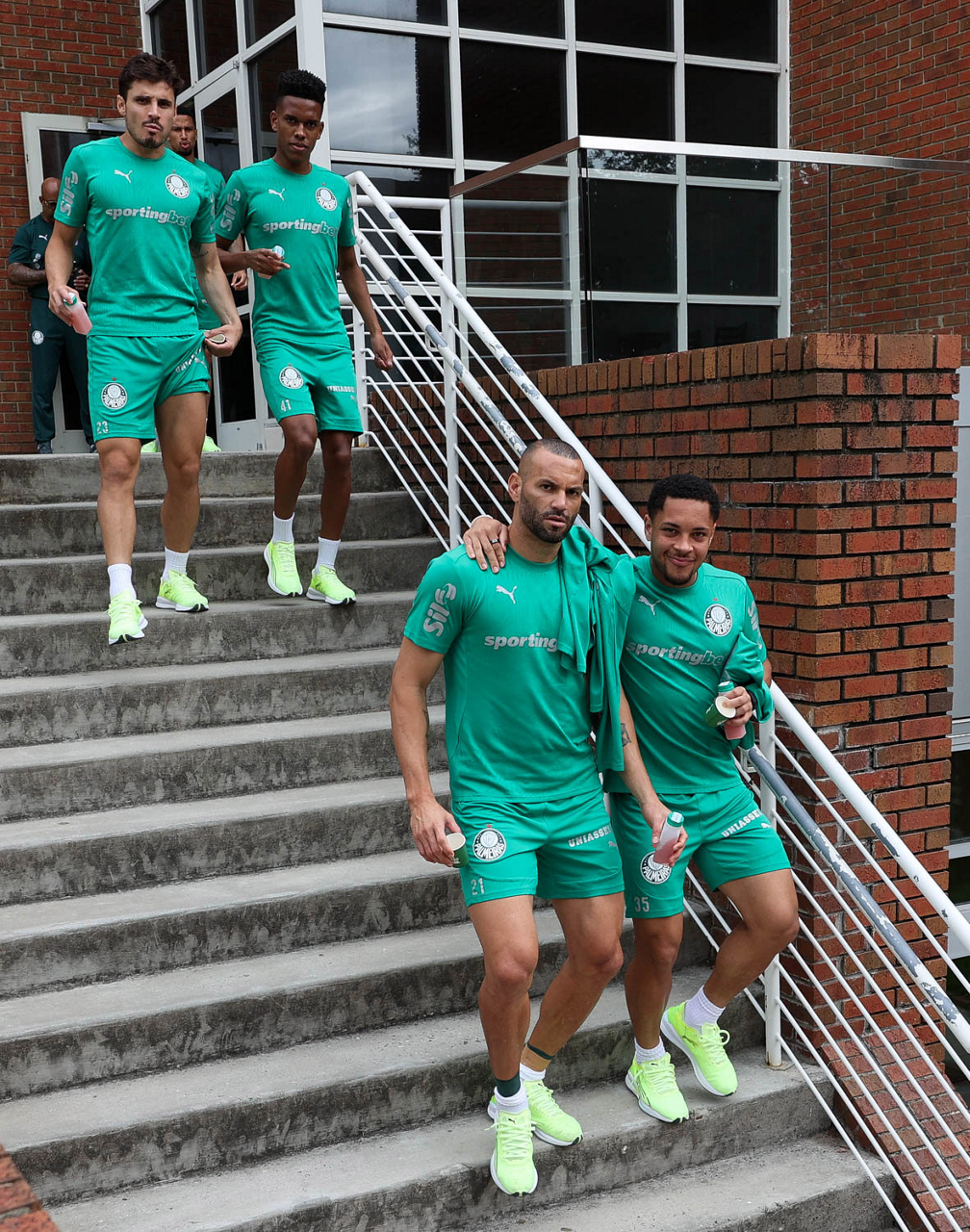Os jogadores Raphael Veiga, Estêvão, Weverton e Vitor Roque (E/D), da SE Palmeiras, durante treinamento, na Universidade da Carolina do Norte. (Foto: Cesar Greco/Palmeiras/by Canon)