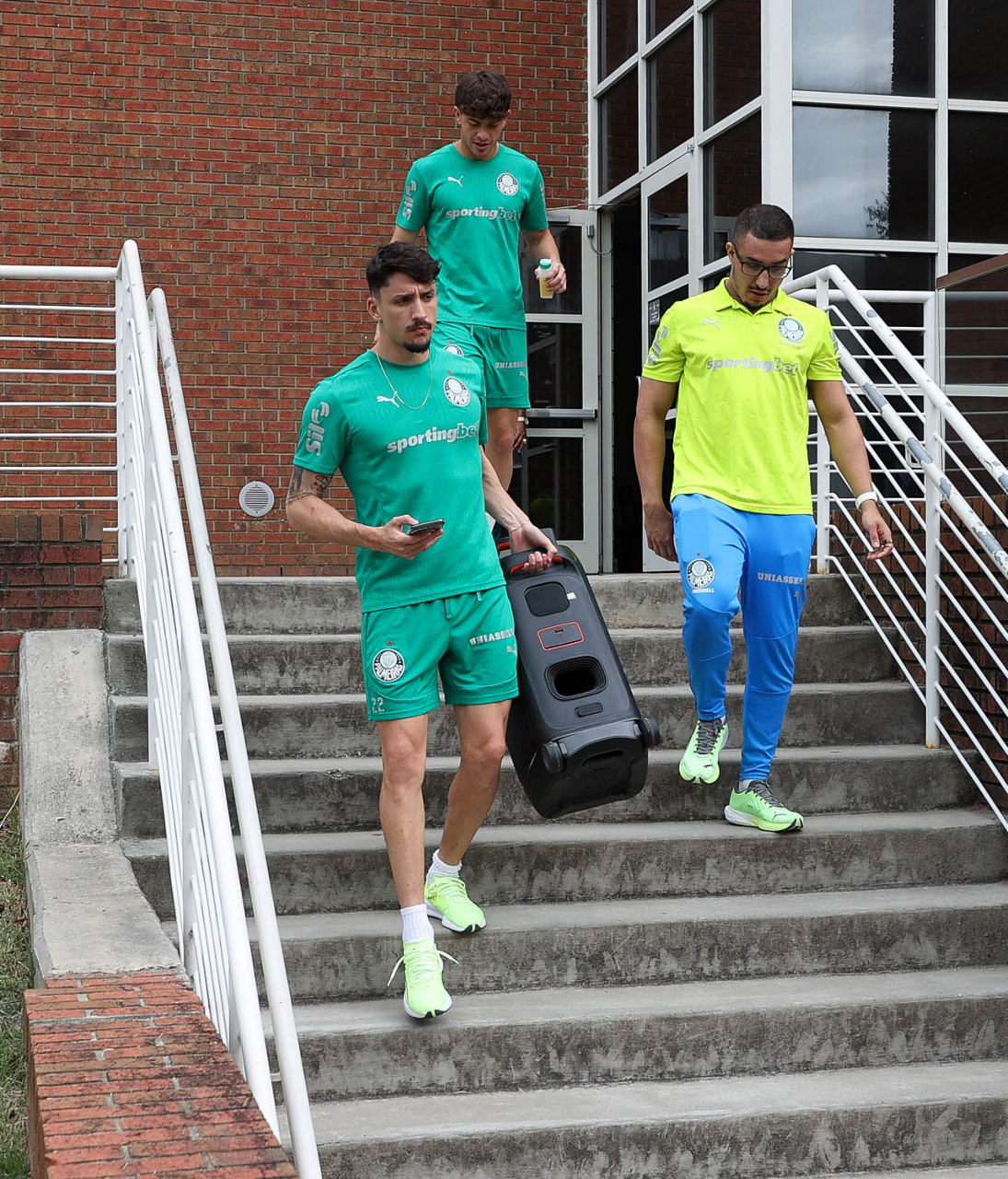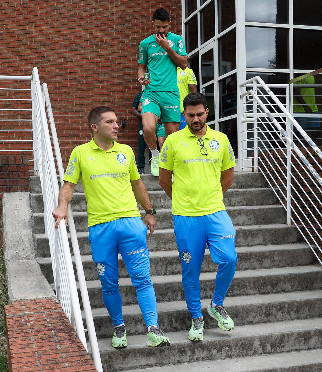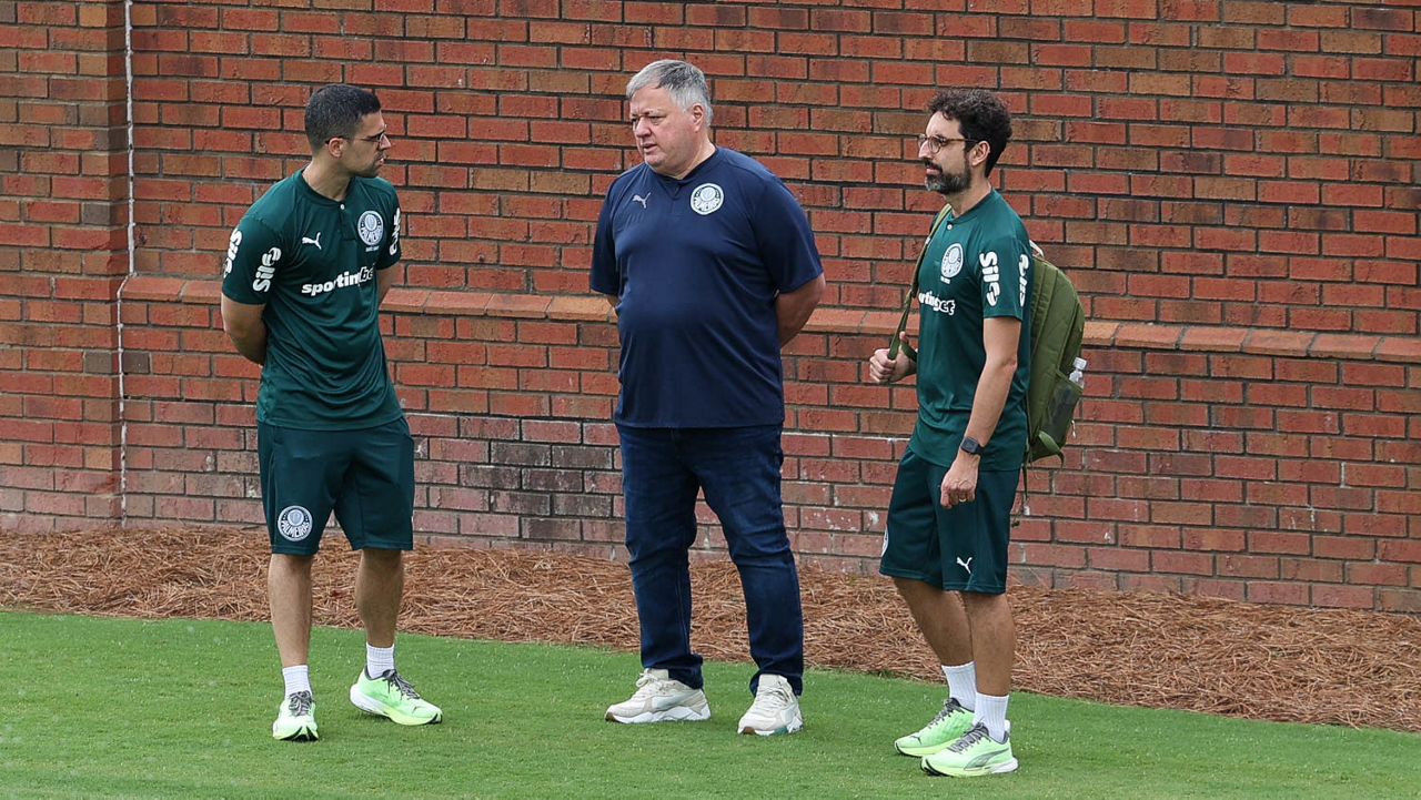 Os assessores de imprensa Daniel Romeu e Luan Sousa (E e D) e o diretor de futebol Anderson Barros (C), da SE Palmeiras, durante treinamento, na Universidade da Carolina do Norte. (Foto: Cesar Greco/Palmeiras/by Canon)