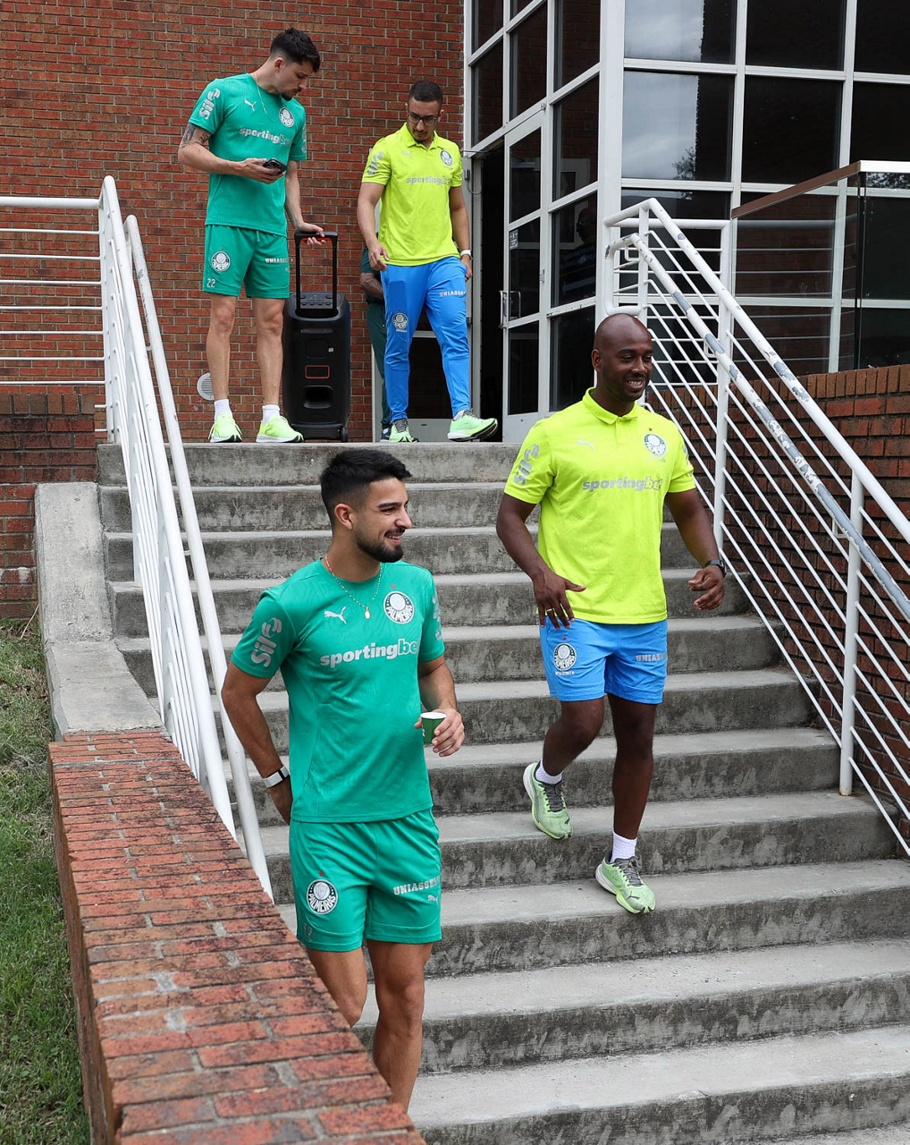 Os jogadores Emiliano Martínez, Paulinho e Gustavo Gómez (E/D) e o massagista Alan Gabriel (C), da SE Palmeiras, durante treinamento, na Universidade da Carolina do Norte. (Foto: Cesar Greco/Palmeiras/by Canon)