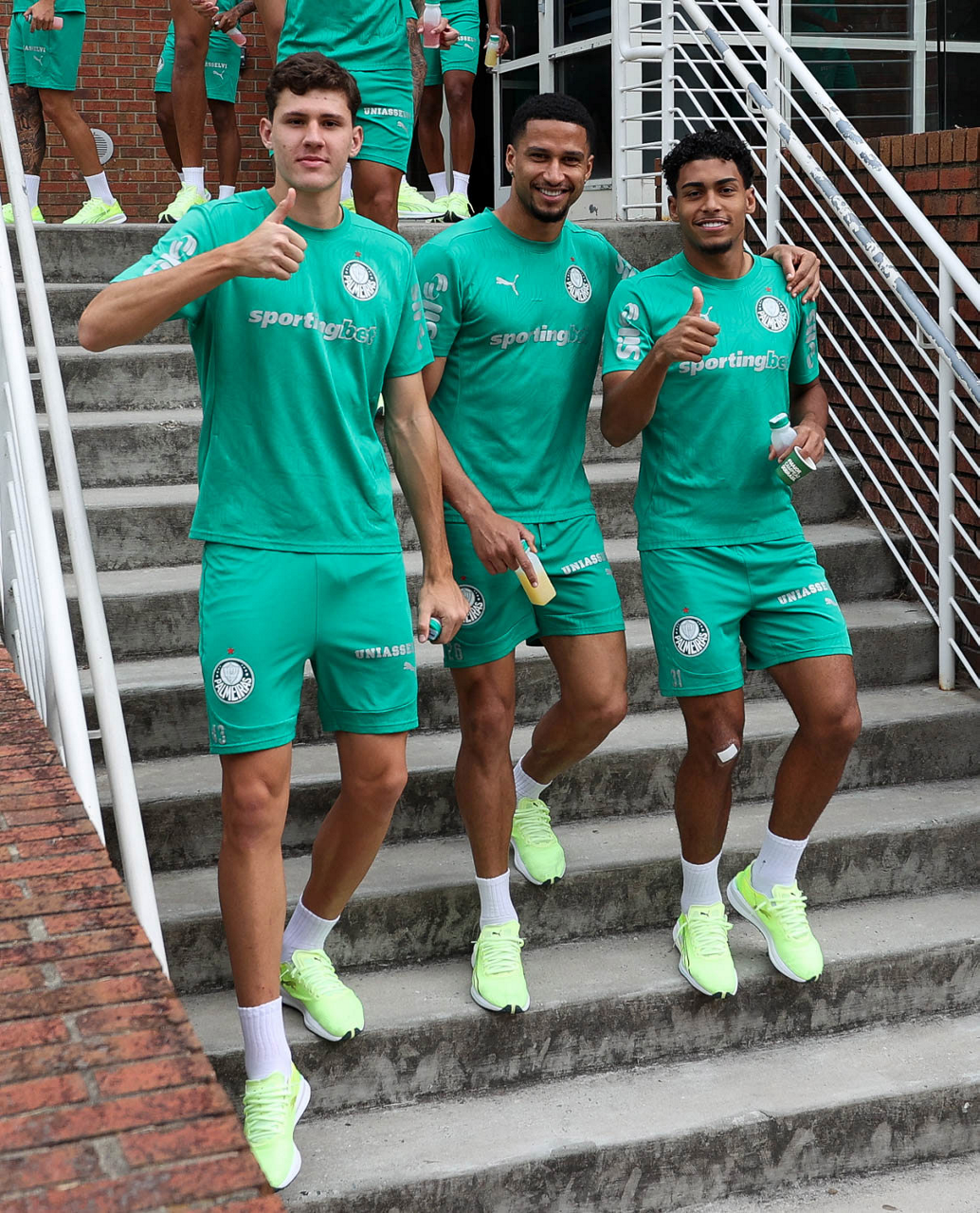 Os jogadores Benedetti, Murilo e Luighi (E/D), da SE Palmeiras, durante treinamento, na Universidade da Carolina do Norte. (Foto: Cesar Greco/Palmeiras/by Canon)