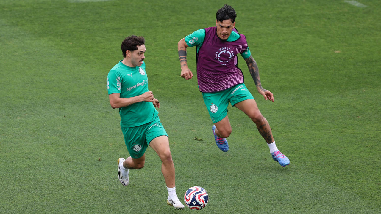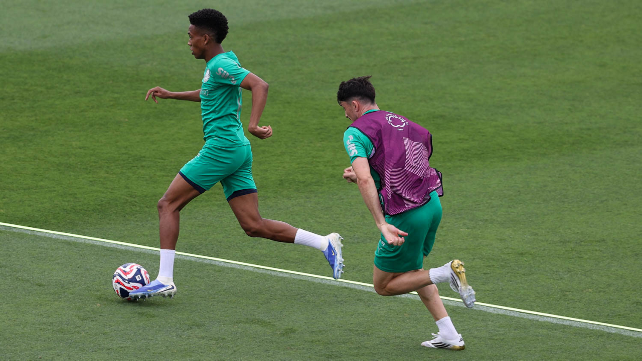 Os jogadores Raphael Veiga e Estêvão (D), da SE Palmeiras, durante treinamento, na Universidade da Carolina do Norte. (Foto: Cesar Greco/Palmeiras/by Canon)