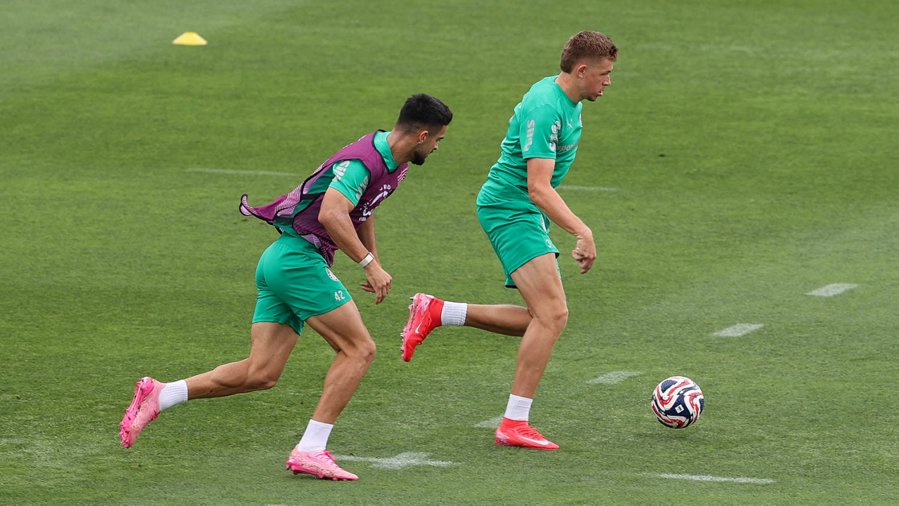 Os jogadores Flaco López e Bruno Fuchs (D), da SE Palmeiras, durante treinamento, na Universidade da Carolina do Norte. (Foto: Cesar Greco/Palmeiras/by Canon)