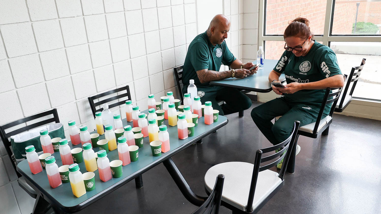 O segurança TKS e a podóloga Rosângela Rego (D), da SE Palmeiras, durante treinamento, na Universidade da Carolina do Norte. (Foto: Cesar Greco/Palmeiras/by Canon)
