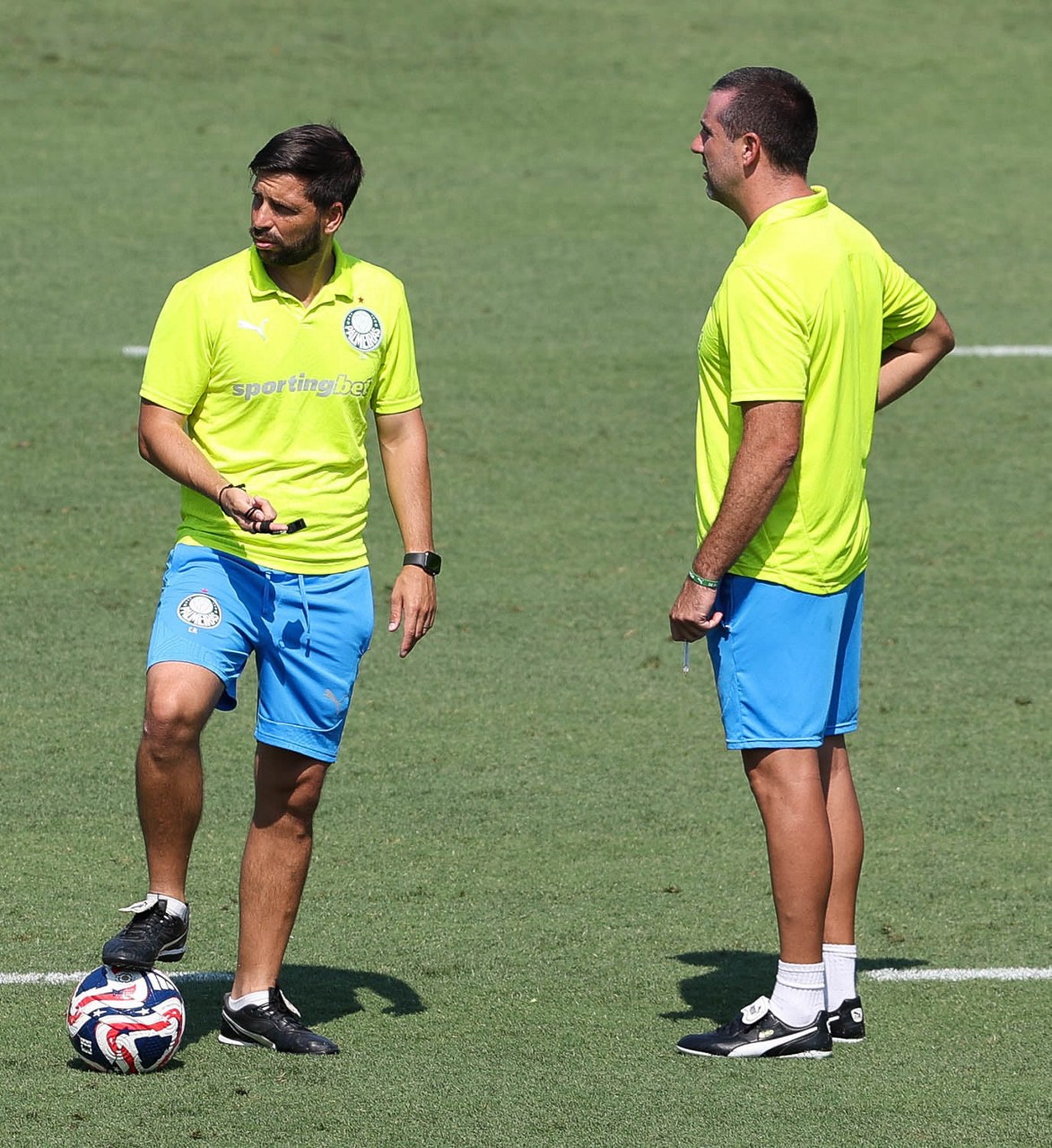 O auxiliar técnico Carlos Martinho e o preparador físico João Martins (D), da SE Palmeiras, durante treinamento, na Universidade da Carolina do Norte. (Foto: Cesar Greco/Palmeiras/by Canon)