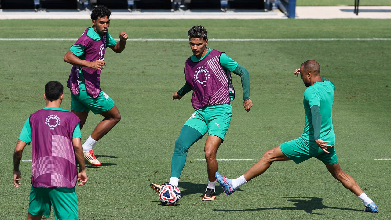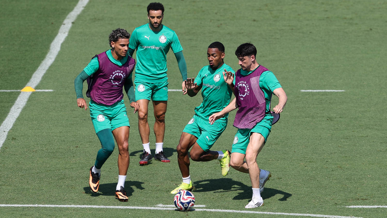Os jogadores Richard Ríos, Felipe Anderson, Allan e Joaquín Piquerez (E/D), da SE Palmeiras, durante treinamento, na Universidade da Carolina do Norte. (Foto: Cesar Greco/Palmeiras/by Canon)