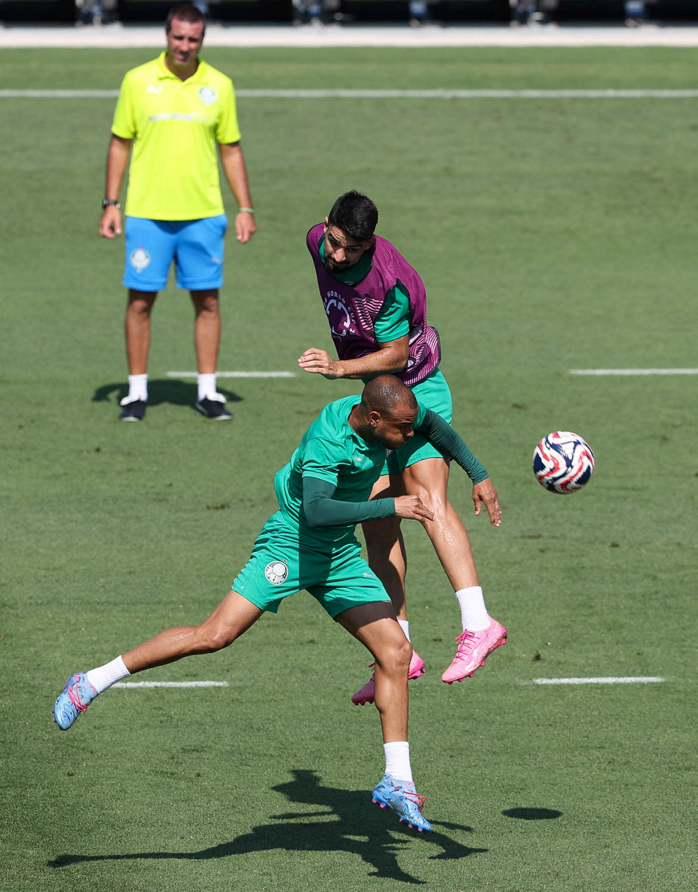 Os jogadores Emiliano Martínez e Naves (D), da SE Palmeiras, durante treinamento, na Universidade da Carolina do Norte. (Foto: Cesar Greco/Palmeiras/by Canon)