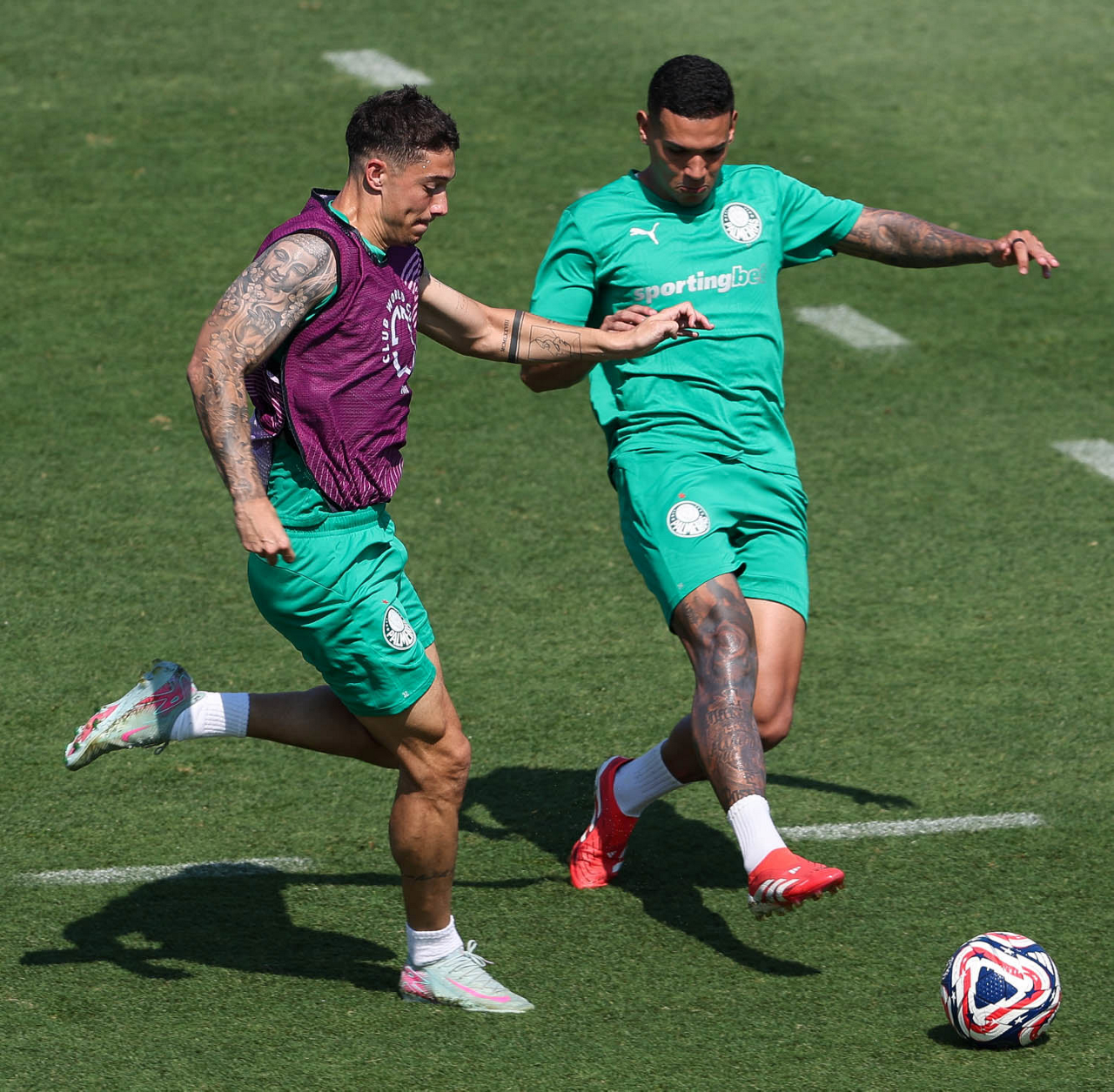 Os jogadores Mayke e Flaco López (D), da SE Palmeiras, durante treinamento, na Universidade da Carolina do Norte. (Foto: Cesar Greco/Palmeiras/by Canon)