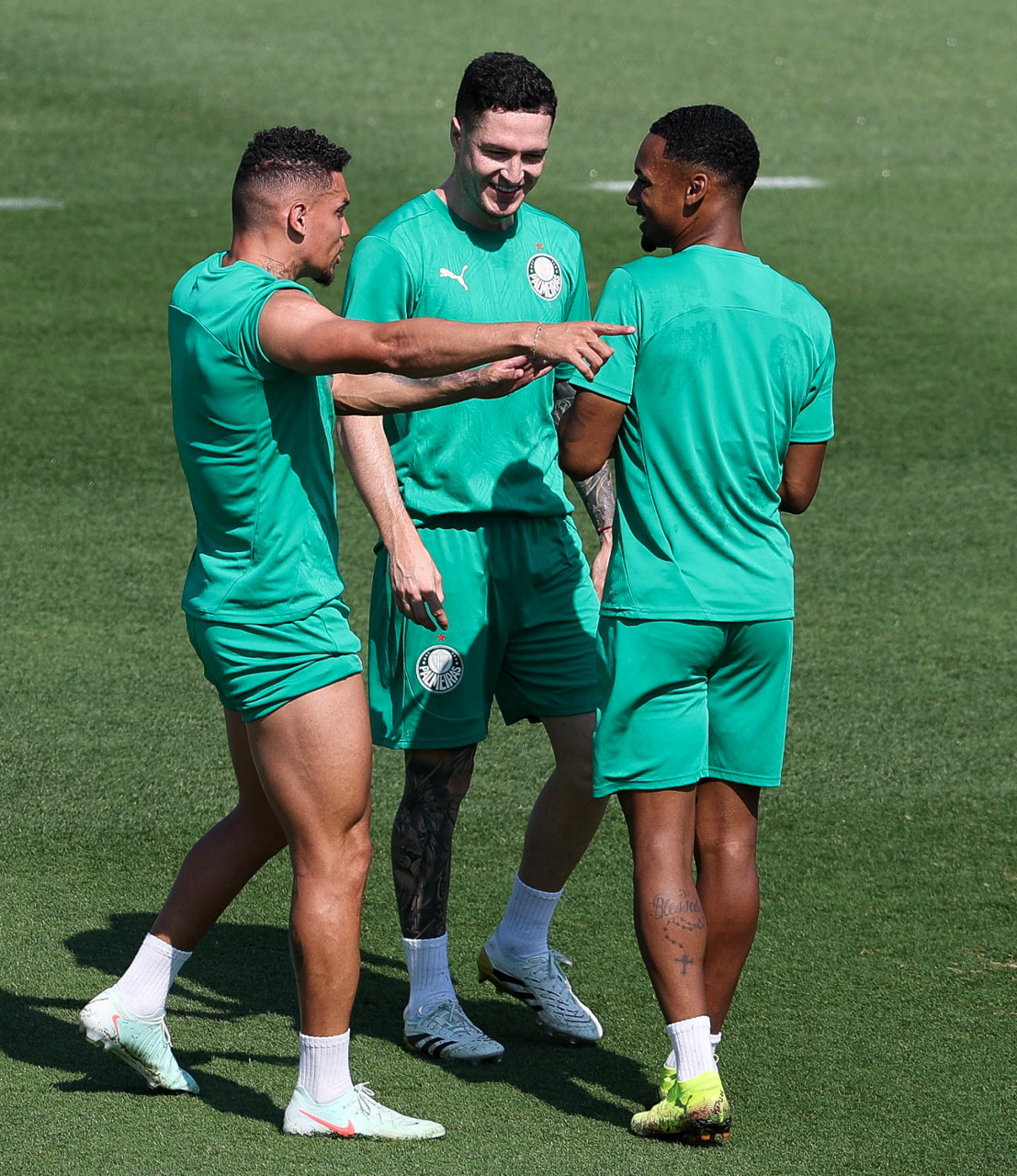 Os jogadores Luighi, Richard Ríos e Mayke (E/D), da SE Palmeiras, durante treinamento, na Universidade da Carolina do Norte. (Foto: Cesar Greco/Palmeiras/by Canon)
