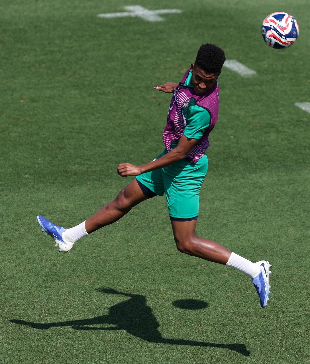 O jogador Vitor Roque, da SE Palmeiras, durante treinamento, na Universidade da Carolina do Norte. (Foto: Cesar Greco/Palmeiras/by Canon)