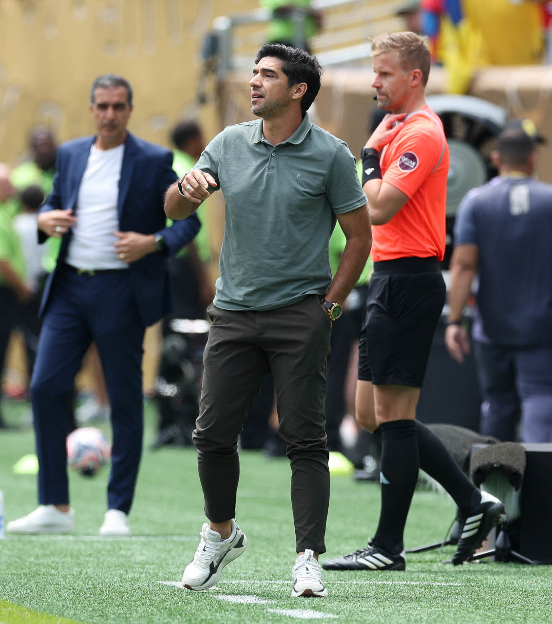 O médico Gilberto Cunha e o preparador físico Marco Aurélio (D), da SE Palmeiras, em jogo contra a equipe do Botafogo FR, durante partida válida pela oitava de final, da Copa do Mundo de Clubes da FIFA, no Lincoln Financial Field. (Foto: Cesar Greco/Palmeiras/by Canon)