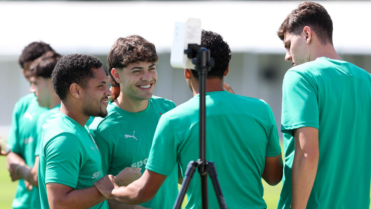 Os jogadores Vitor Roque, Agustín Giay, Luighi e Benedetti (E/D), da SE Palmeiras, durante treinamento, no CT do Philadelphia Eagles. (Foto: Cesar Greco/Palmeiras/by Canon)