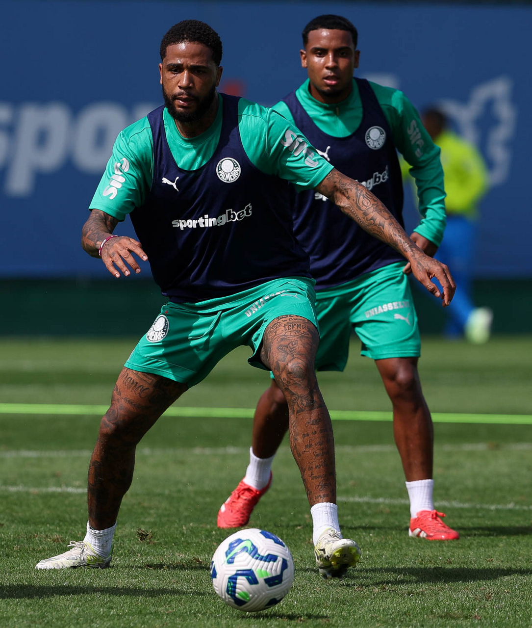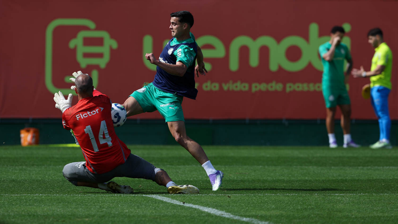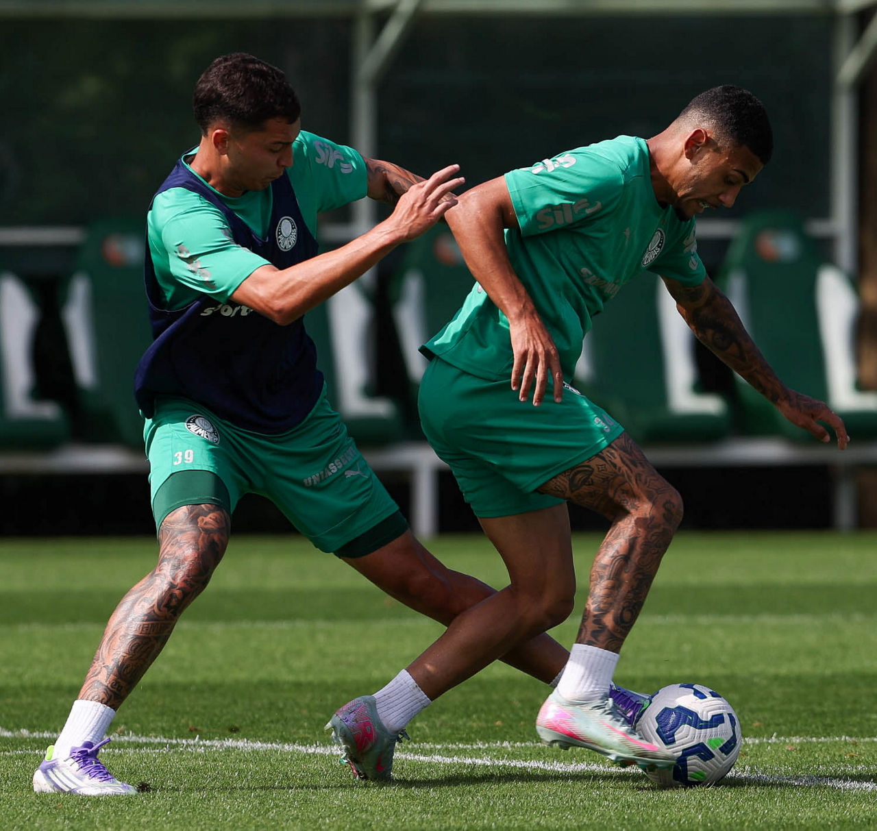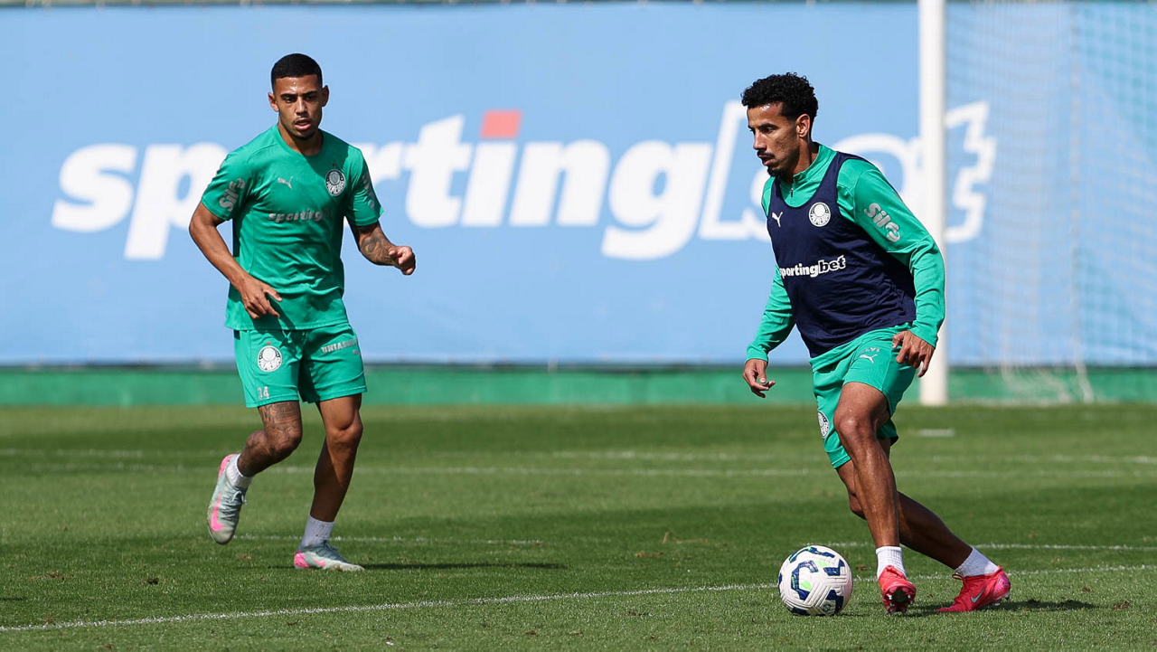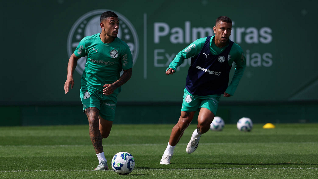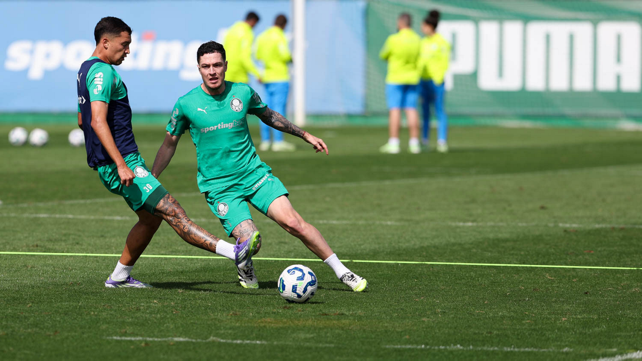 Os jogadores Agustín Giay e Ramón Sosa (D), da SE Palmeiras, durante treinamento, na Academia de Futebol. (Foto: Cesar Greco/Palmeiras/by Canon)