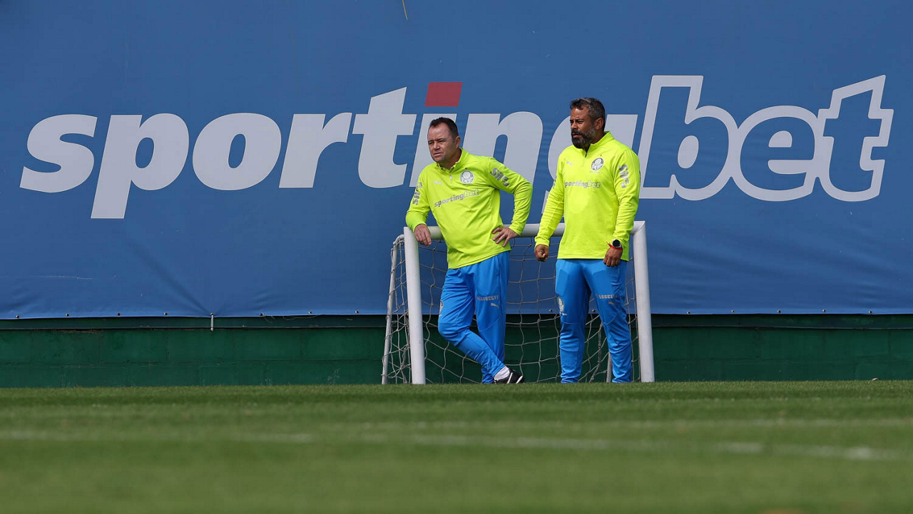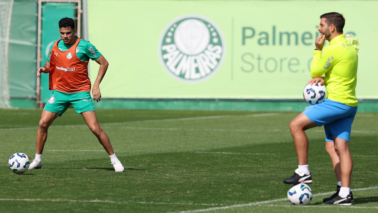 O auxiliar técnico Andrey Lopes e o coordenador científico Daniel Gonçalves (D), da SE Palmeiras, durante treinamento, na Academia de Futebol. (Foto: Cesar Greco/Palmeiras/by Canon)