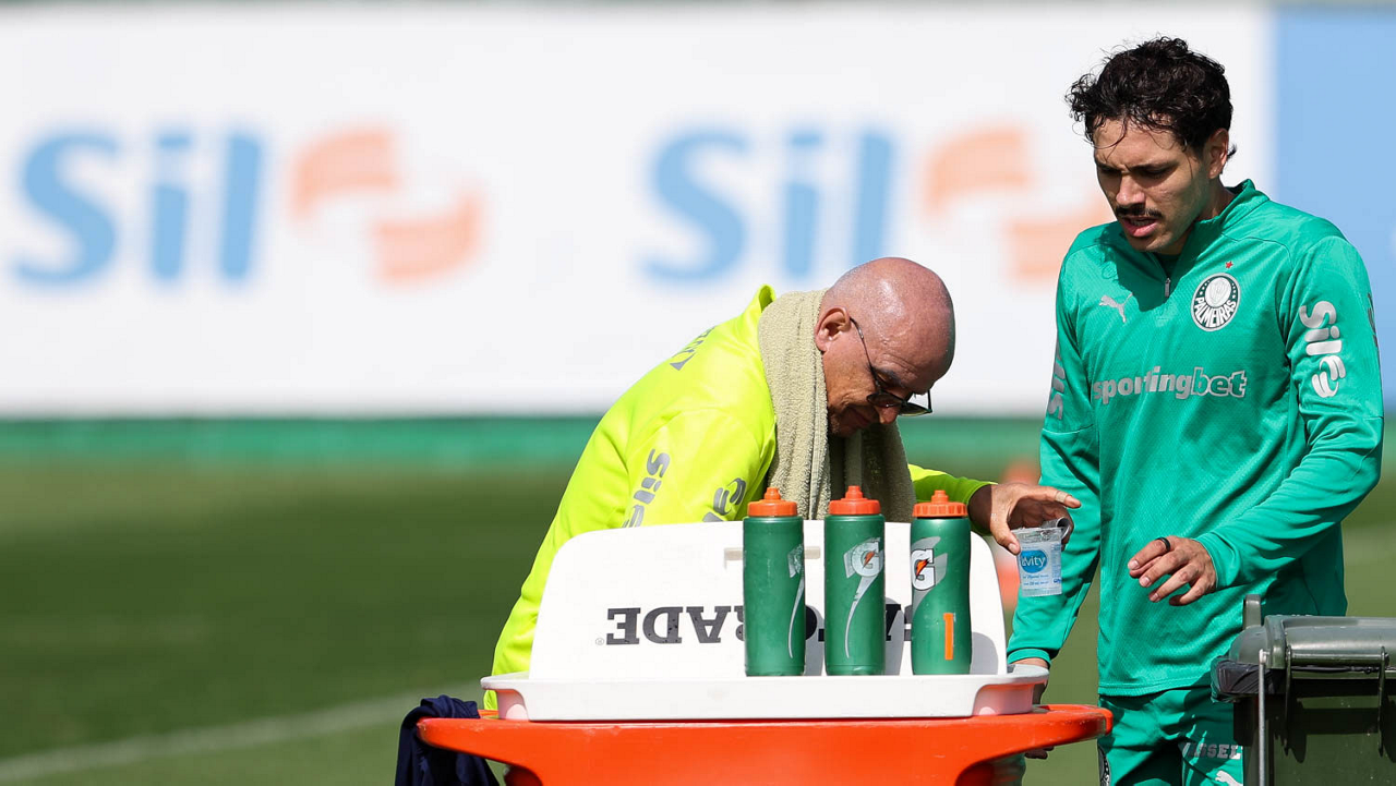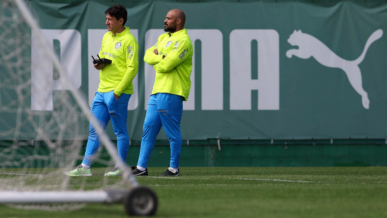 O analista de desempenho Rogerio Abreu e o massagista Alan Gabriel (D), da SE Palmeiras, durante treinamento, na Academia de Futebol. (Foto: Cesar Greco/Palmeiras/by Canon)