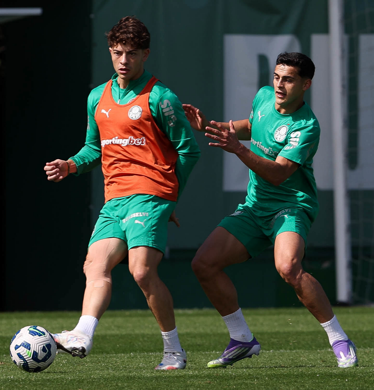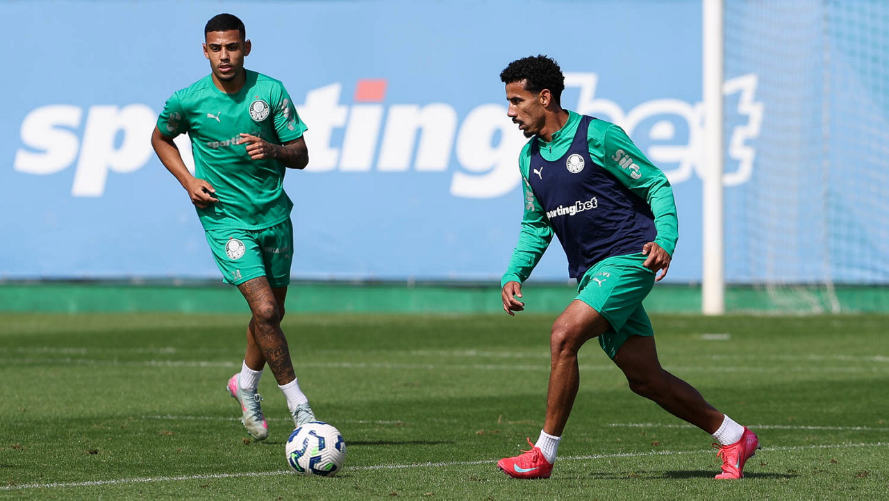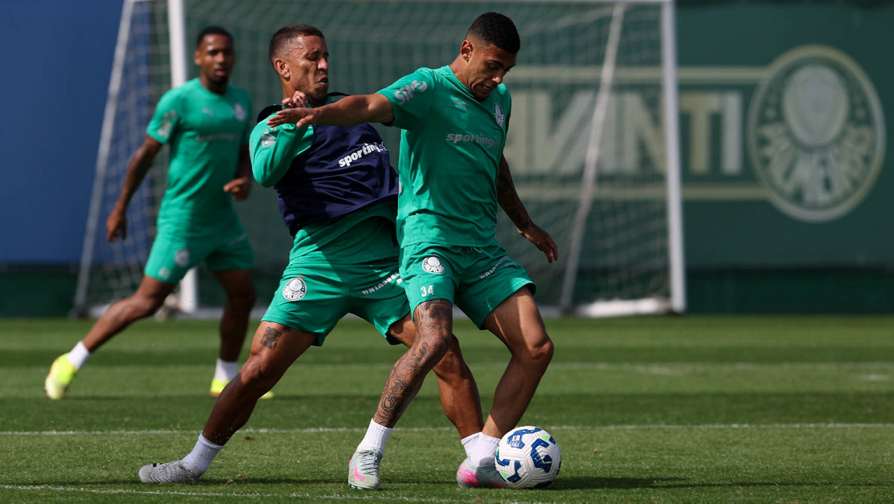 Os jogadores Lucas Evangelista e Gustavo Gómez (D), da SE Palmeiras, durante treinamento, na Academia de Futebol. (Foto: Cesar Greco/Palmeiras/by Canon)
