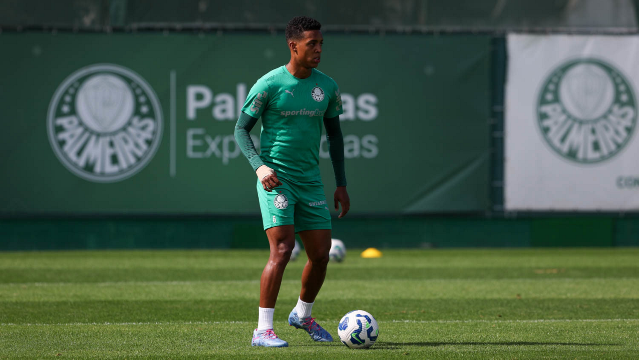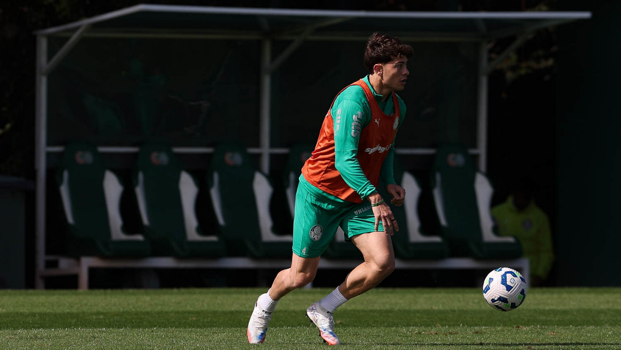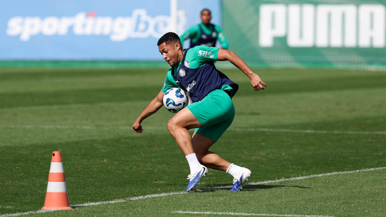 O jogador Vitor Roque, da SE Palmeiras, durante treinamento, na Academia de Futebol. (Foto: Cesar Greco/Palmeiras/by Canon)