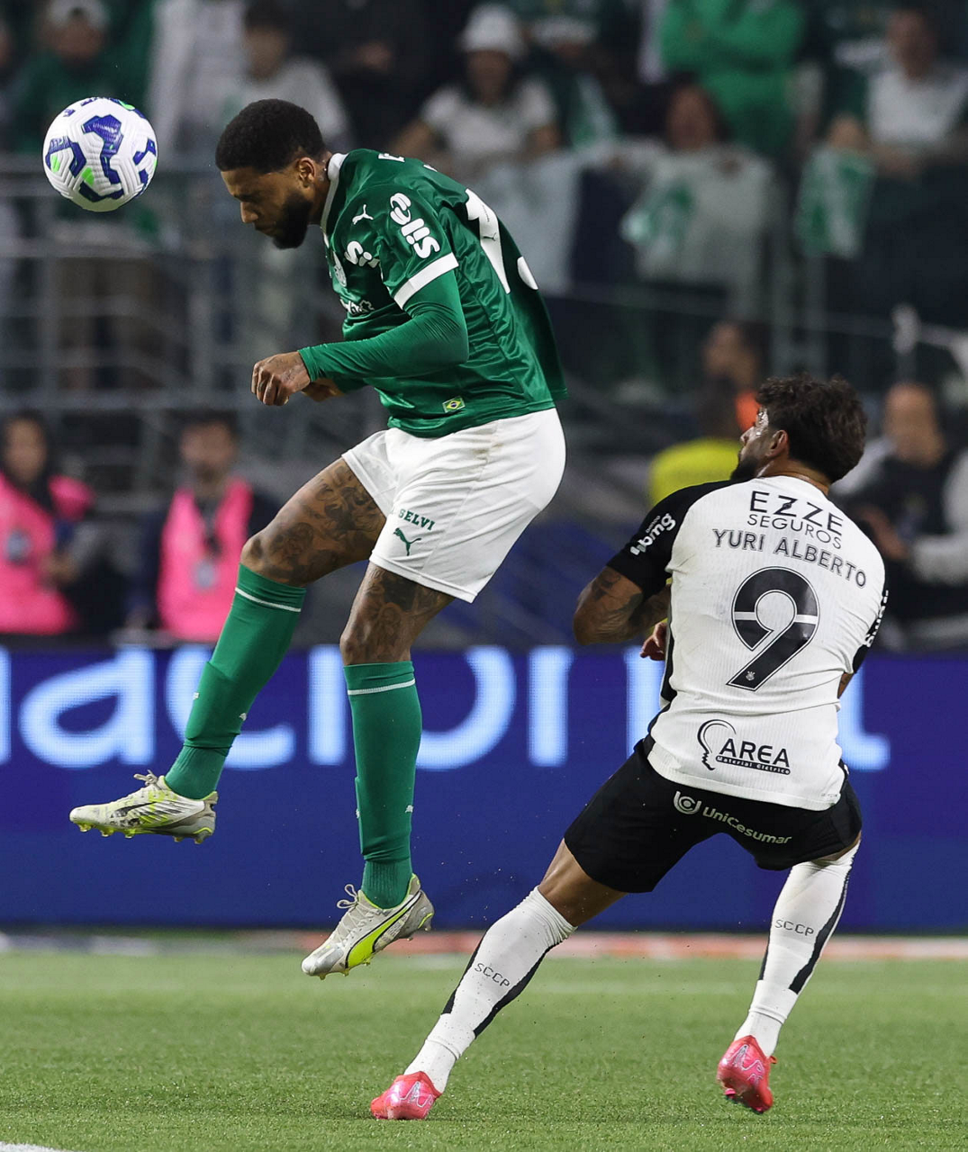 O jogador Mauricio, da SE Palmeiras, disputa bola com o jogador do SC Corinthians P, durante partida válida pelas oitavas de final, da Copa do Brasil, na arena Allianz Parque. (Foto: Cesar Greco/Palmeiras/by Canon)