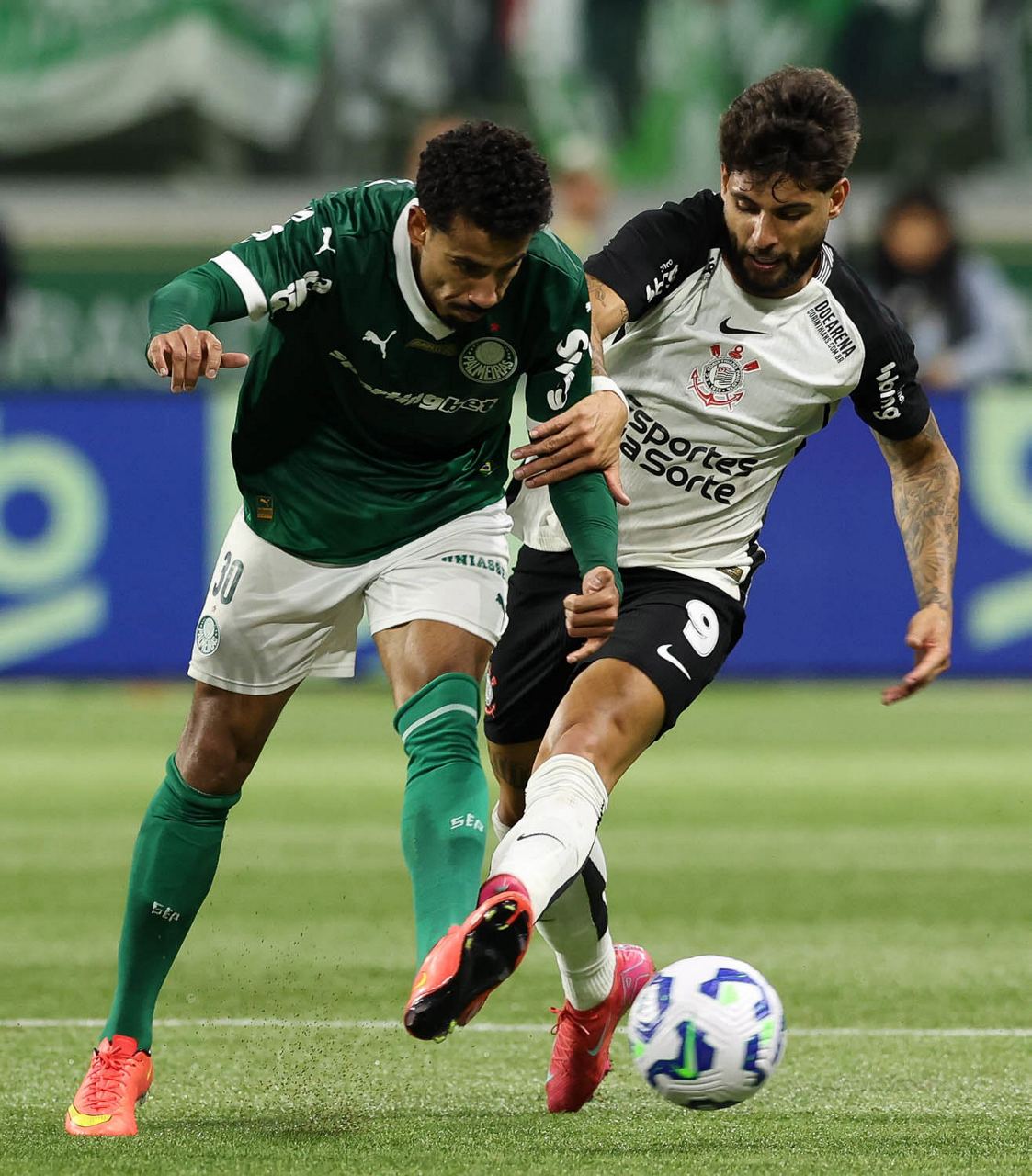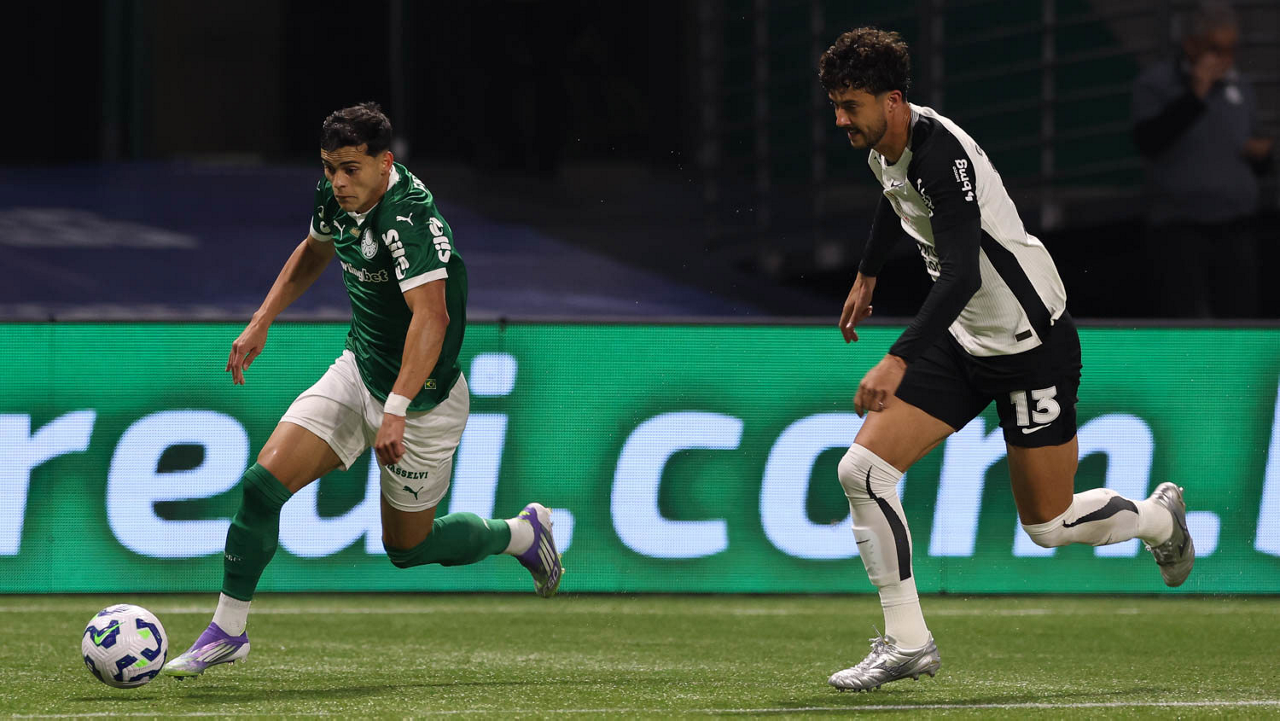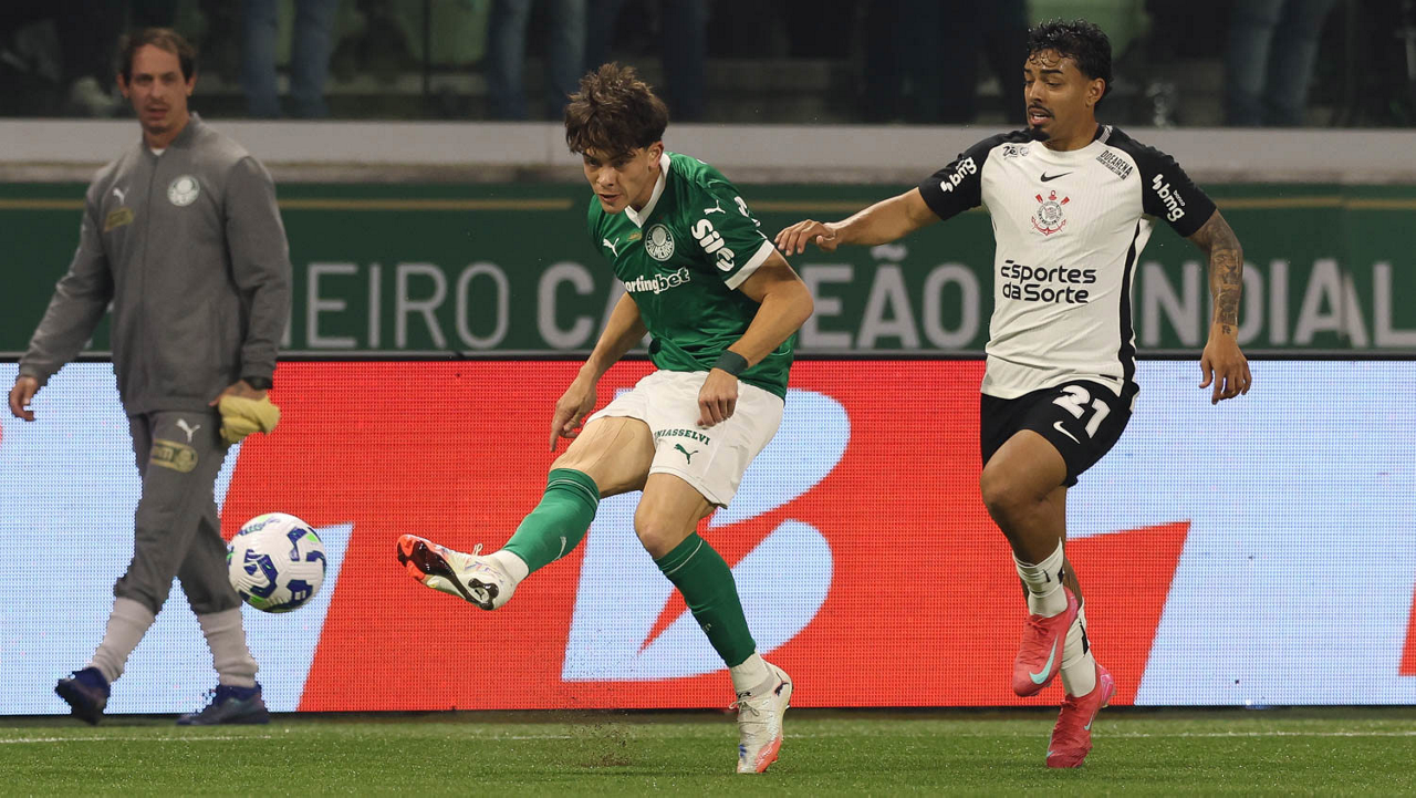 O jogador Vitor Roque, da SE Palmeiras, disputa bola com o jogador do SC Corinthians P, durante partida válida pelas oitavas de final, da Copa do Brasil, na arena Allianz Parque. (Foto: Cesar Greco/Palmeiras/by Canon)