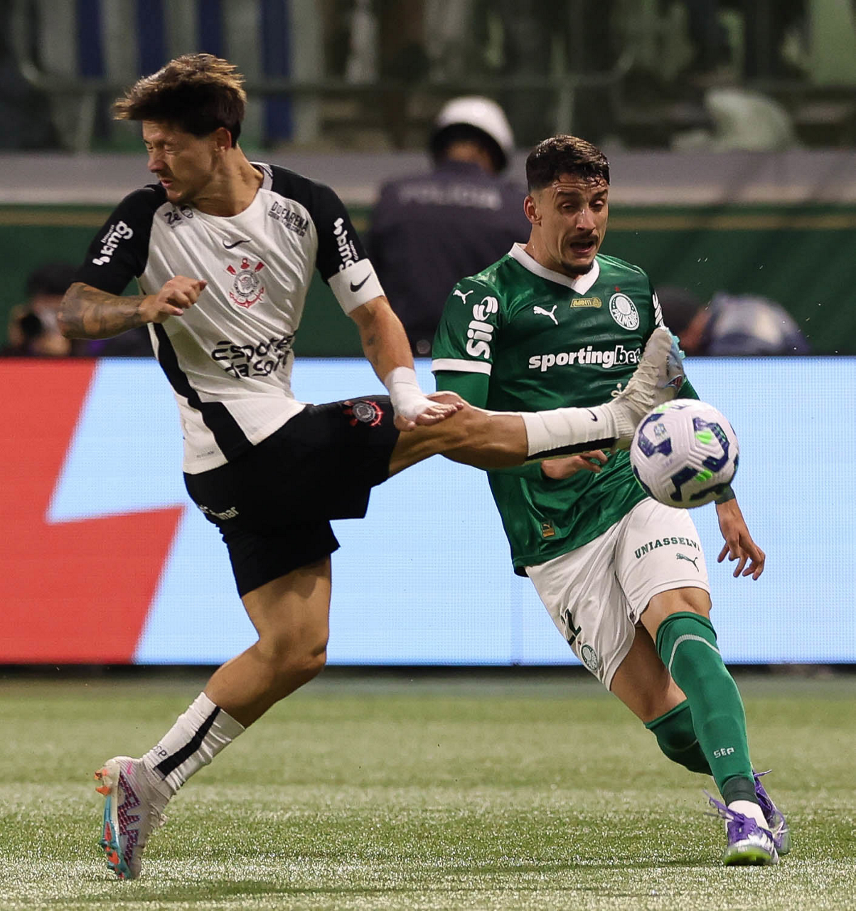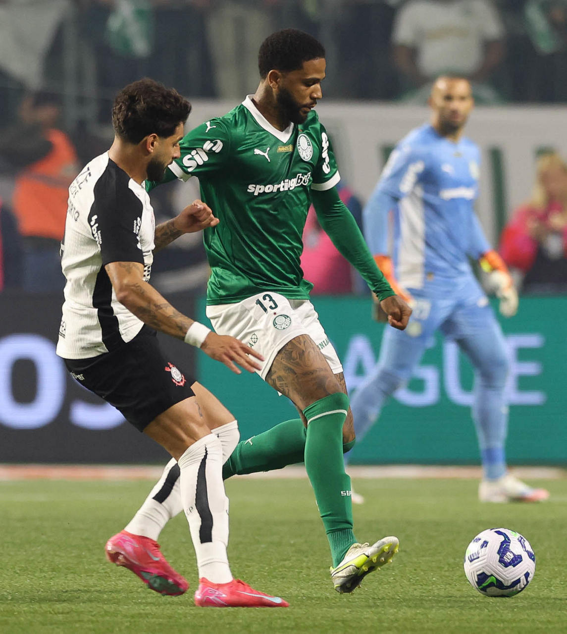 O jogador Joaquín Piquerez, da SE Palmeiras, disputa bola com o jogador do SC Corinthians P, durante partida válida pelas oitavas de final, da Copa do Brasil, na arena Allianz Parque. (Foto: Cesar Greco/Palmeiras/by Canon)