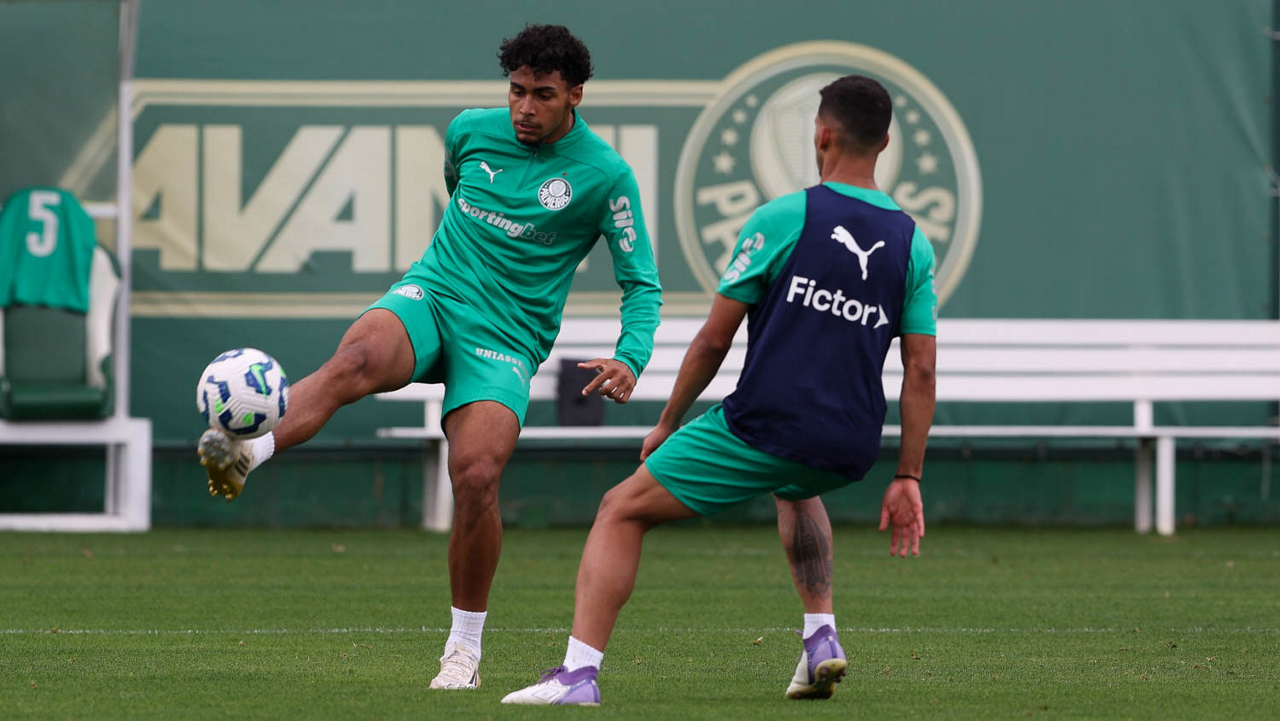 Os jogadores Vitor Roque e Khellven (D), da SE Palmeiras, durante treinamento, na Academia de Futebol. (Foto: Cesar Greco/Palmeiras/by Canon)