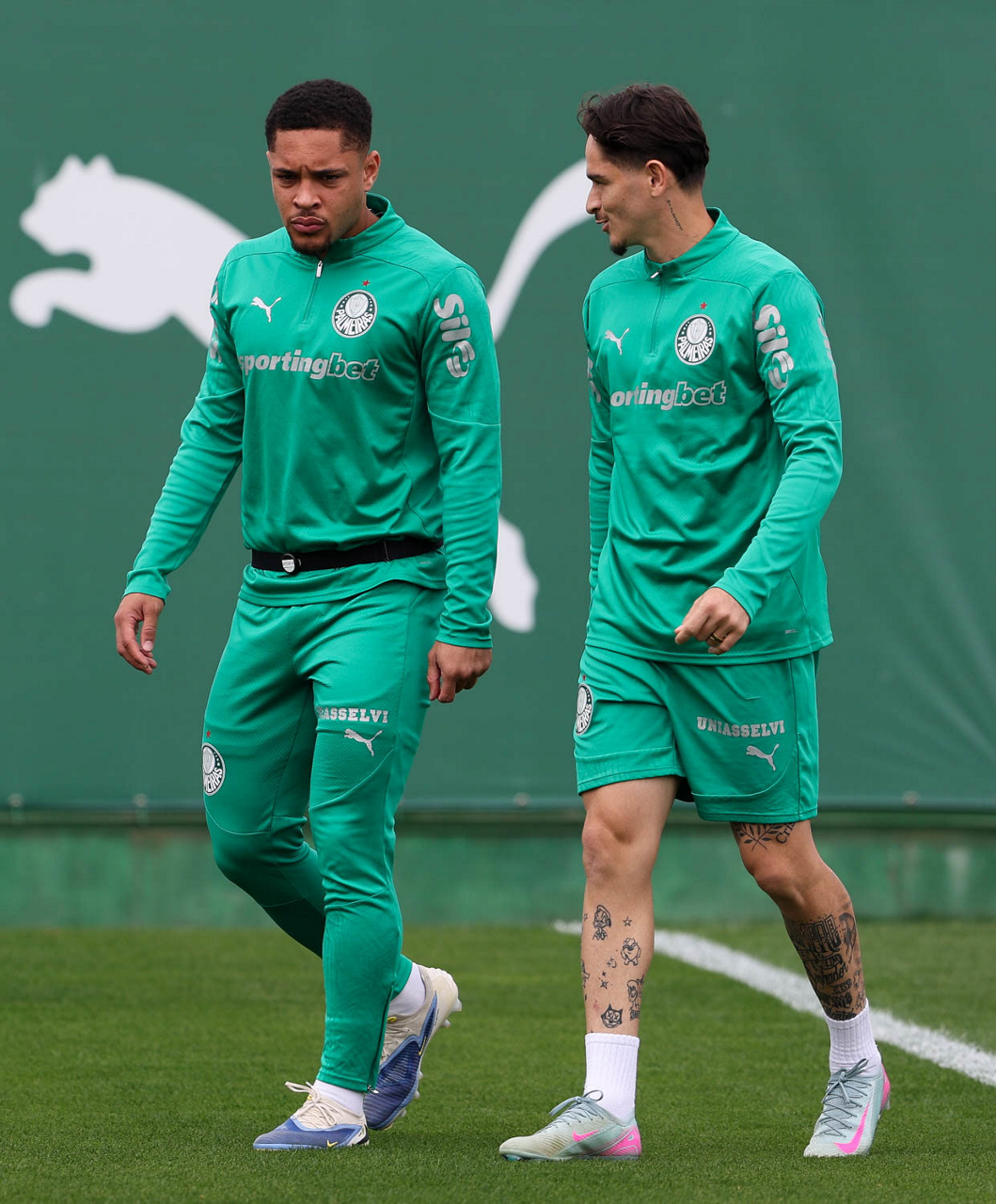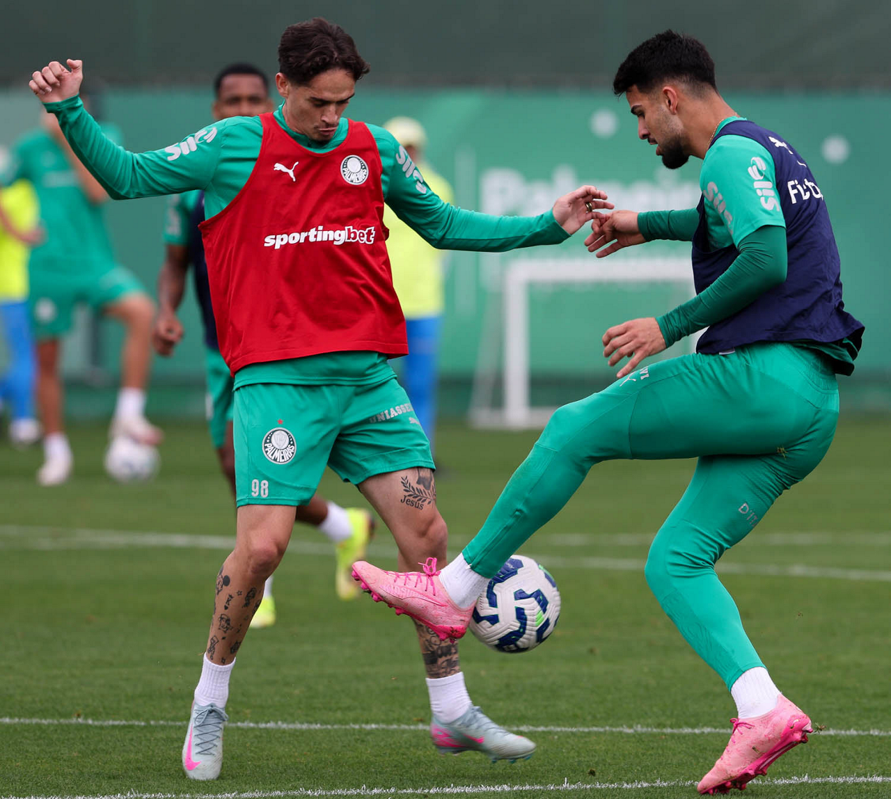 Os jogadores Vitor Roque e Agustín Giay (D), da SE Palmeiras, durante treinamento, na Academia de Futebol. (Foto: Cesar Greco/Palmeiras/by Canon)