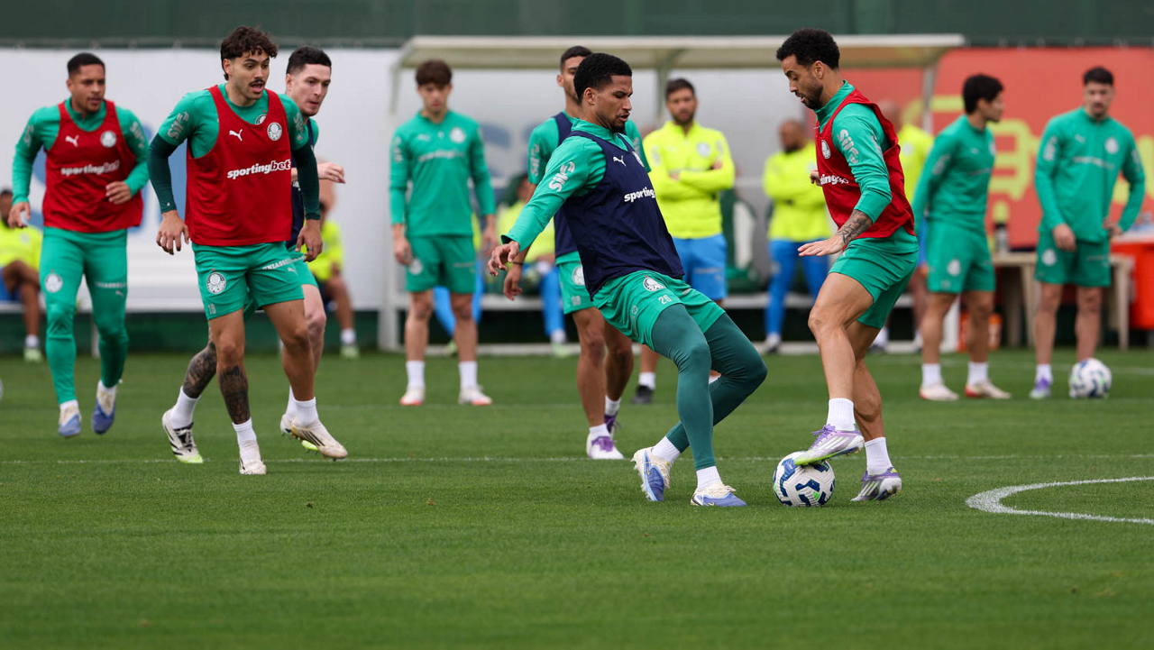 Os jogadores Benedetti, Mauricio, Artur, Vanderlan e Ramón Sosa (E/D), da SE Palmeiras, durante treinamento, na Academia de Futebol. (Foto: Cesar Greco/Palmeiras/by Canon)