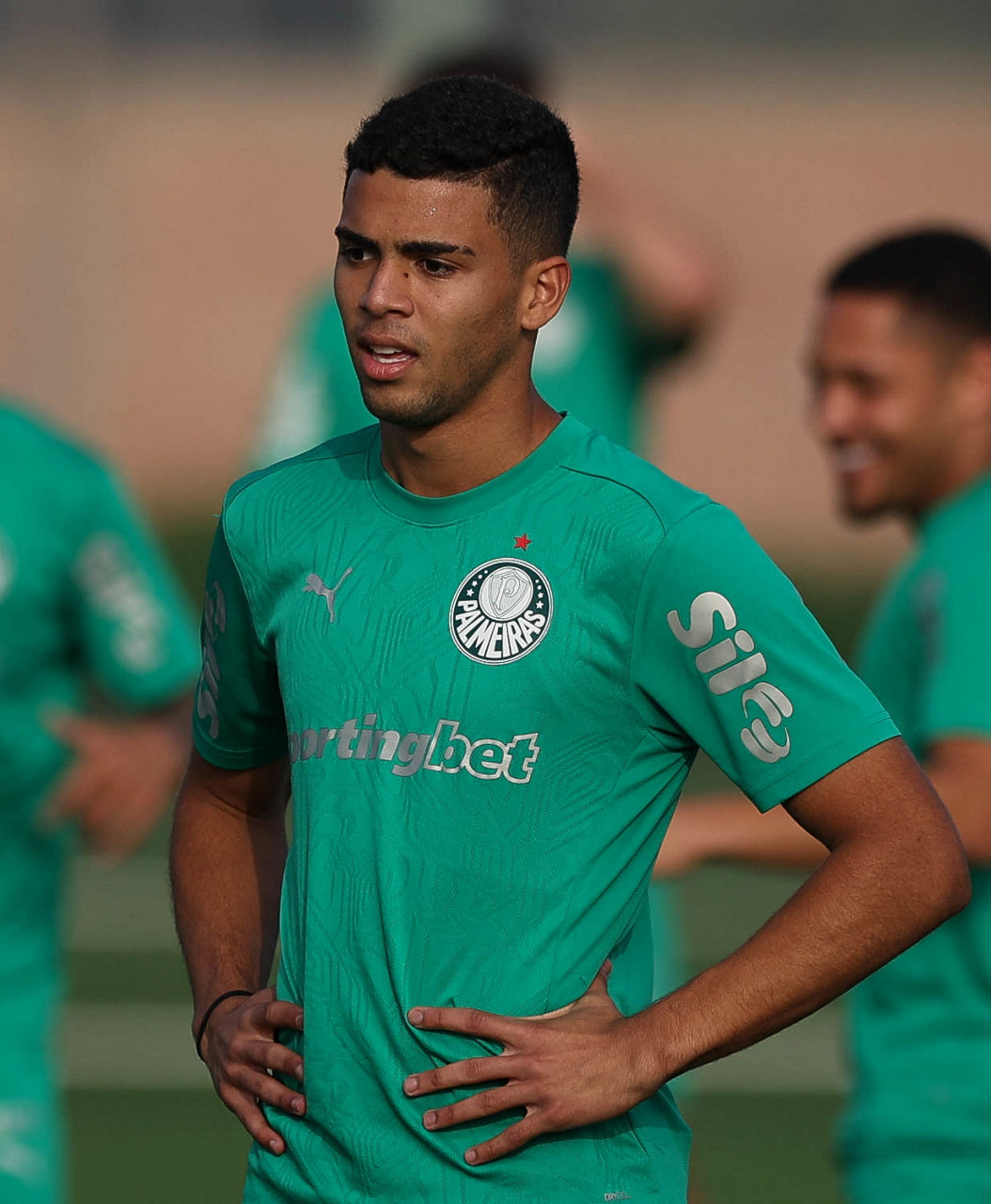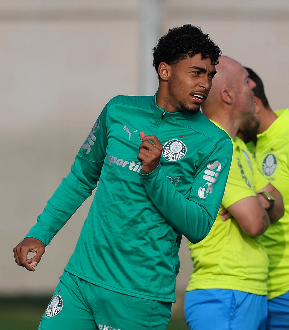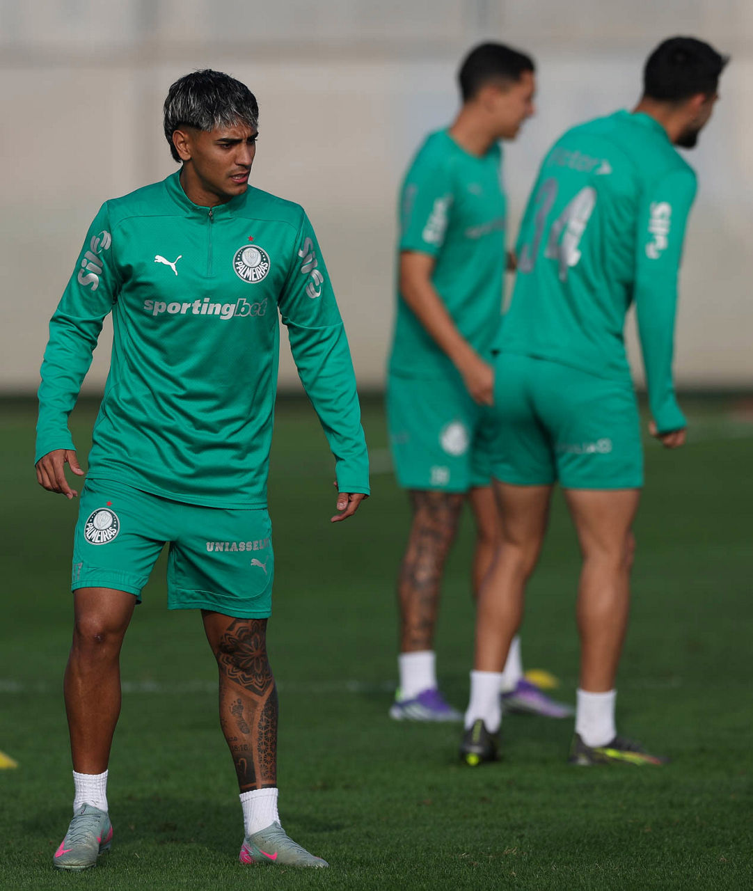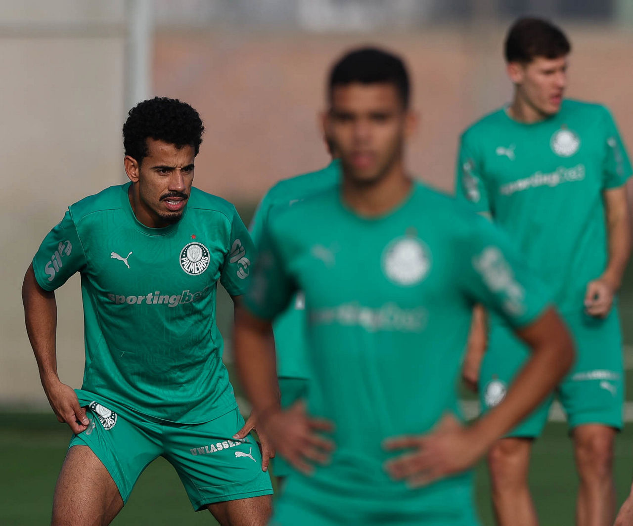Os jogadores Luighi, Benedetti e Murilo (E/D), da SE Palmeiras, durante treinamento, no CT do Alianza Lima. (Foto: Cesar Greco/Palmeiras/by Canon)