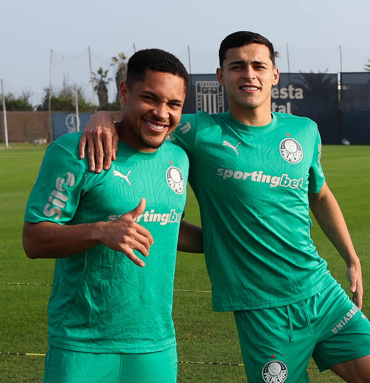 Os jogadores Vitor Roque e Ramón Sosa (D), da SE Palmeiras, durante treinamento, no CT do Alianza Lima. (Foto: Cesar Greco/Palmeiras/by Canon)
