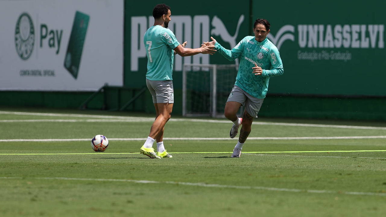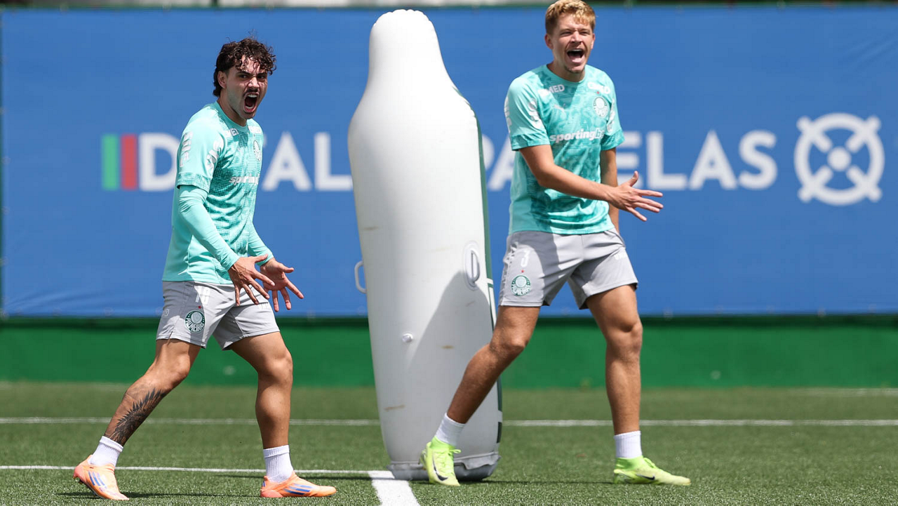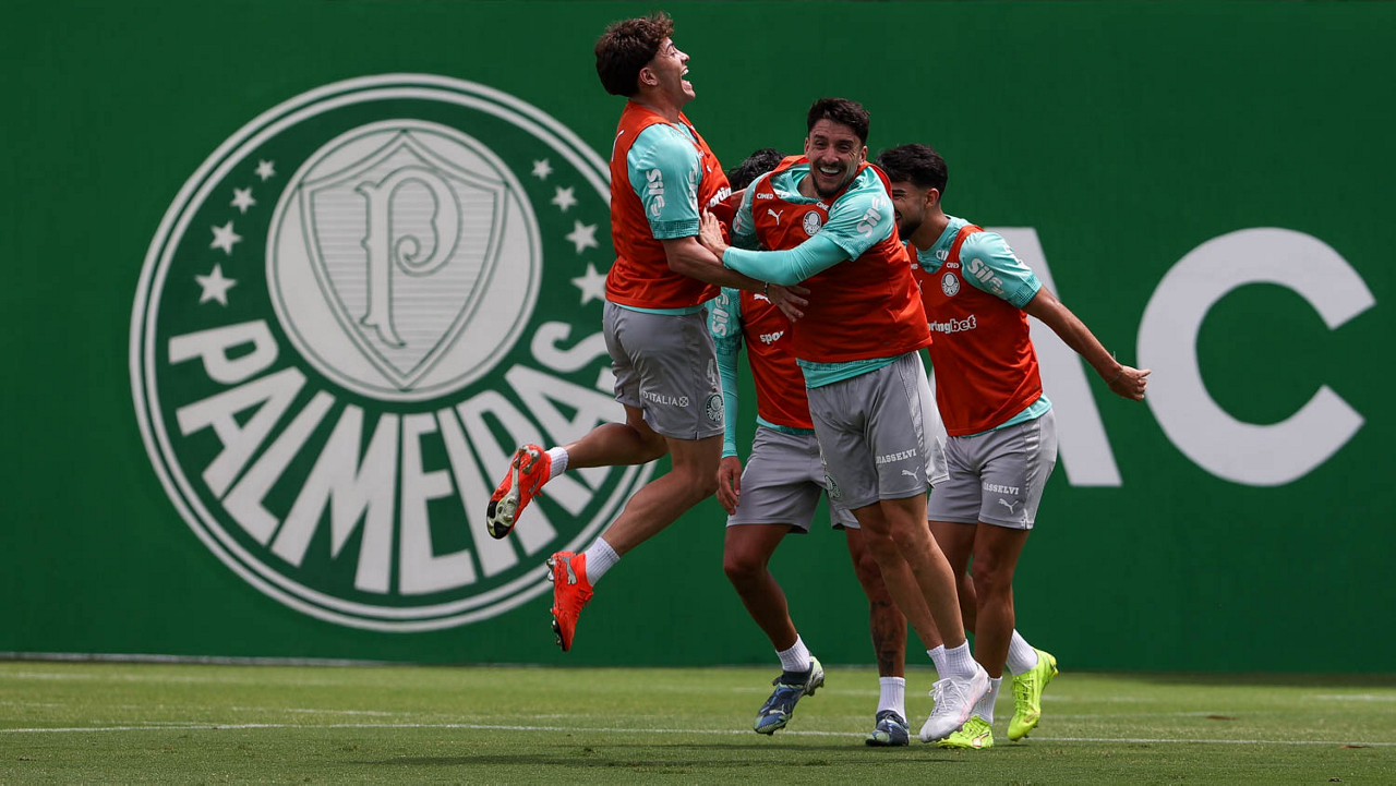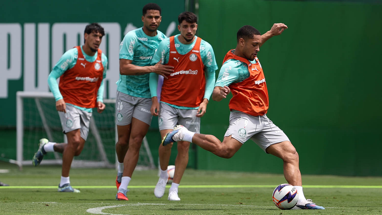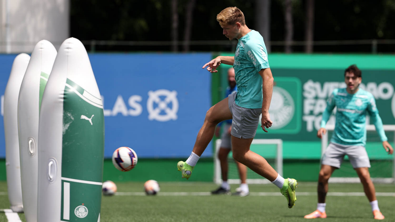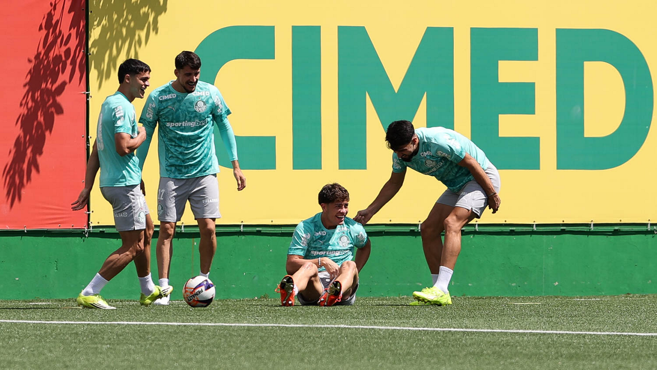 Os jogadores Sá, Larson, Carlos Miguel, Gustavo Gómez e Luighi (E/D em pé) e Vitor Roque, Arthur, Joaquín Piquerez, Ramón Sosa, Agustín Giay, Flaco López, Emiliano Martínez e Jhon Arias (E/D agachados), da SE Palmeiras, durante treinamento, na Academia de Futebol. (Foto: Cesar Greco/Palmeiras/by Canon)