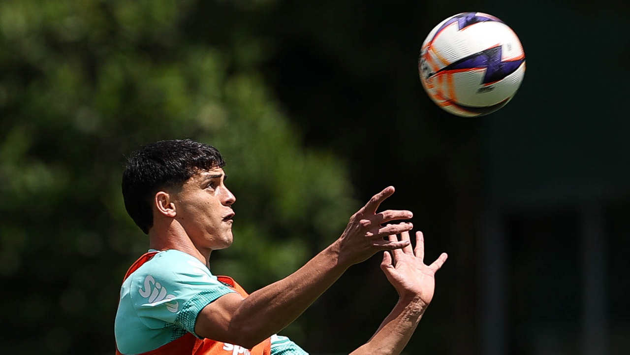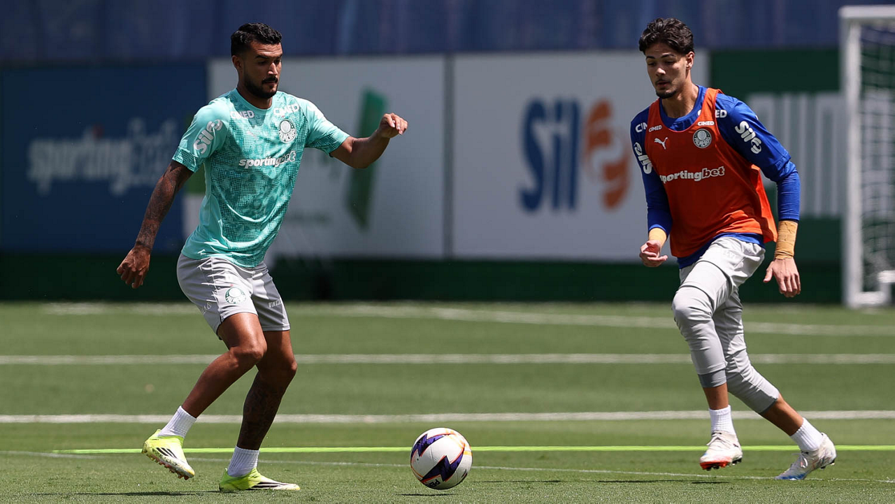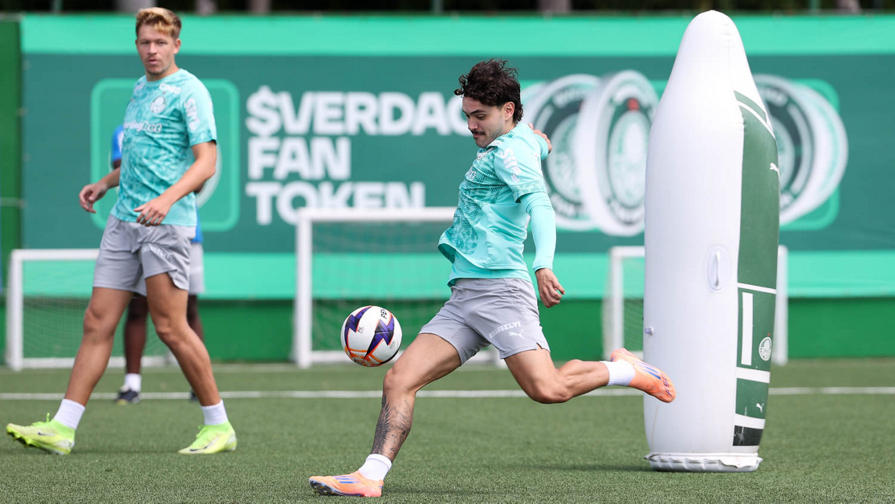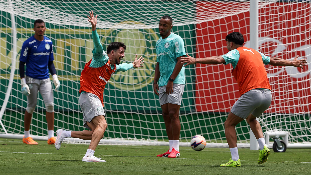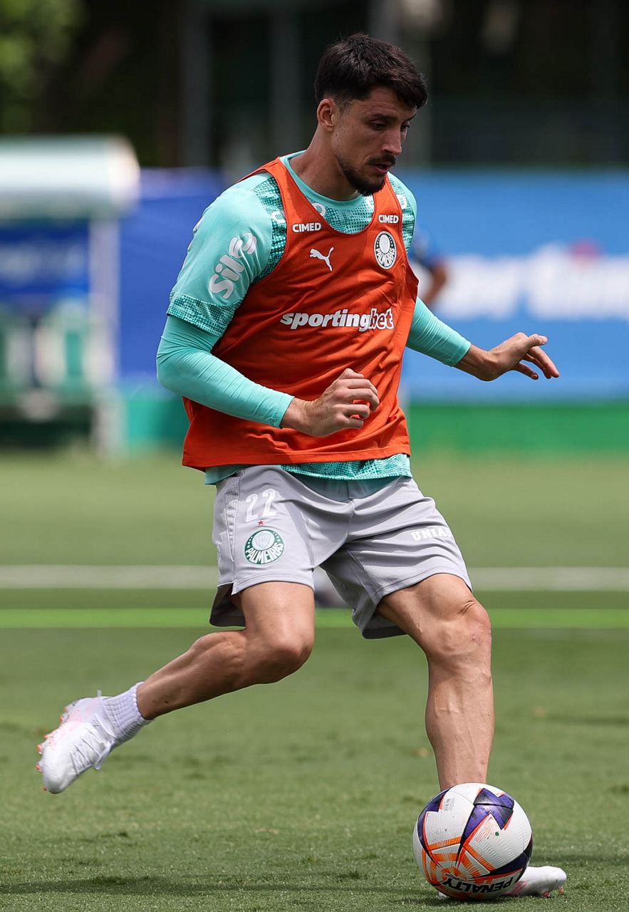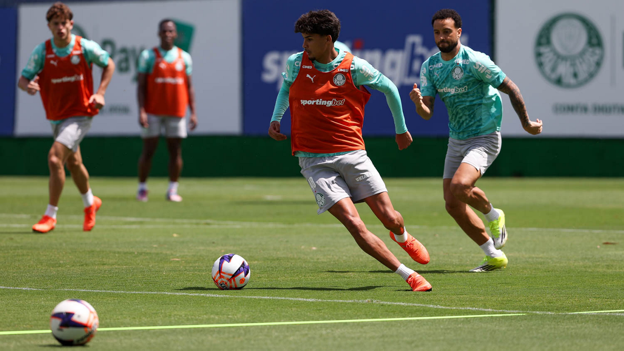 Os jogadores Sá, Larson, Carlos Miguel, Gustavo Gómez e Luighi (E/D em pé) e Vitor Roque, Arthur, Joaquín Piquerez, Ramón Sosa, Agustín Giay, Flaco López, Emiliano Martínez e Jhon Arias (E/D agachados), da SE Palmeiras, durante treinamento, na Academia de Futebol. (Foto: Cesar Greco/Palmeiras/by Canon)