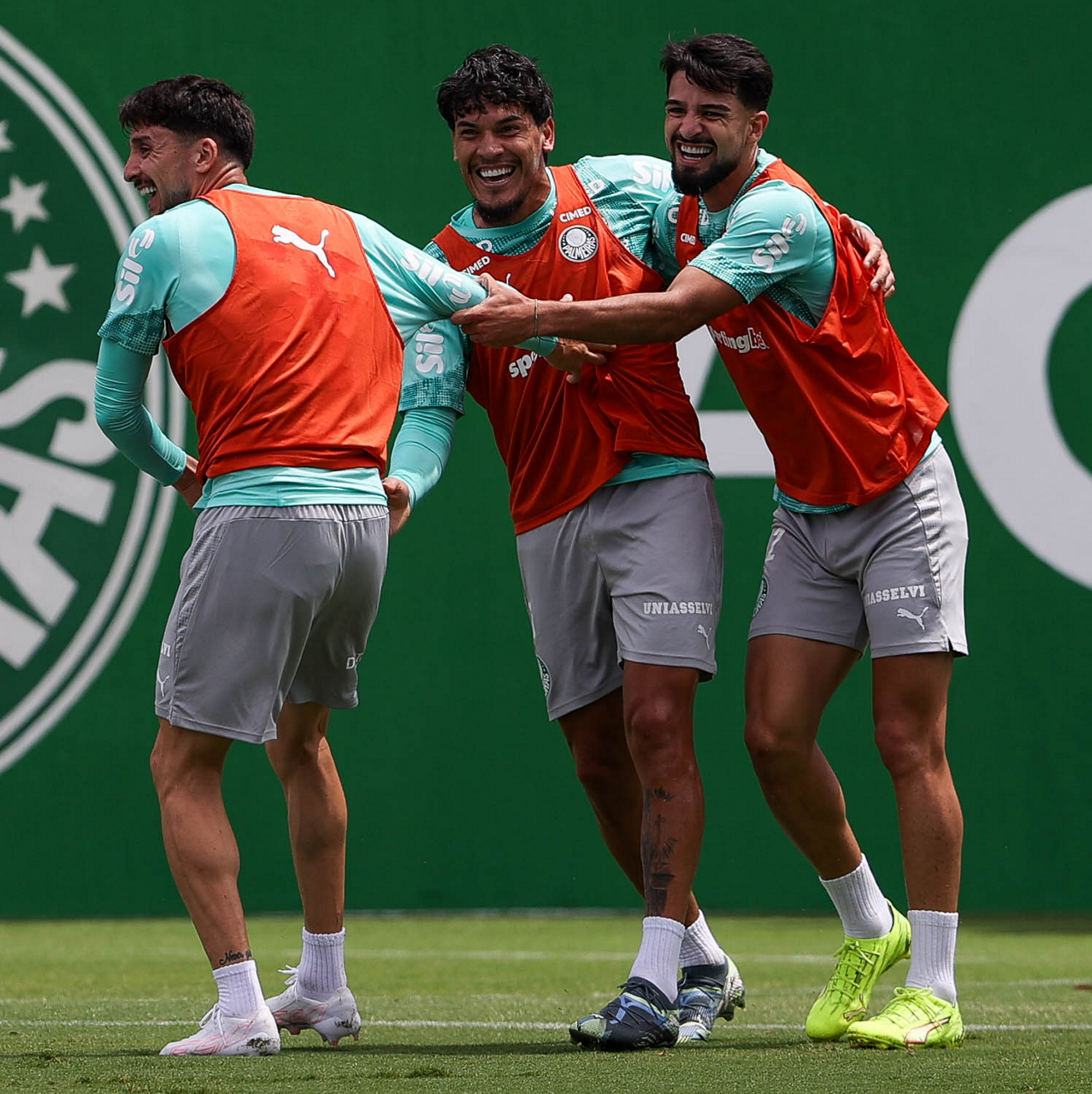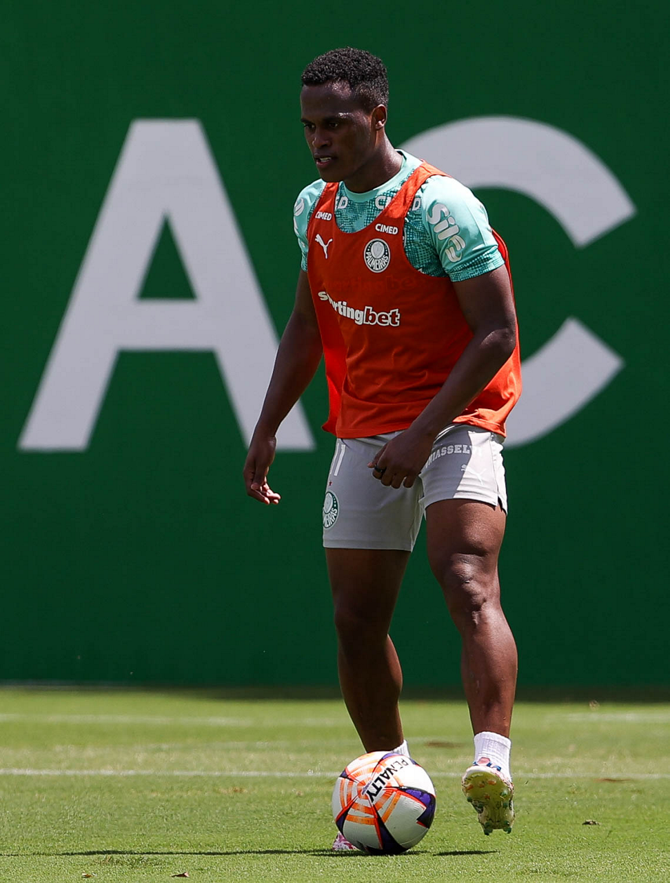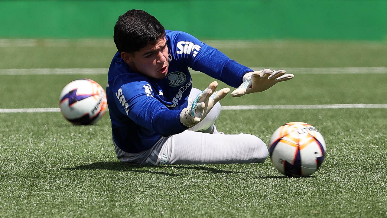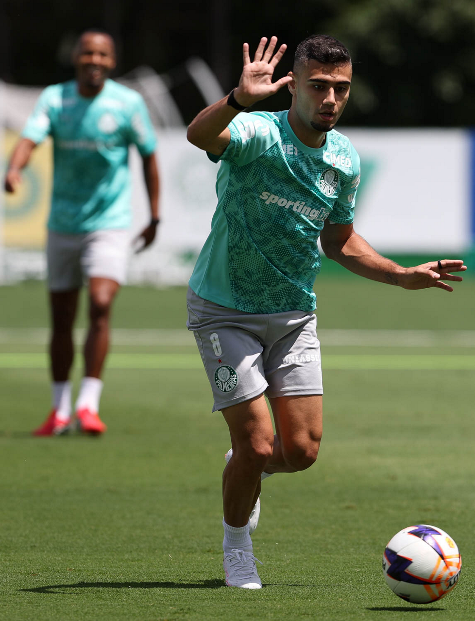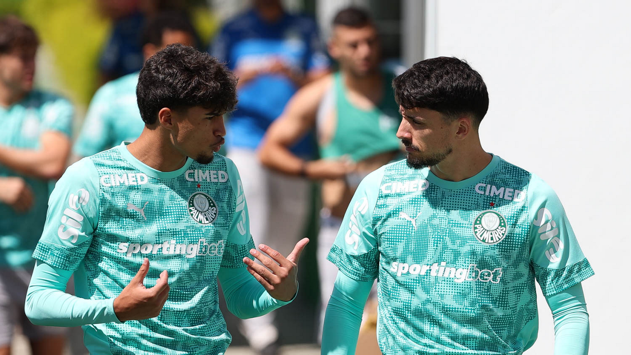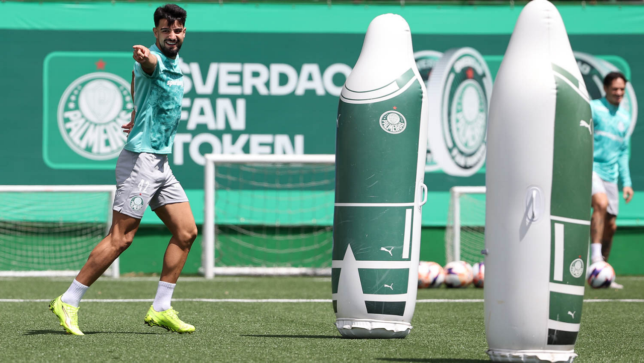 Os jogadores Sá, Larson, Carlos Miguel, Gustavo Gómez e Luighi (E/D em pé) e Vitor Roque, Arthur, Joaquín Piquerez, Ramón Sosa, Agustín Giay, Flaco López, Emiliano Martínez e Jhon Arias (E/D agachados), da SE Palmeiras, durante treinamento, na Academia de Futebol. (Foto: Cesar Greco/Palmeiras/by Canon)