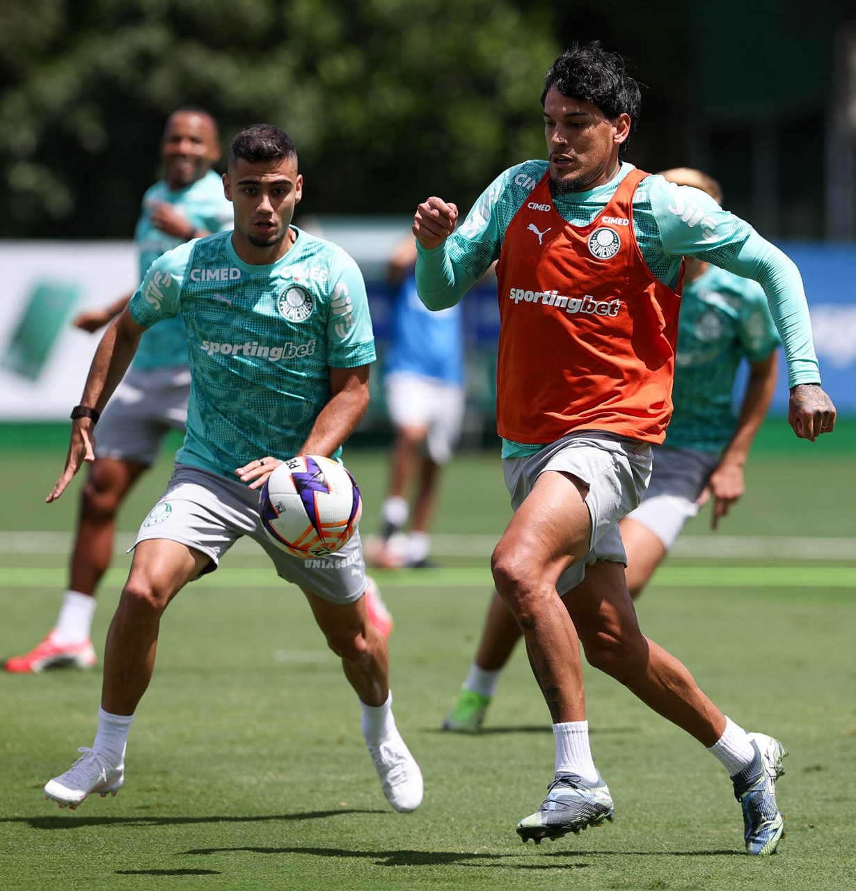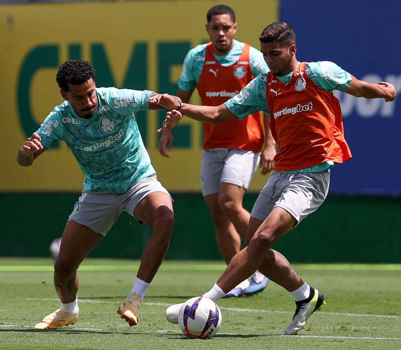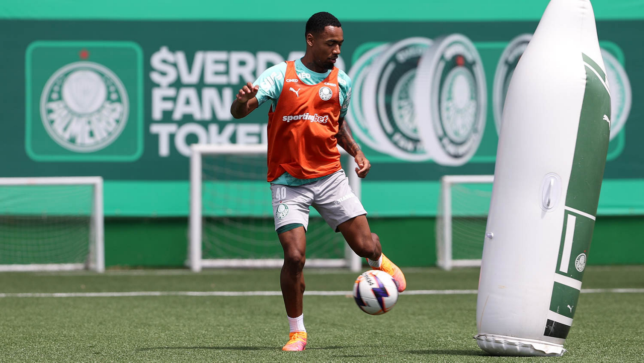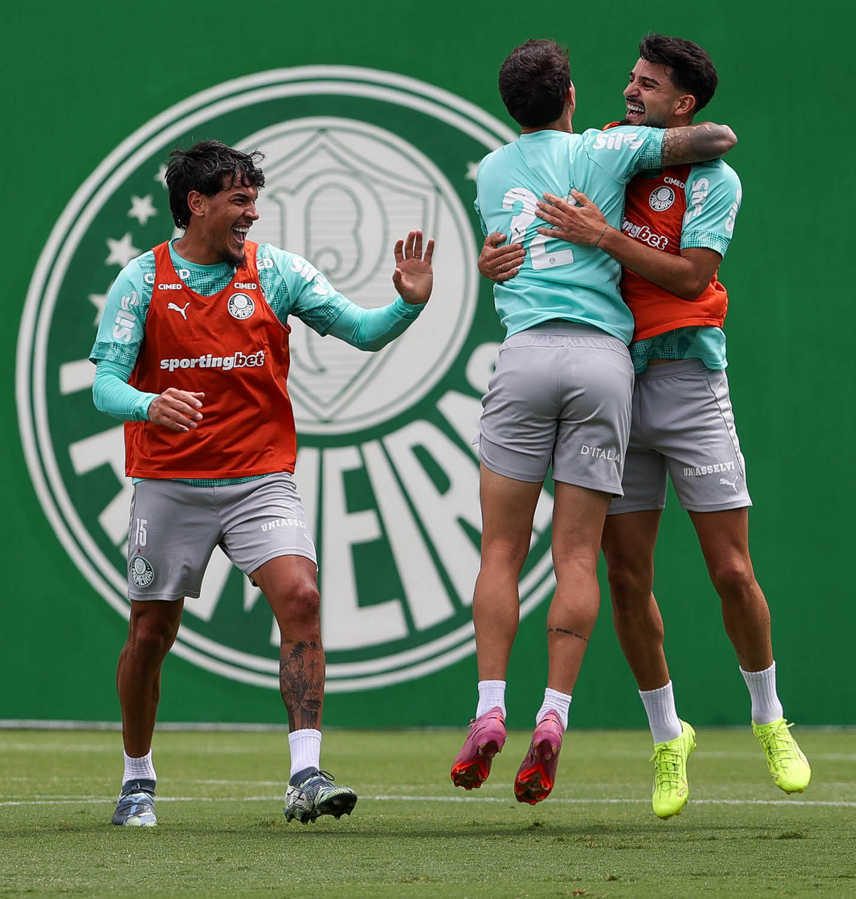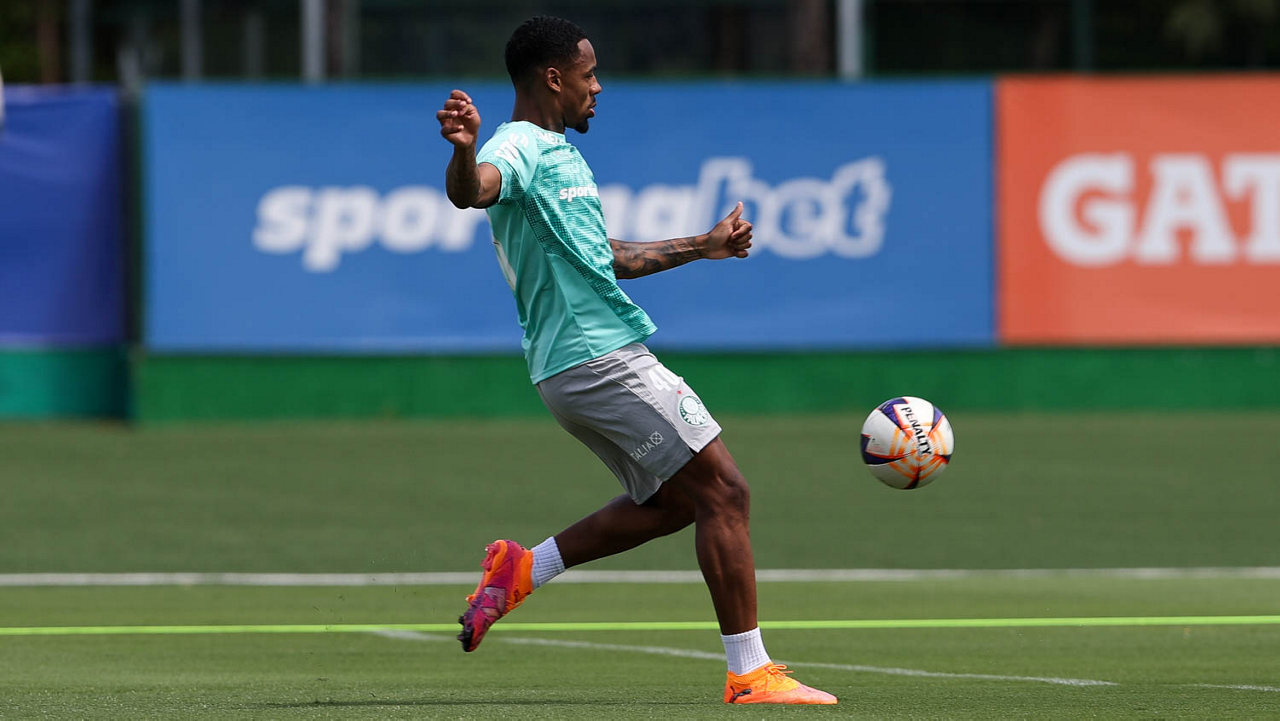 Os jogadores Sá, Larson, Carlos Miguel, Gustavo Gómez e Luighi (E/D em pé) e Vitor Roque, Arthur, Joaquín Piquerez, Ramón Sosa, Agustín Giay, Flaco López, Emiliano Martínez e Jhon Arias (E/D agachados), da SE Palmeiras, durante treinamento, na Academia de Futebol. (Foto: Cesar Greco/Palmeiras/by Canon)