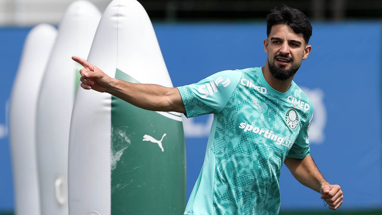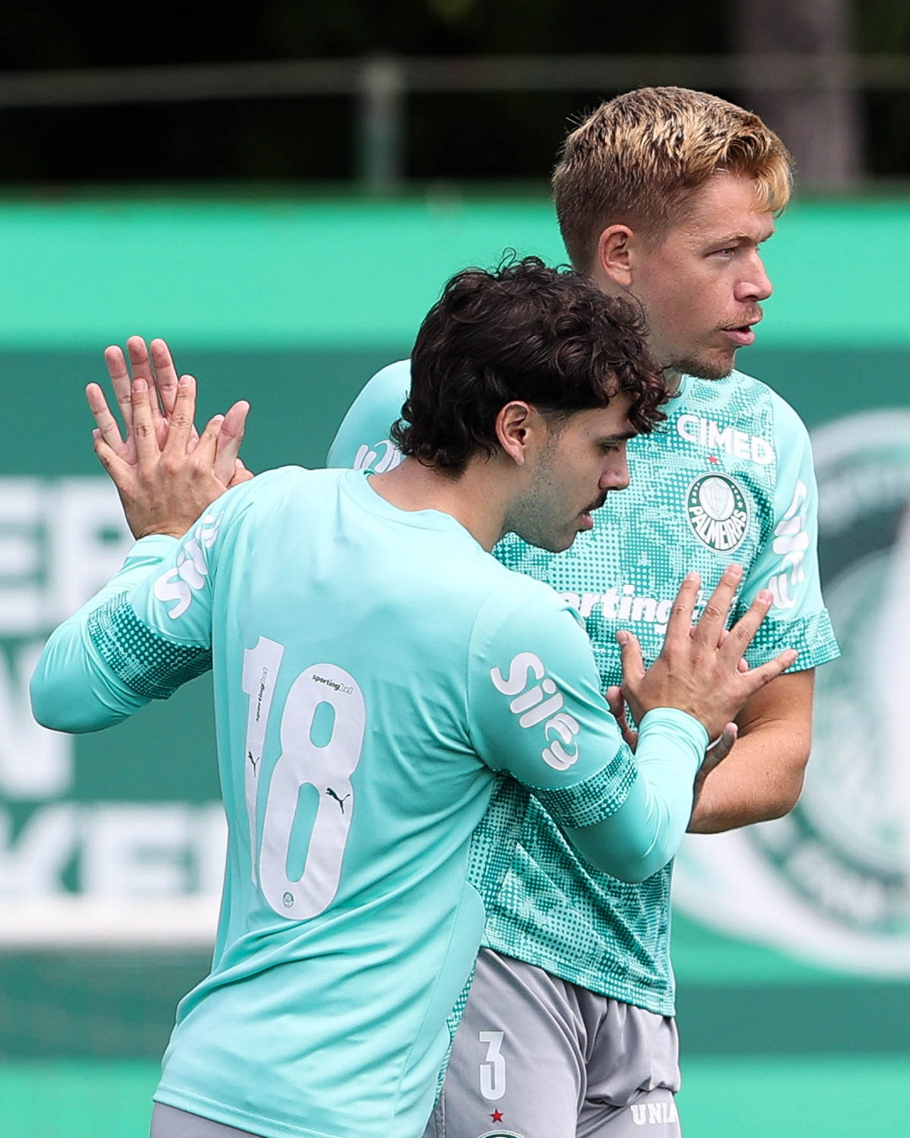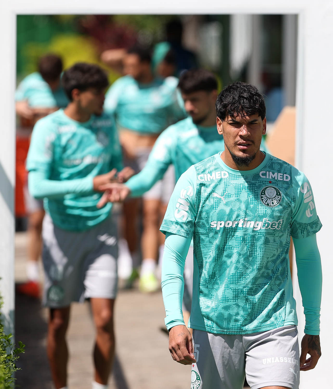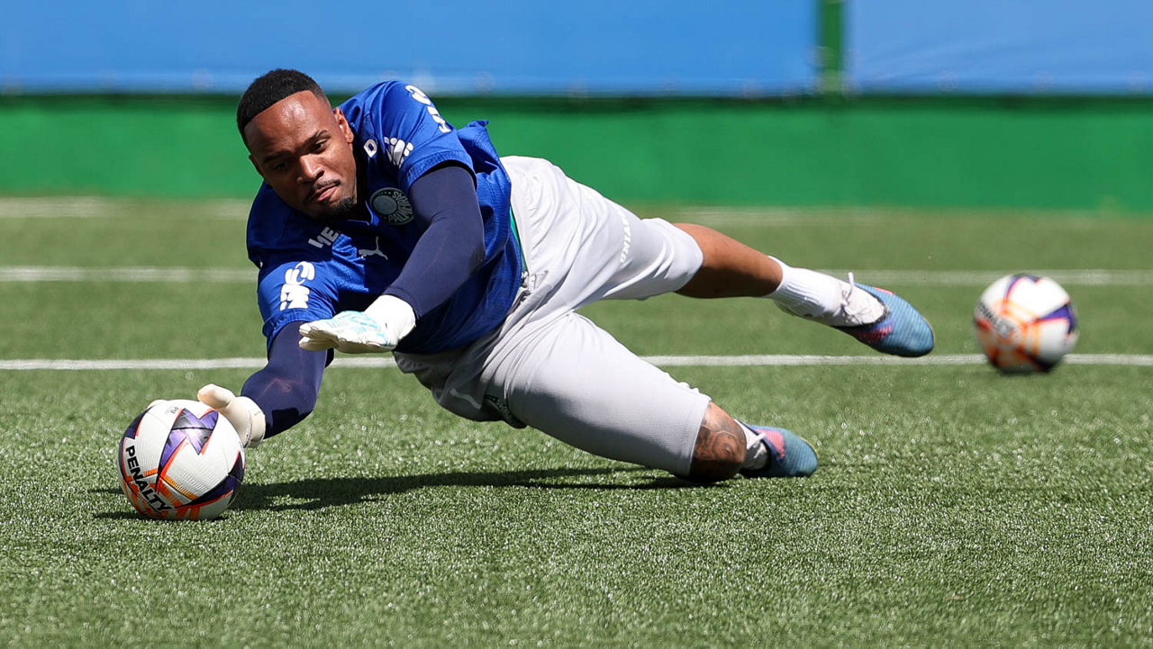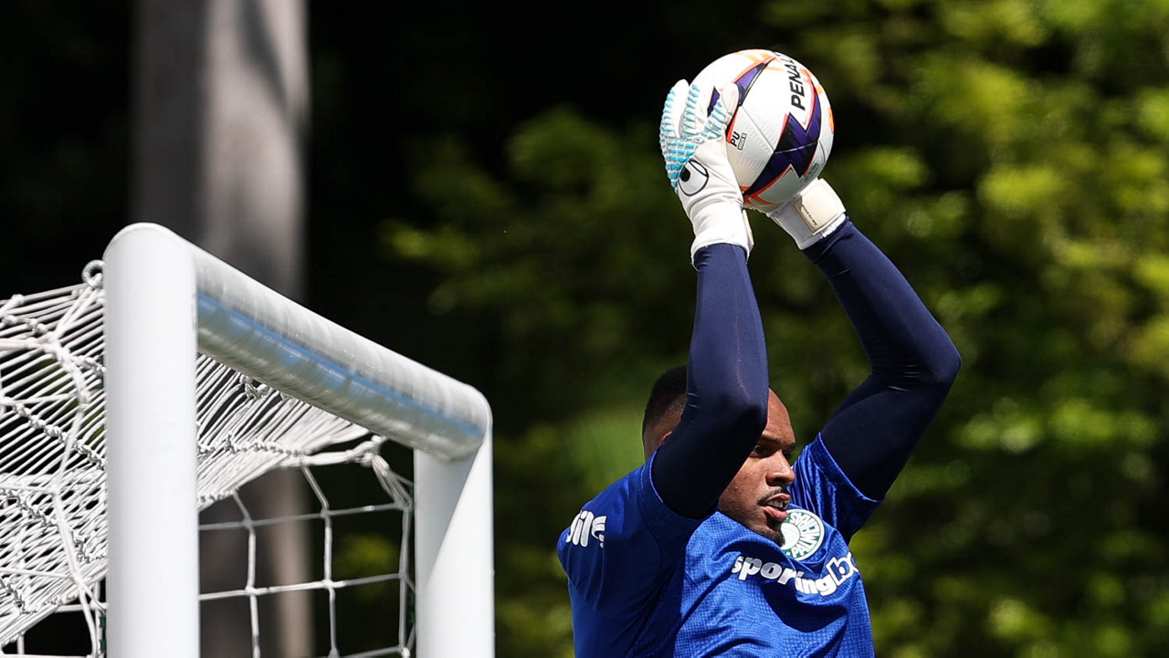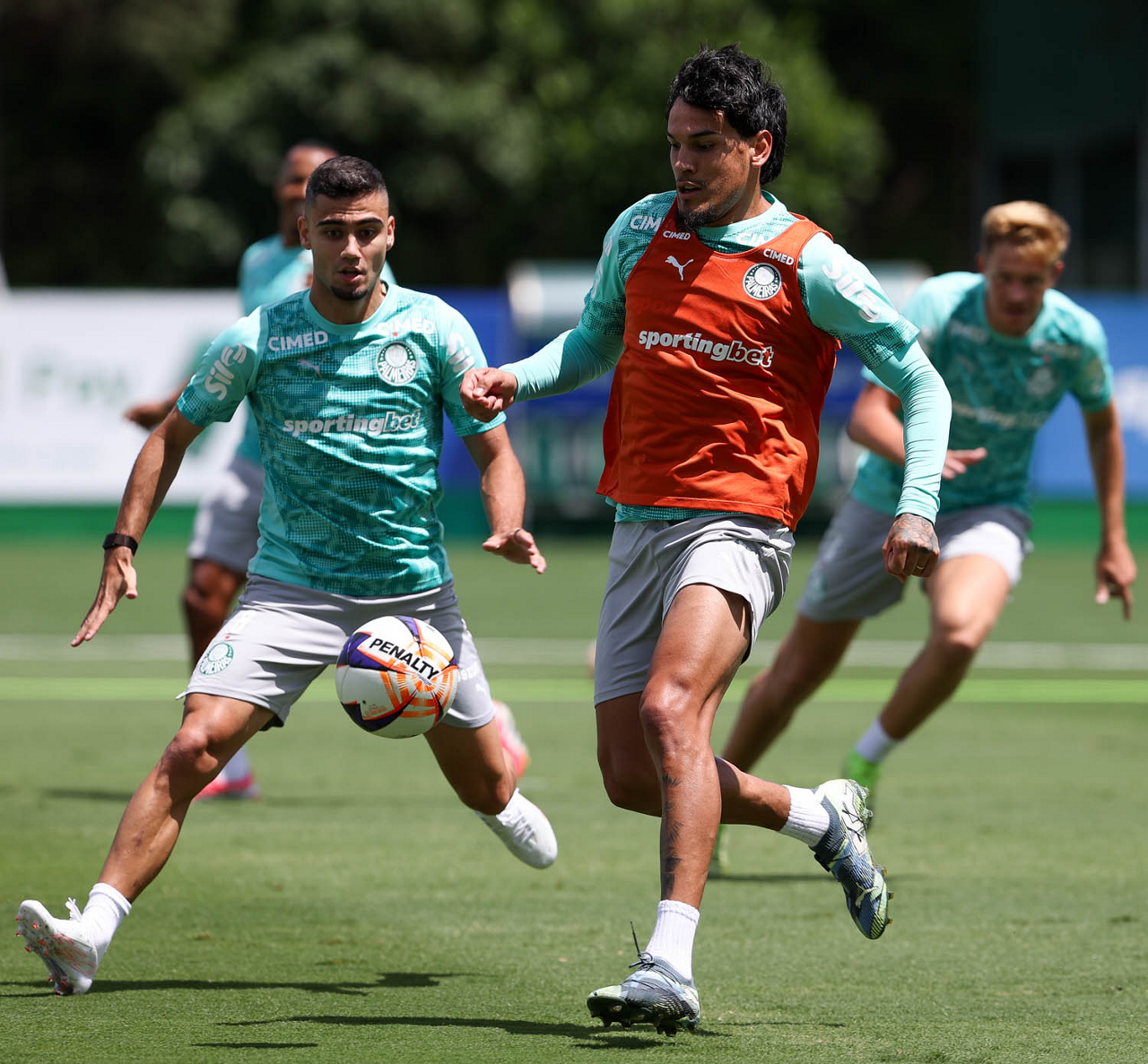 Os jogadores Sá, Larson, Carlos Miguel, Gustavo Gómez e Luighi (E/D em pé) e Vitor Roque, Arthur, Joaquín Piquerez, Ramón Sosa, Agustín Giay, Flaco López, Emiliano Martínez e Jhon Arias (E/D agachados), da SE Palmeiras, durante treinamento, na Academia de Futebol. (Foto: Cesar Greco/Palmeiras/by Canon)