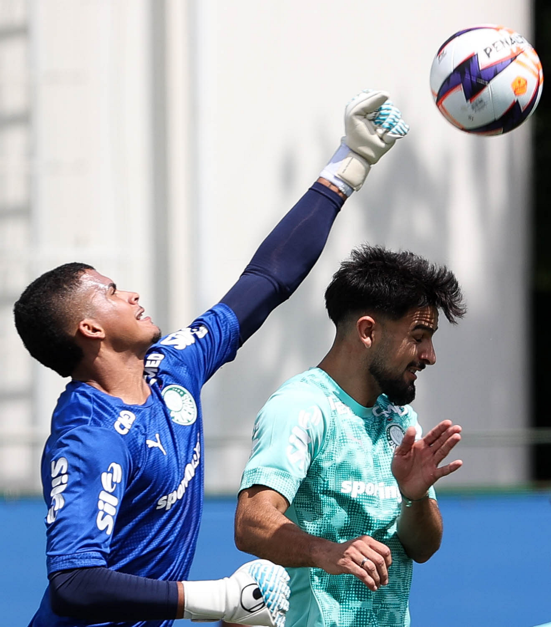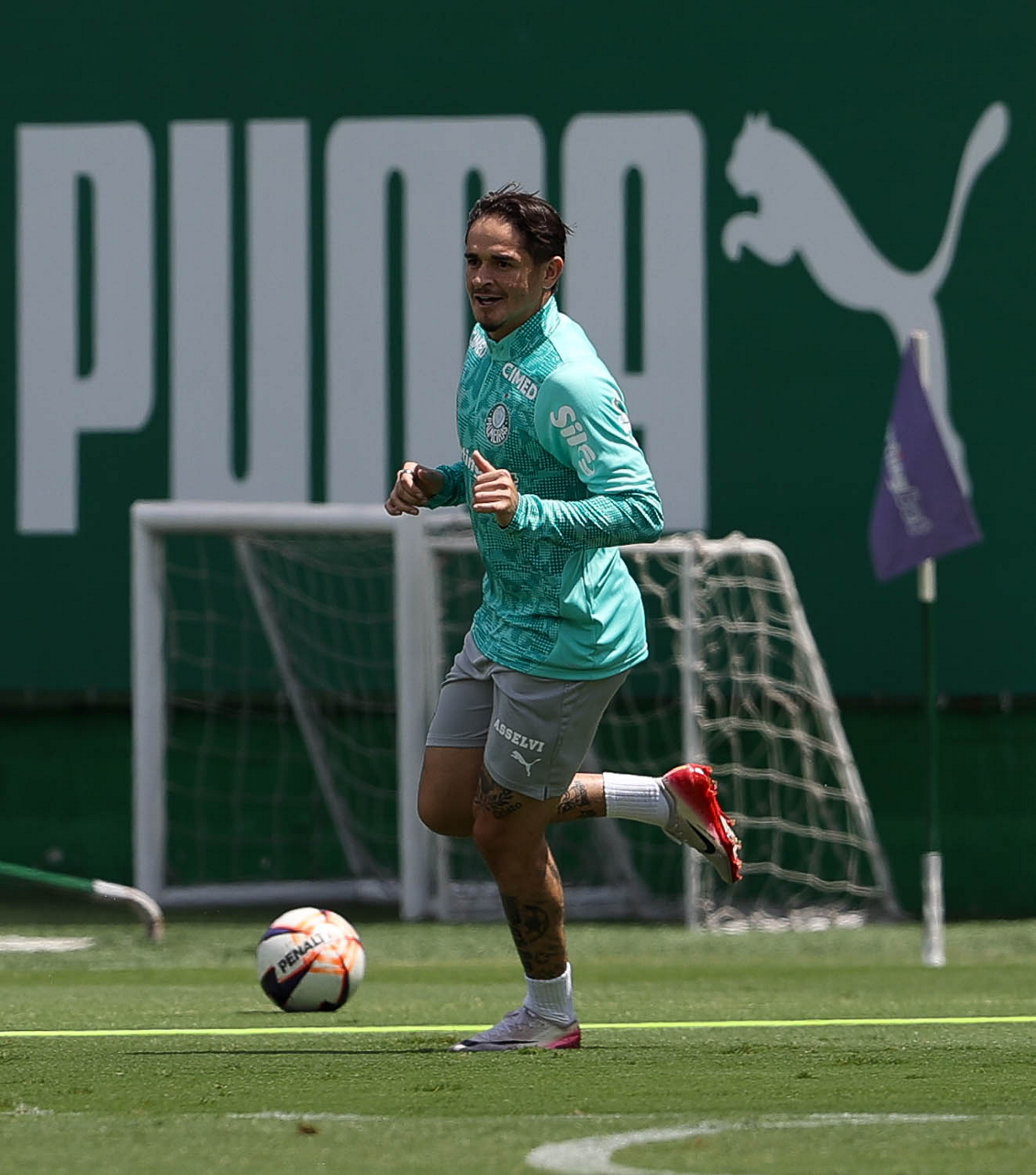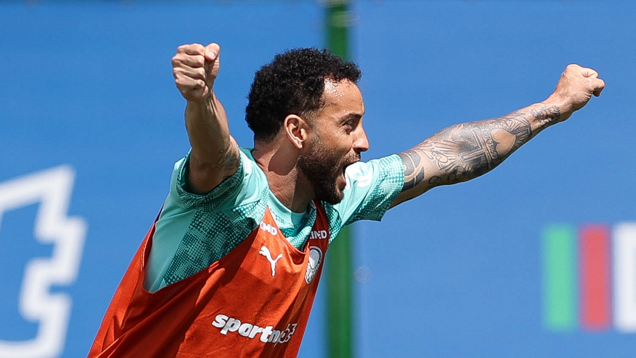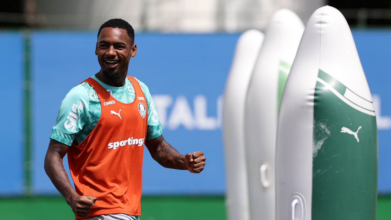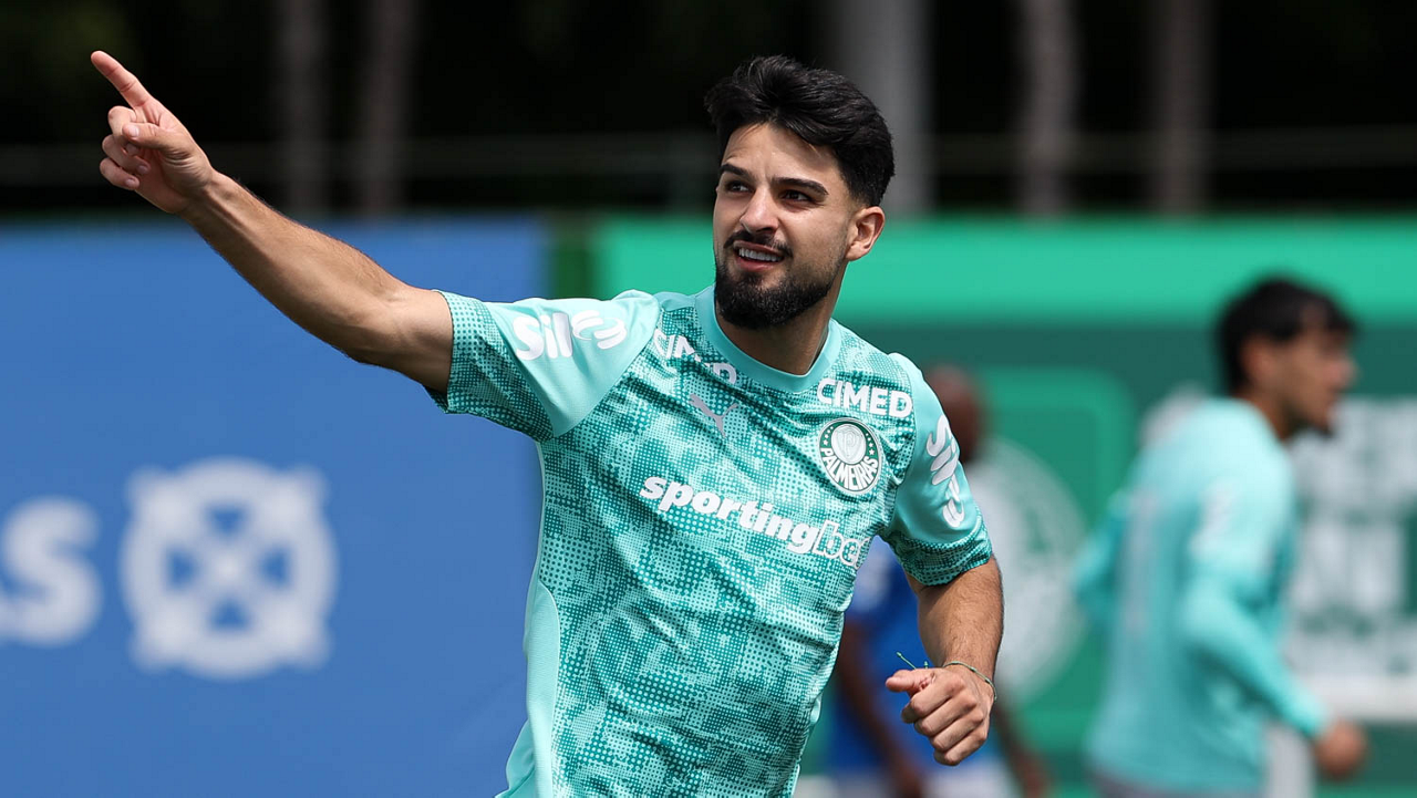 Os jogadores Sá, Larson, Carlos Miguel, Gustavo Gómez e Luighi (E/D em pé) e Vitor Roque, Arthur, Joaquín Piquerez, Ramón Sosa, Agustín Giay, Flaco López, Emiliano Martínez e Jhon Arias (E/D agachados), da SE Palmeiras, durante treinamento, na Academia de Futebol. (Foto: Cesar Greco/Palmeiras/by Canon)